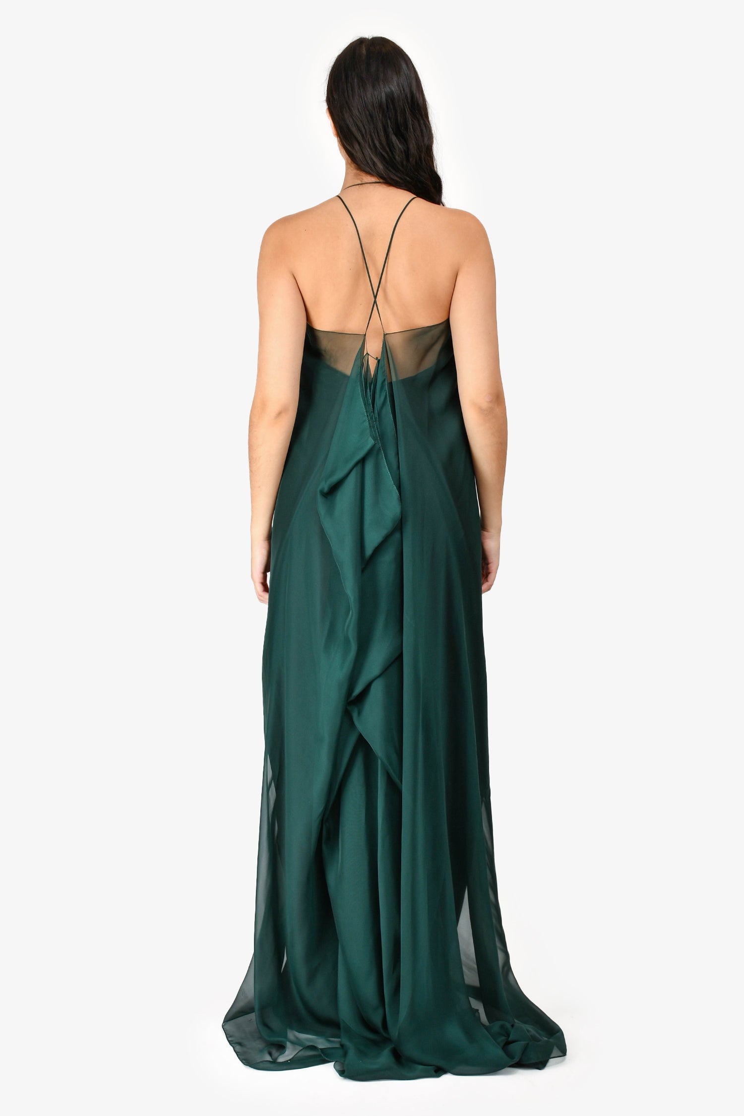 Refresh availabilityLarakhoury Green Spaghetti Strap Ruffle Back Layered Gown. Back zip-up closure. Attached black slip dress. Tonal stitching.