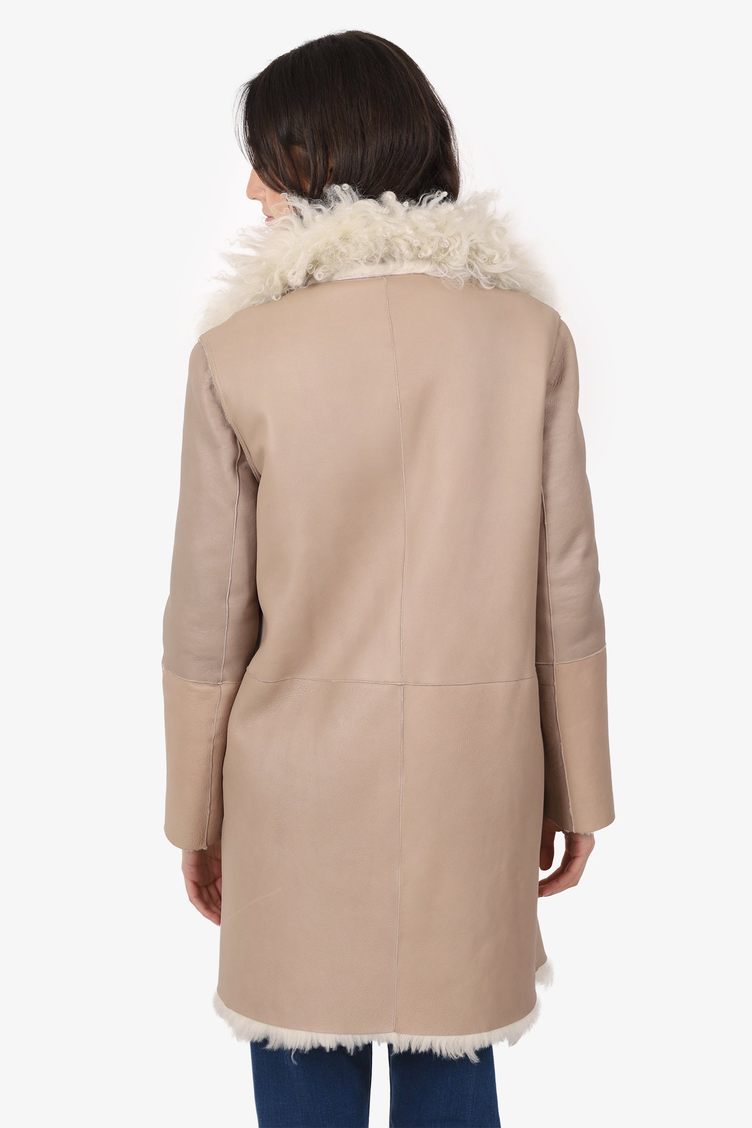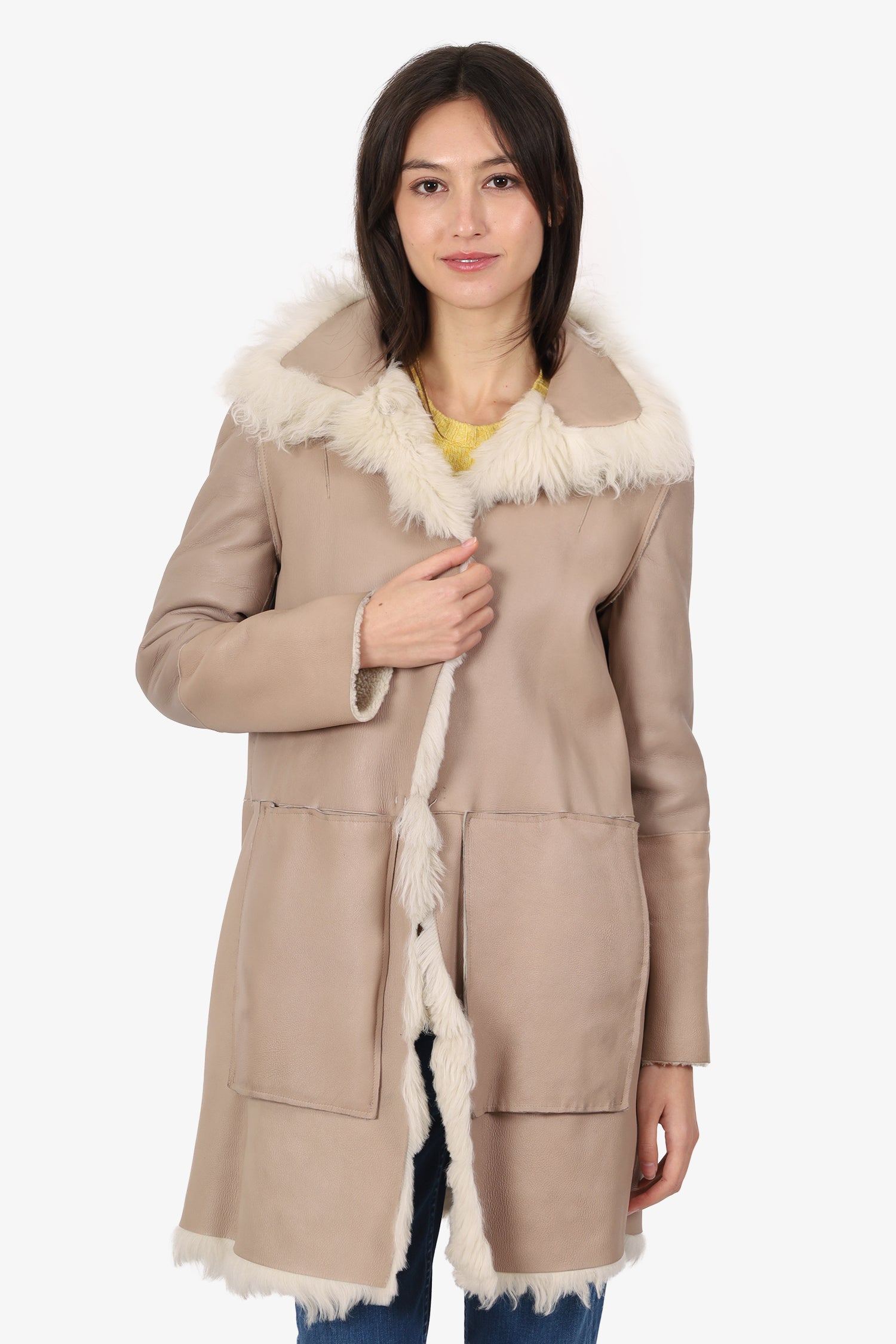 Refresh availabilityLeather/Shearling Reversible Coat. Pull-on. Collared neckline. Front snap-button-up closure. 4 exterior slip pockets; 2 on either reversible side. Gunmetal-tone hardware. Tonal stitching.