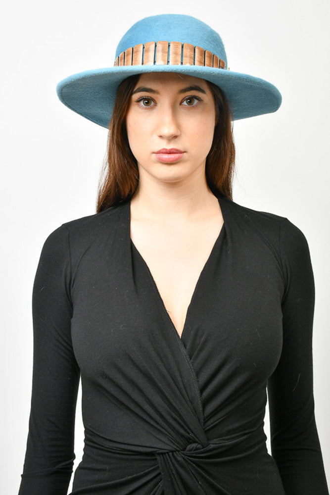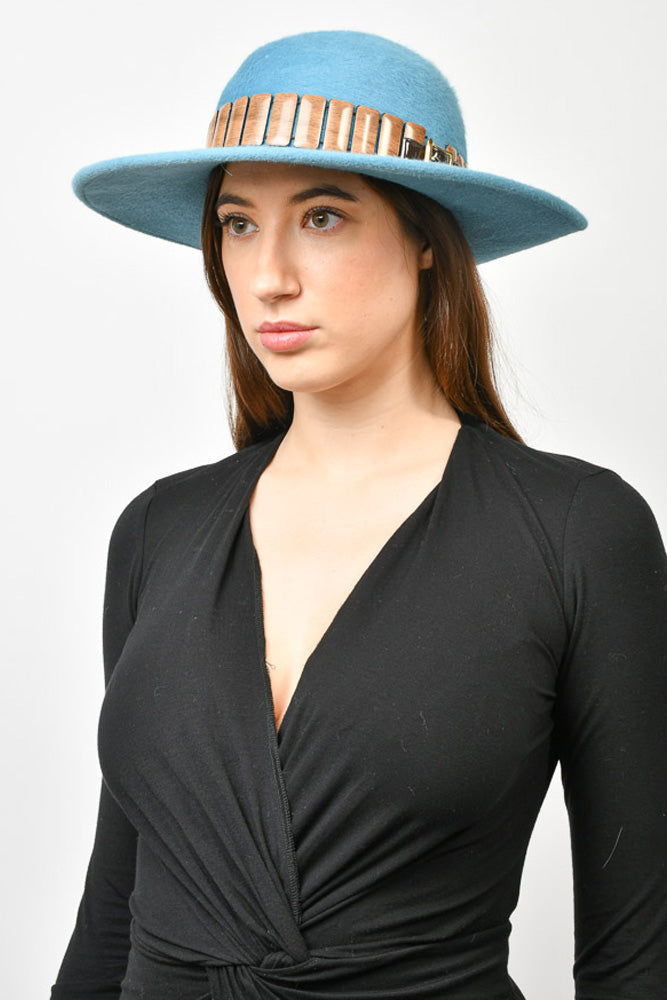 Refresh availabilityLilliput Hats Blue Wool Fedora. Buckle detail around edge. Unlined. Gold-tone hardware. Tonal stitching.