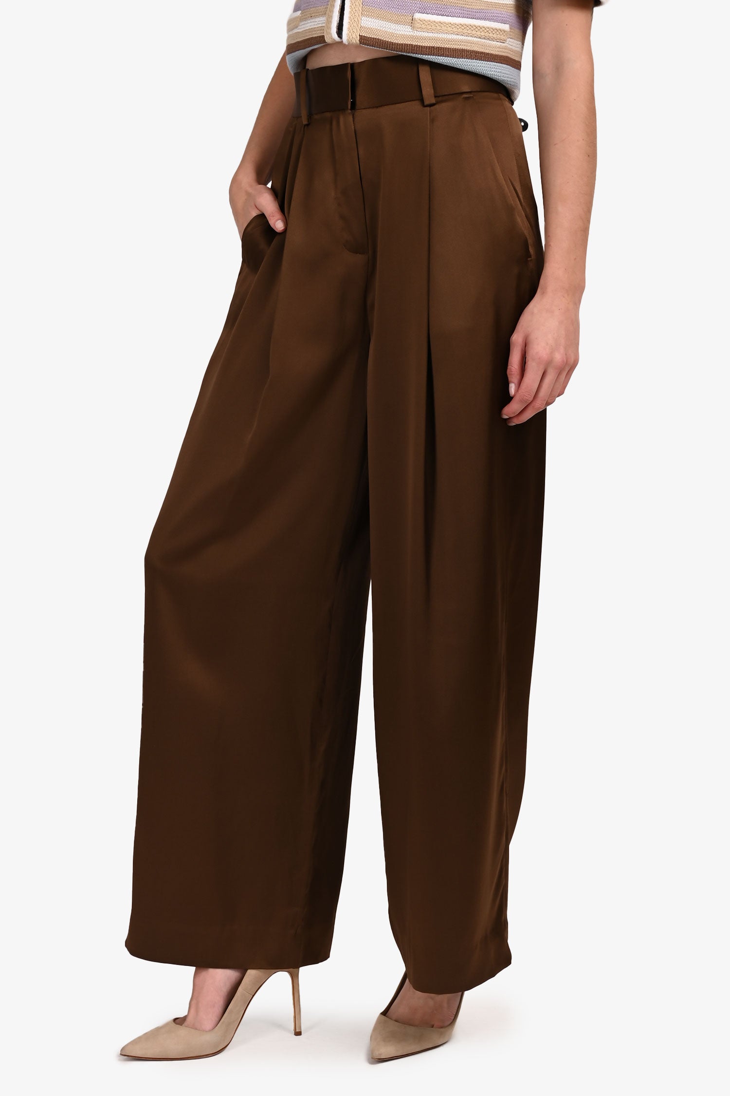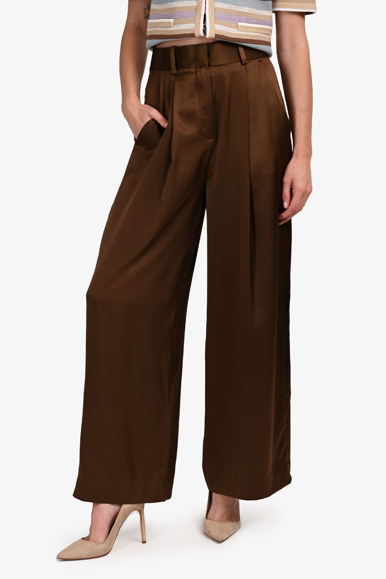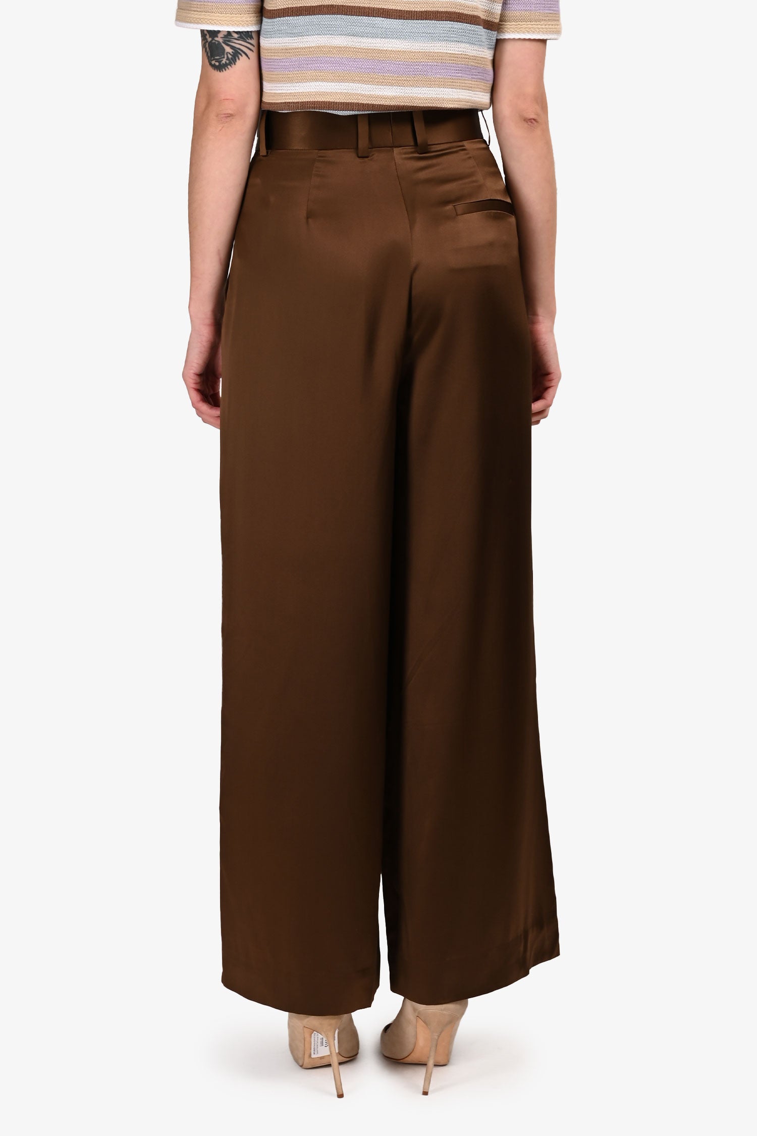 Refresh availabilityLilysilk Brown Silk Wide Leg Pants. Front zipper with clasp closure. Waistband with belt loops. 2 front slip pockets. 1 rear faux pocket. Silver-tone hardware. Tonal stitching.