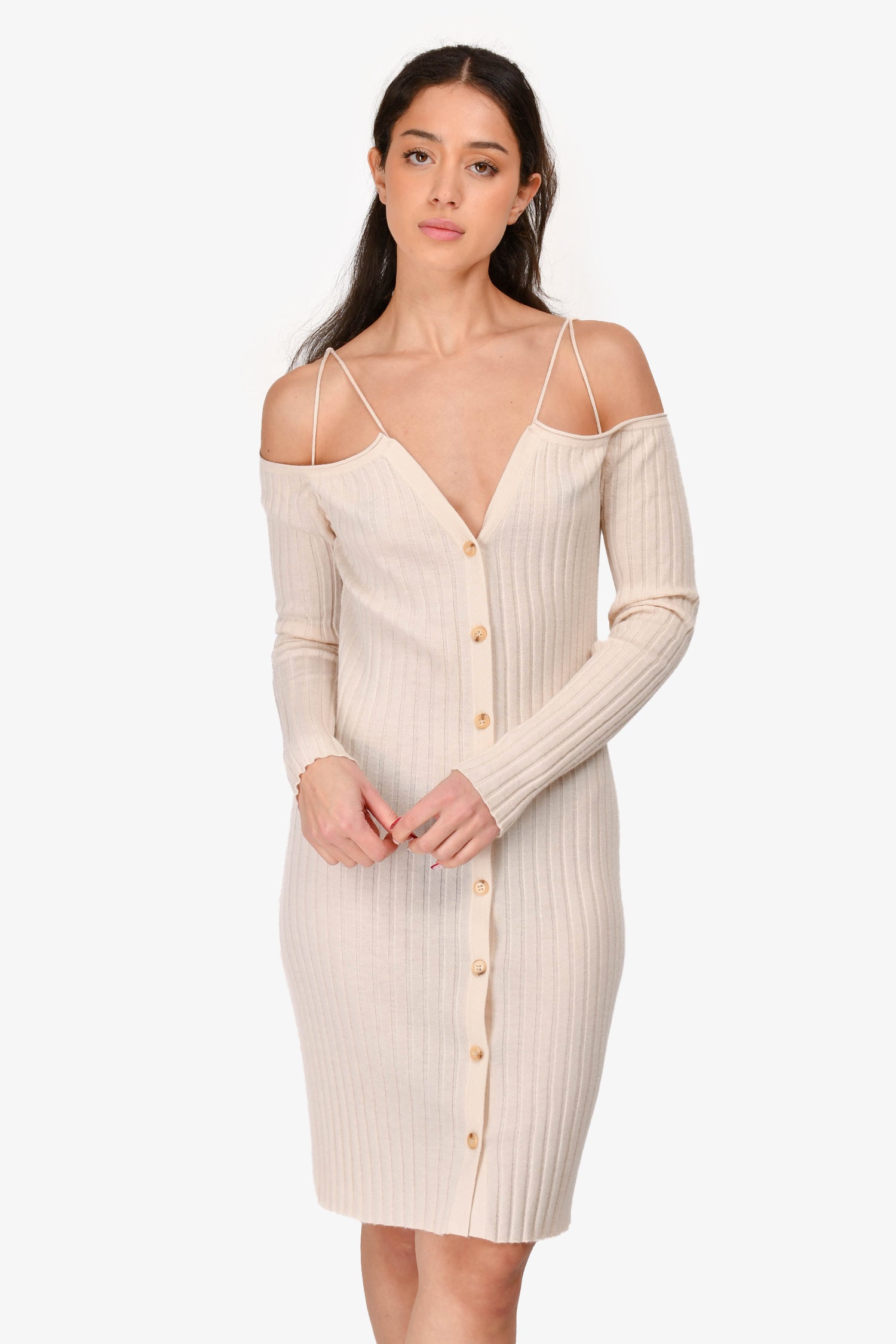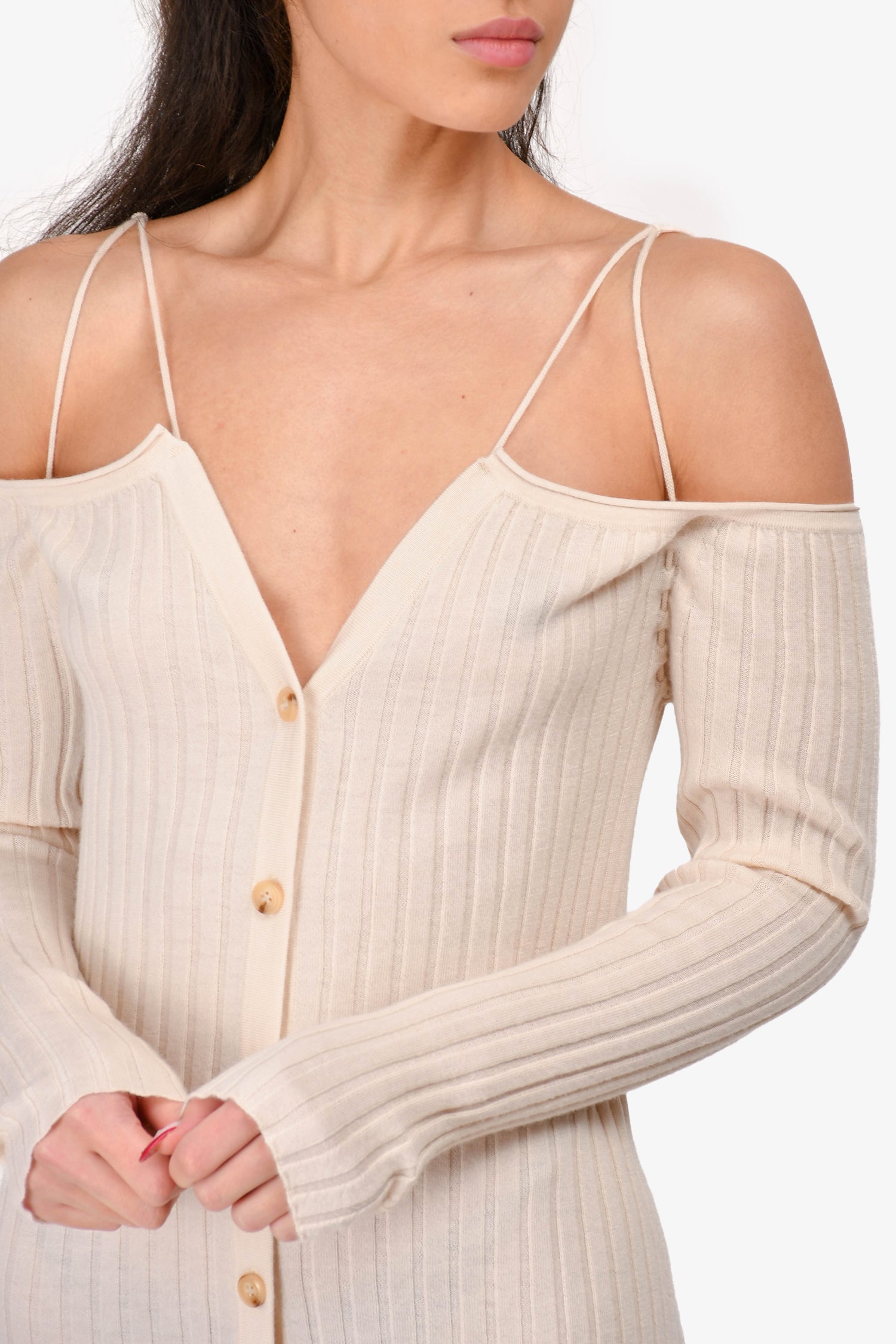 Refresh availabilityLisa Yang Cream Cashmere Ribbed Knit Long Cardigan. Off-shoulder. Front button-up closure. Tonal hardware. Tonal stitching.