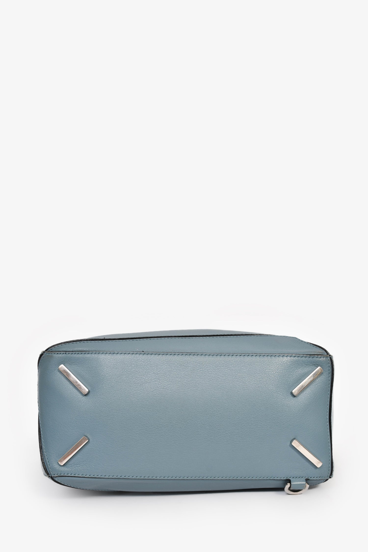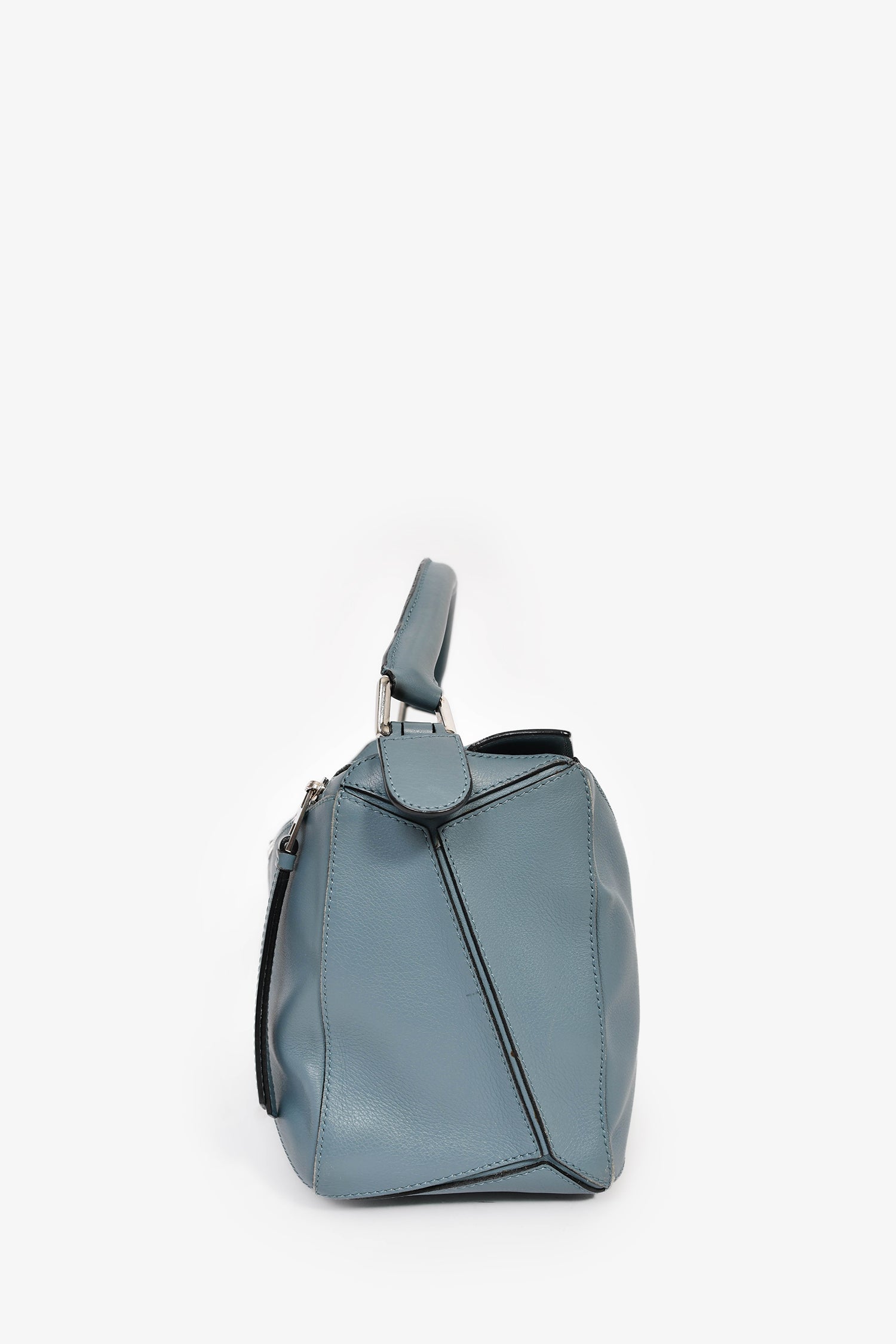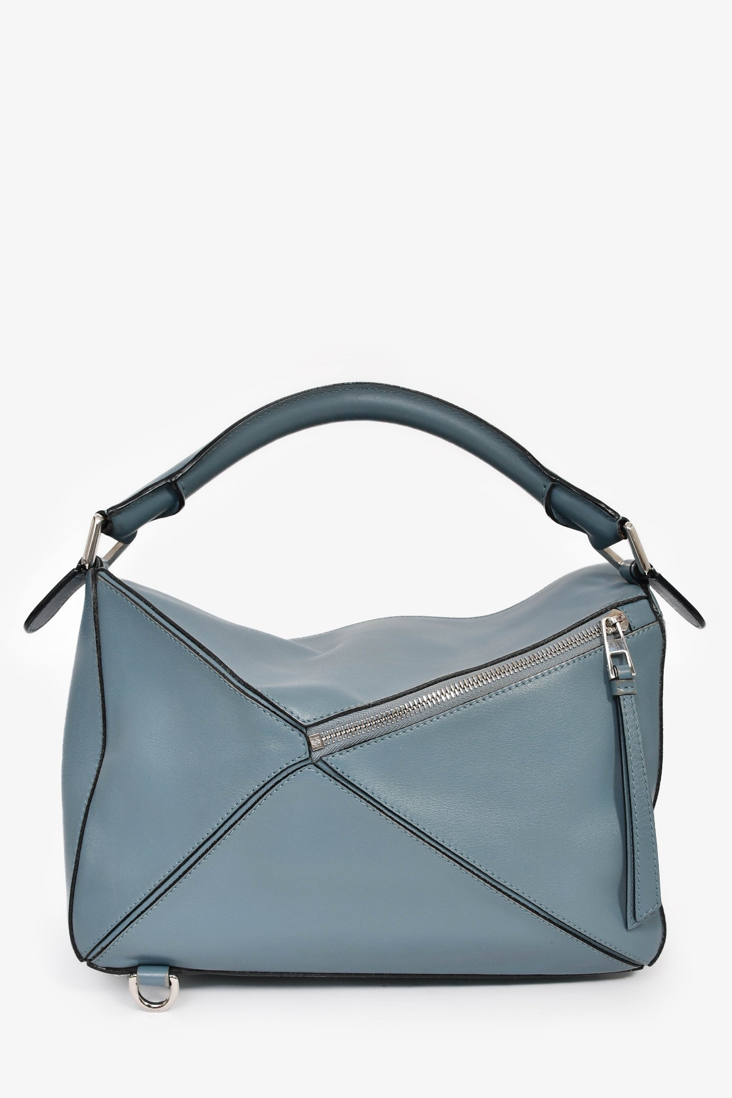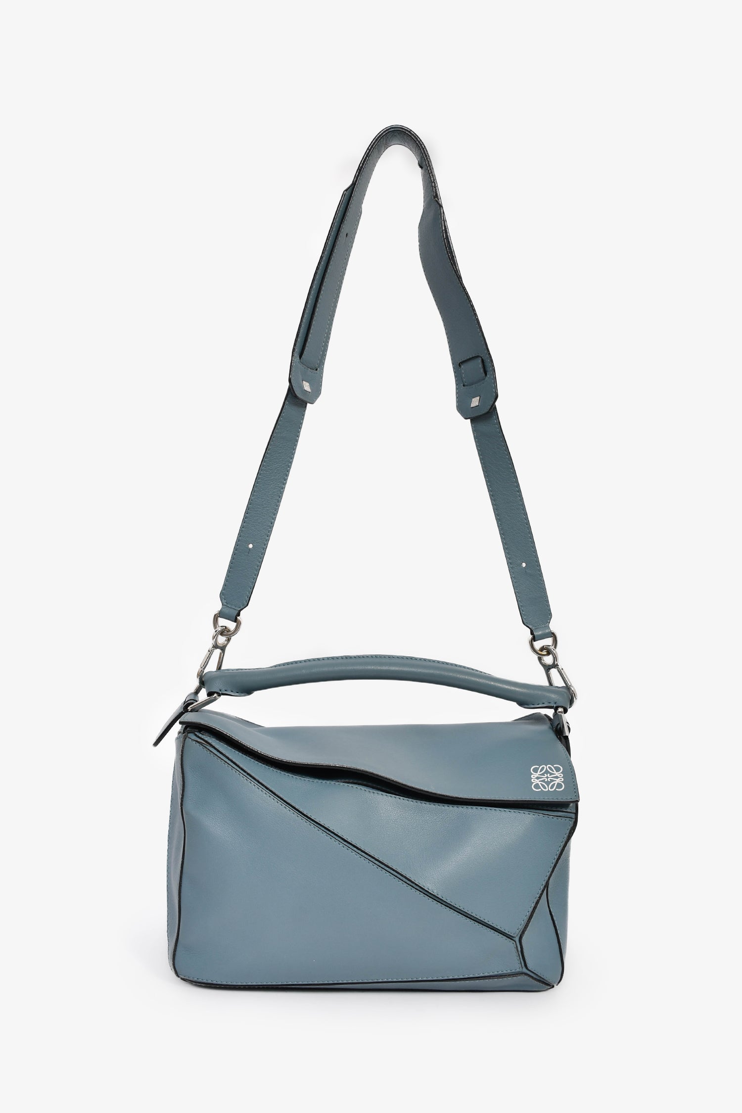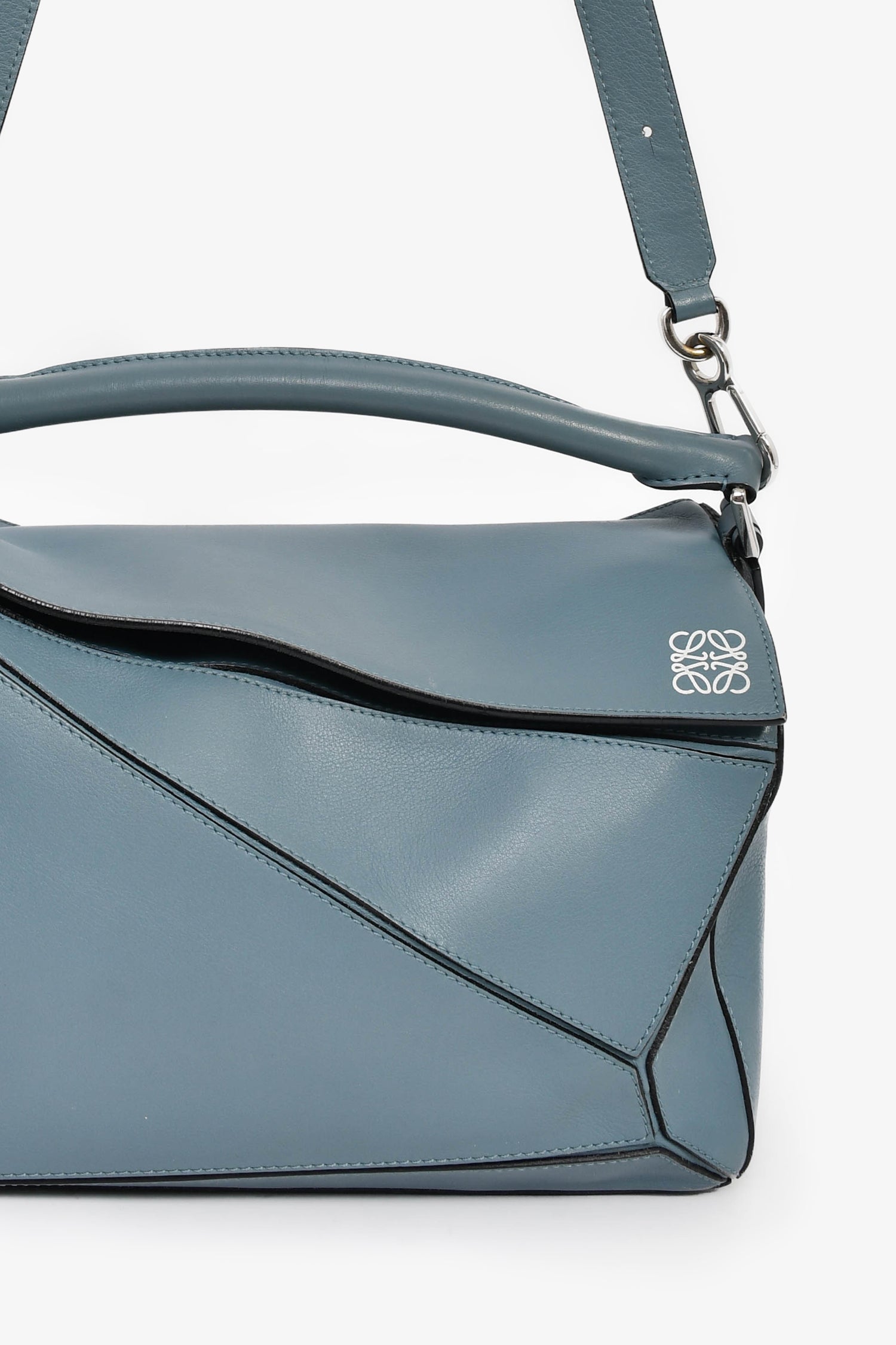 Refresh availabilityLoewe 2015 Blue Leather Large Puzzle Bag With Strap. Top fold-over flap with zip closure. Top handle. Detachable and adjustable strap. Protective base studs. Single exterior zip pocket. Textile-lined interior. Single interior wall slip pocket. Silver-tone hardware. Tonal stitching.