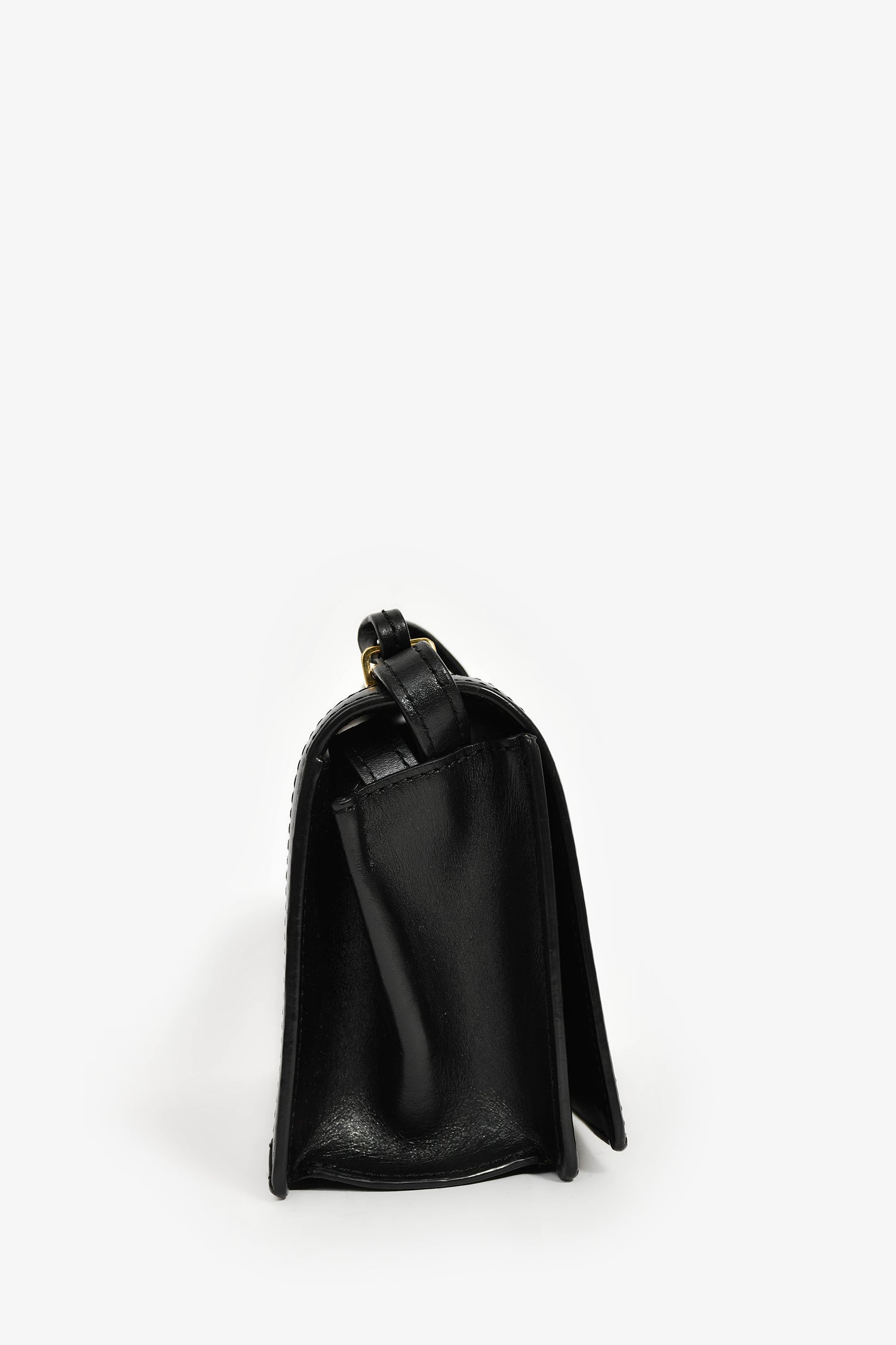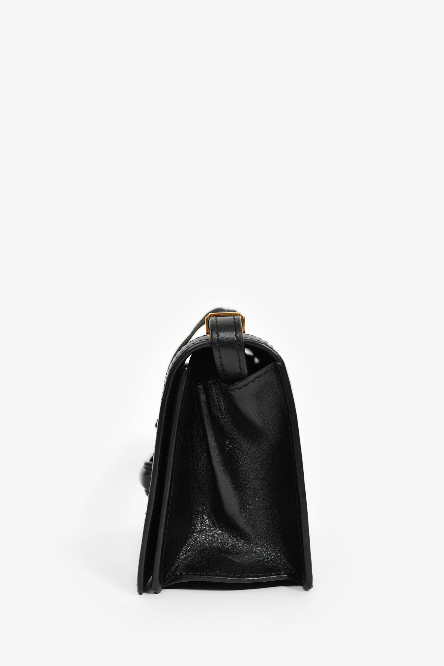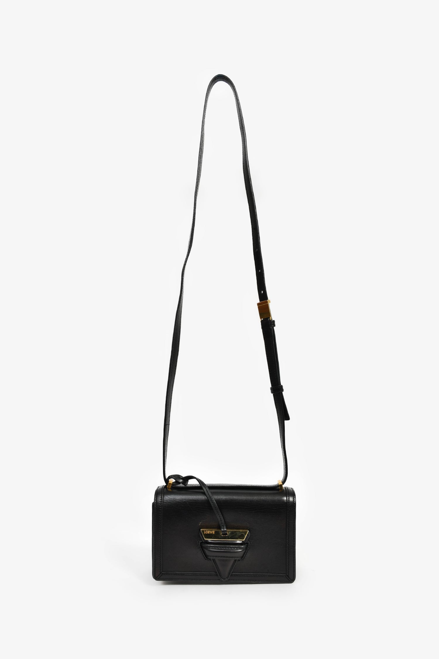 Refresh availabilityLoewe 2016 Black Leather Barcelona Crossbody Bag. Fold-over flap with an attached clochette closure. Adjustable crossbody strap. Gold-tone hardware. Tonal stitching.