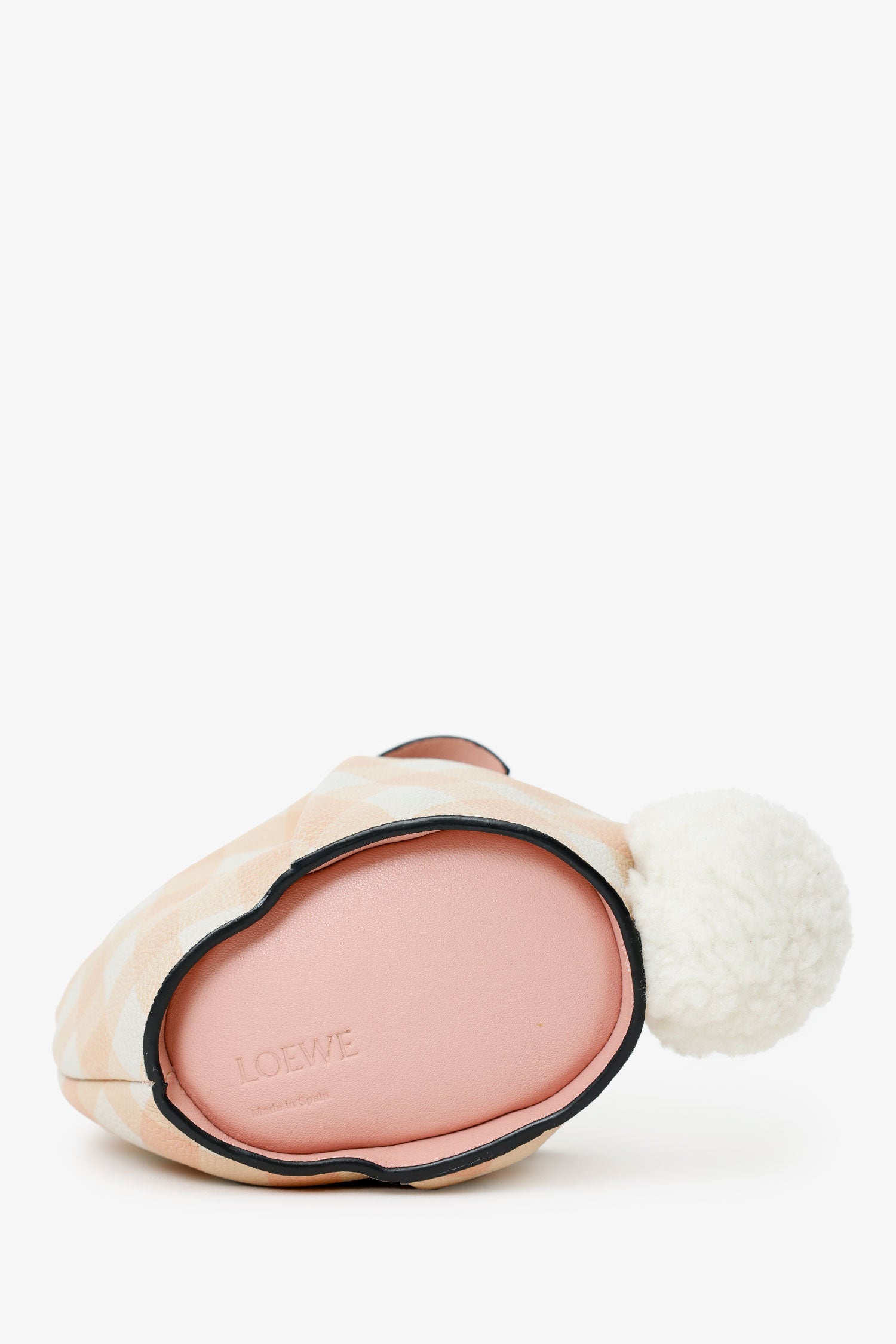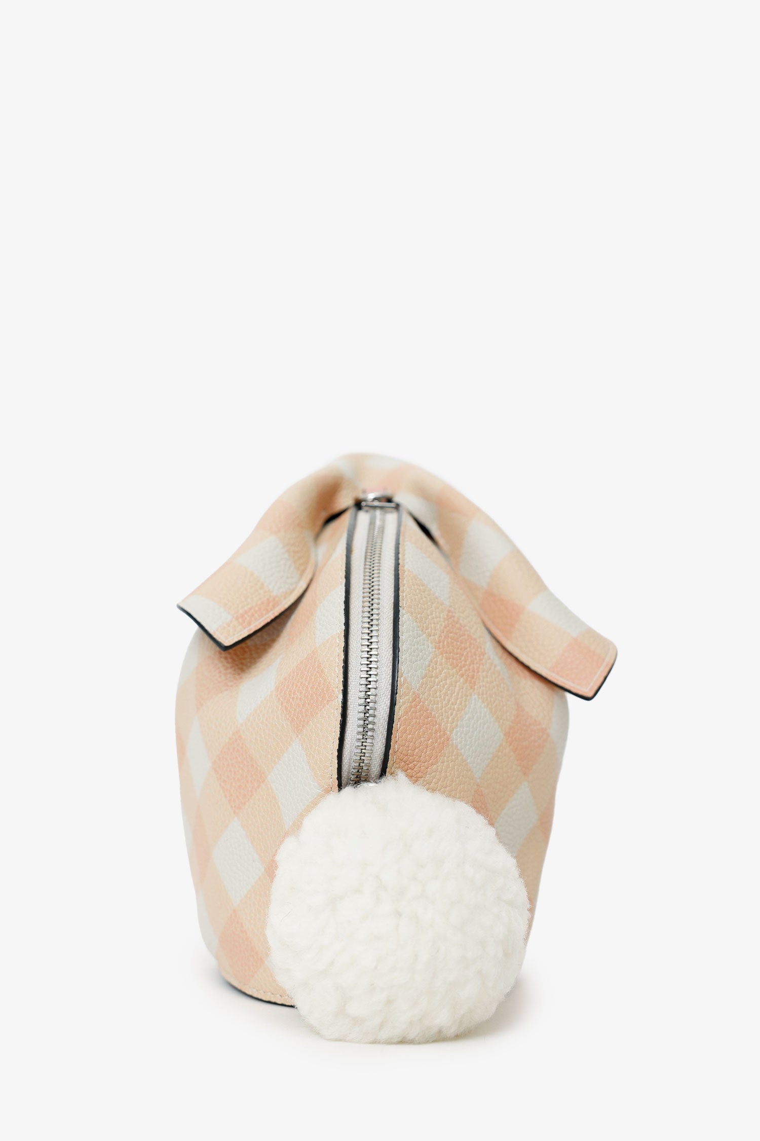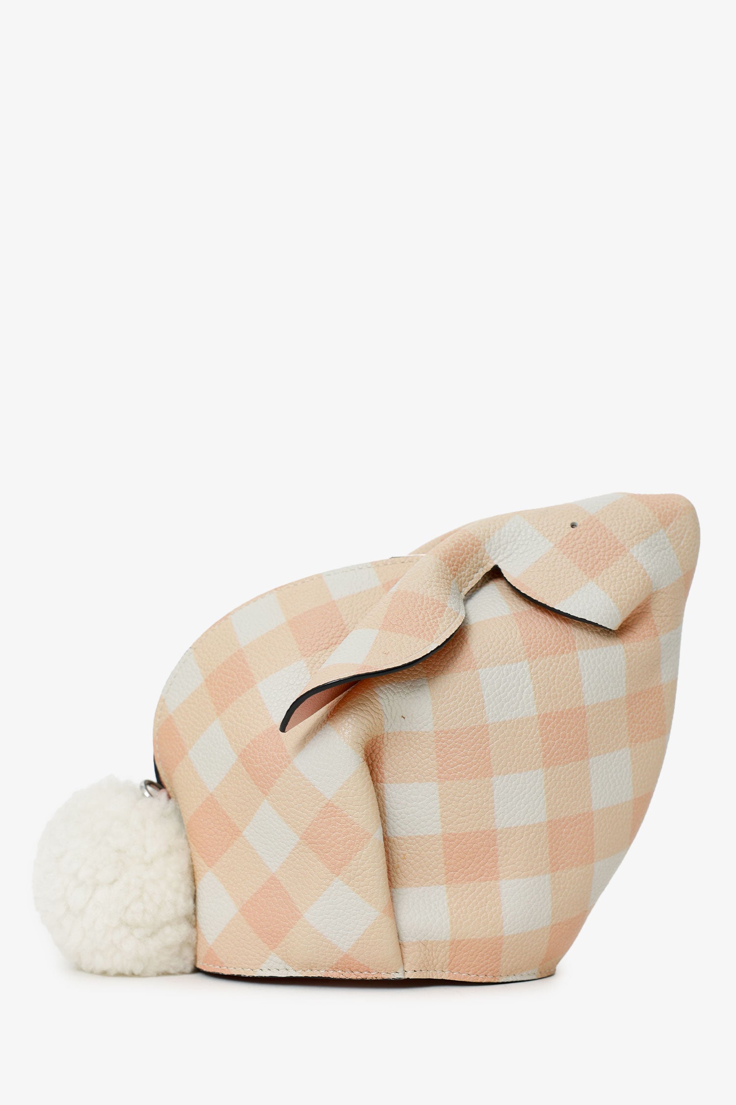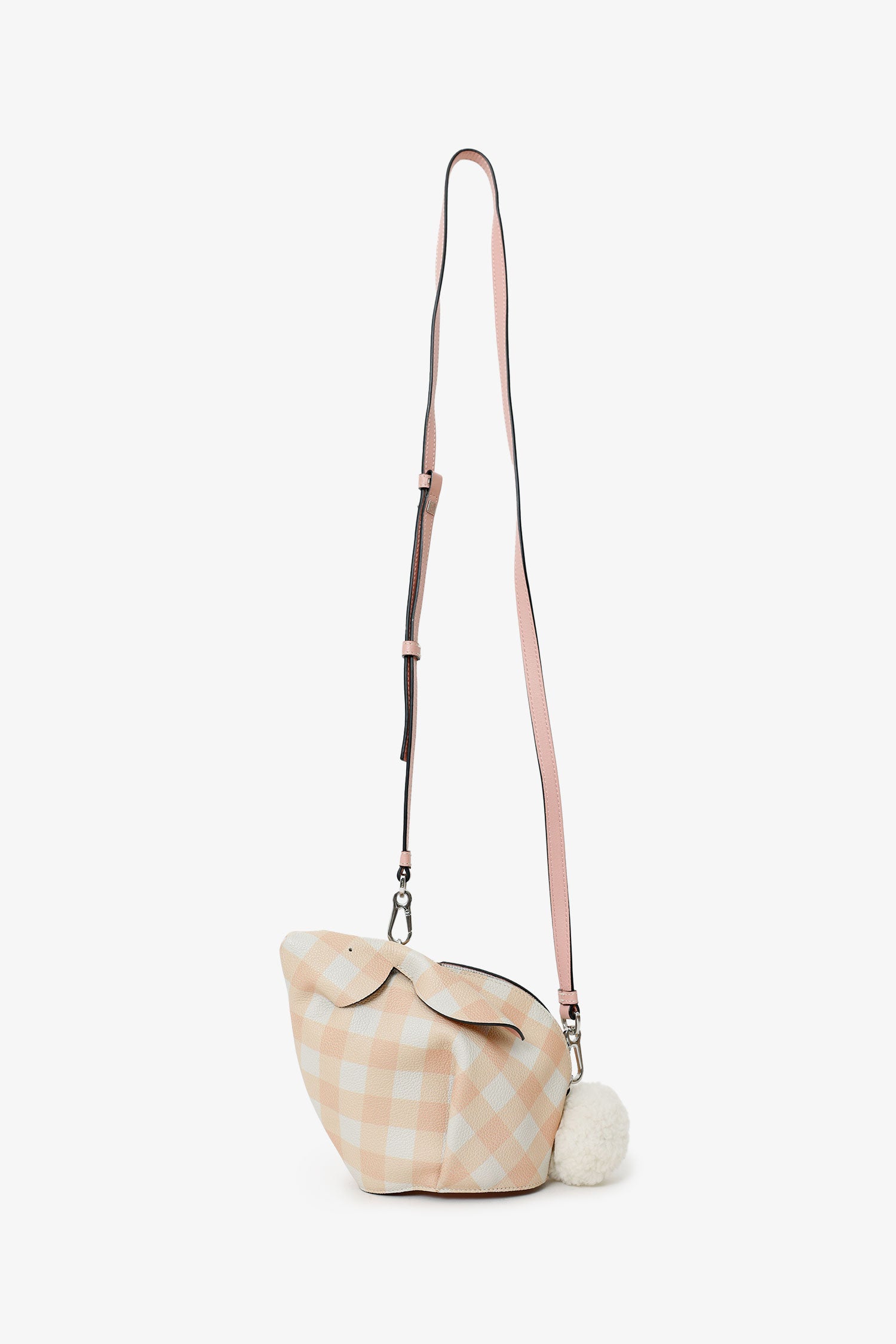 Refresh availabilityLoewe 2018 Pink/White Gingham Leather Bunny Crossbody Bag. Top zip-up closure. Removable crossbody strap with adjustable pull-through push-pin closure. Open interior. Silver-tone hardware. Tonal stitching.