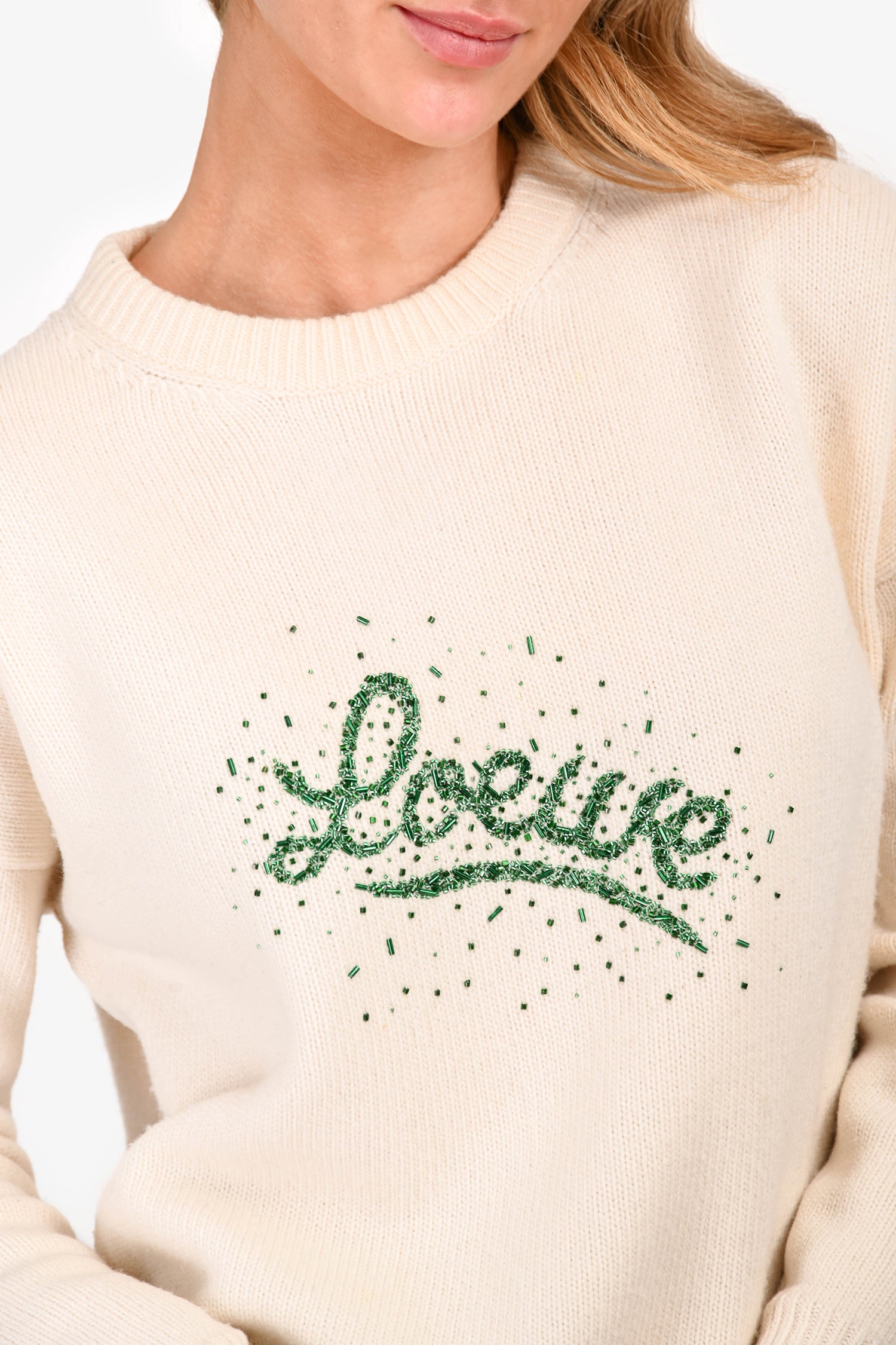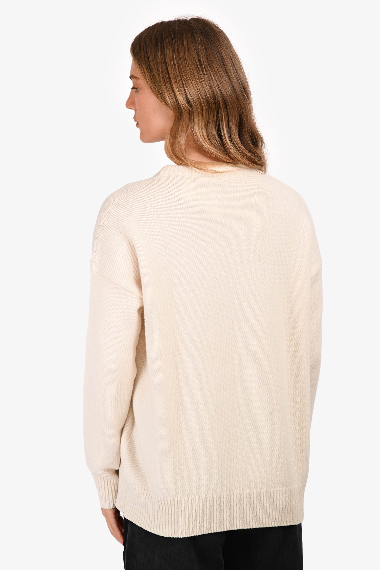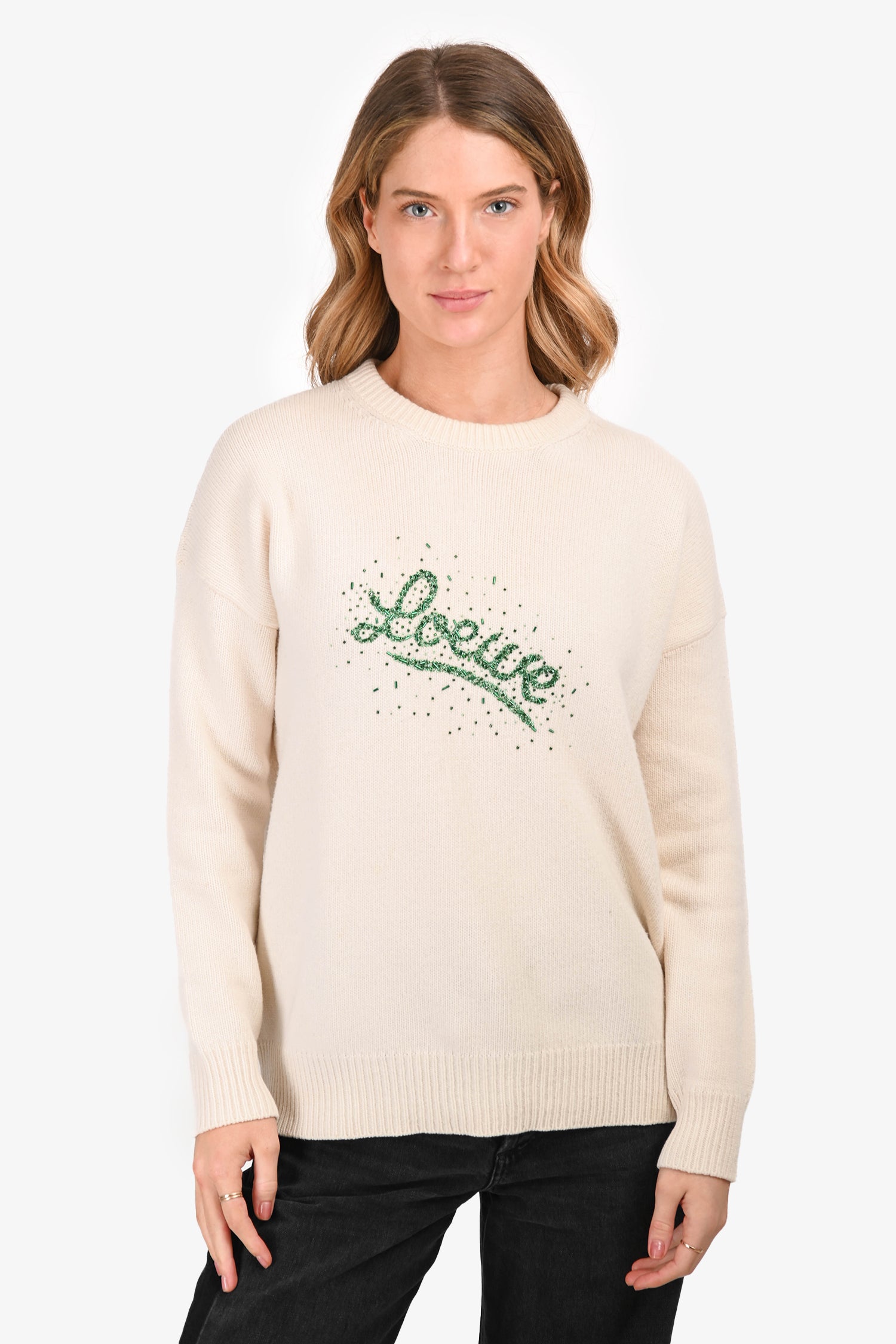 Refresh availabilityLoewe 2019 Cream Wool Graphic Sequins Crewneck Sweater. Round neckline. Ribbed neckline, cuffs, and hem. Tonal stitching.