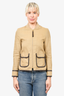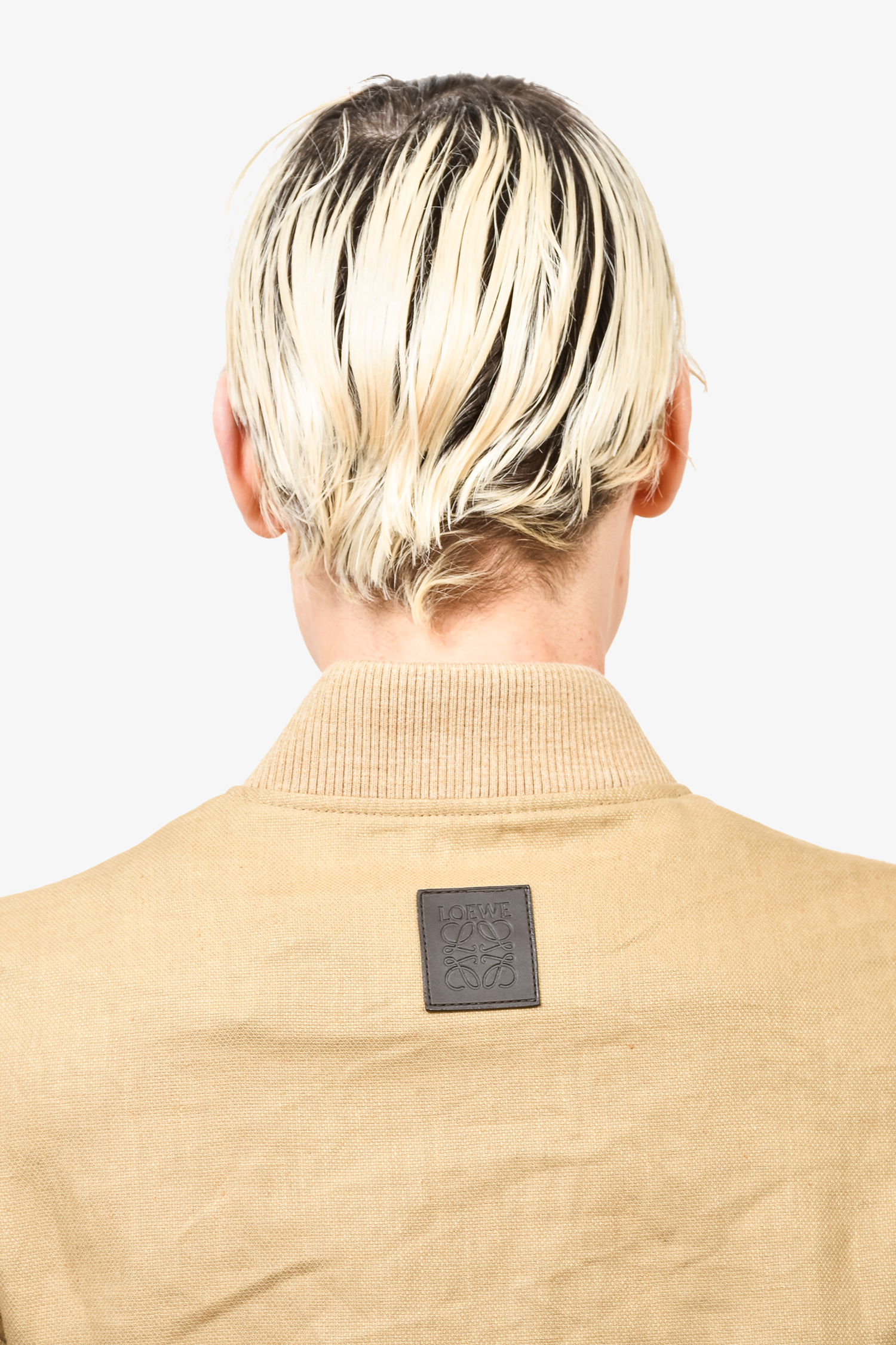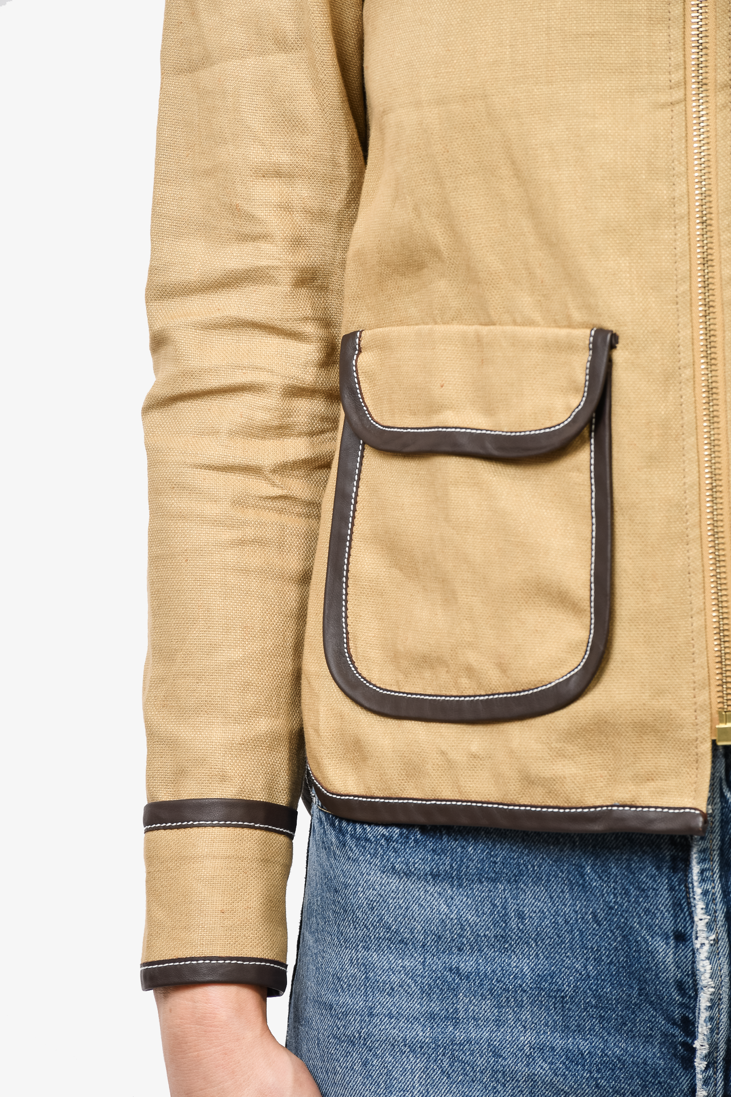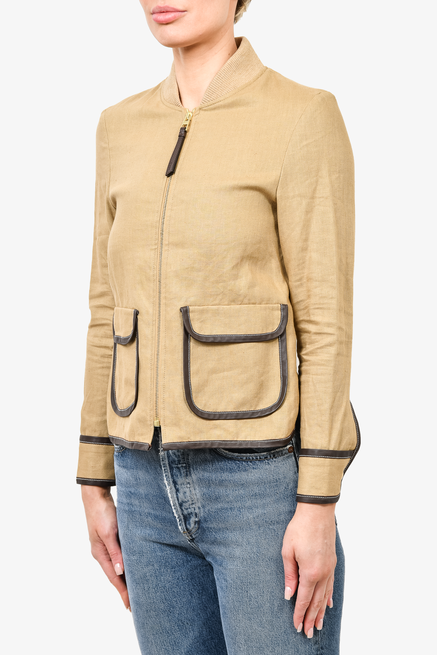 Loewe Beige Linen Zip Up 'Saharienne' Jacket with Brown Leather Trim Size 36