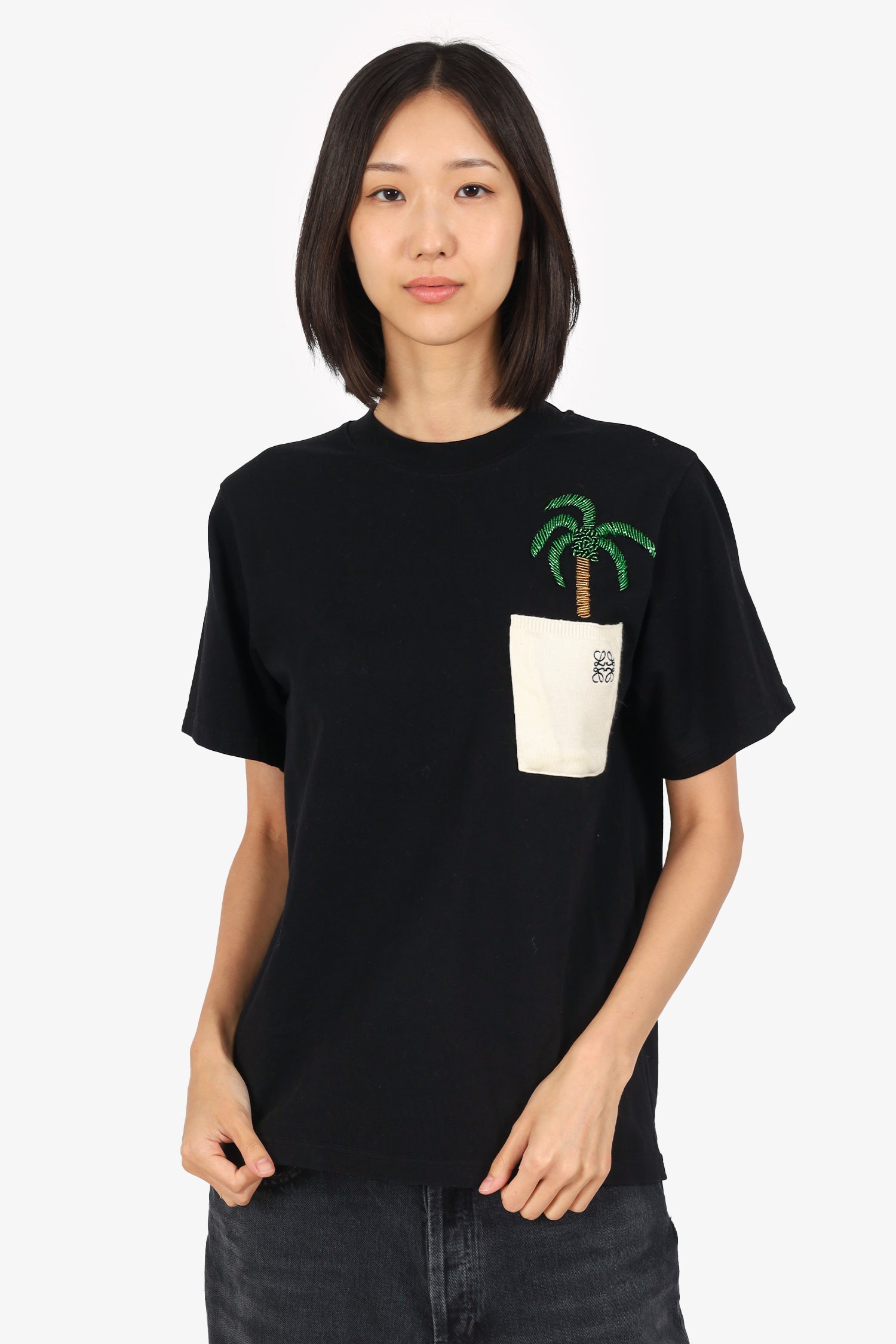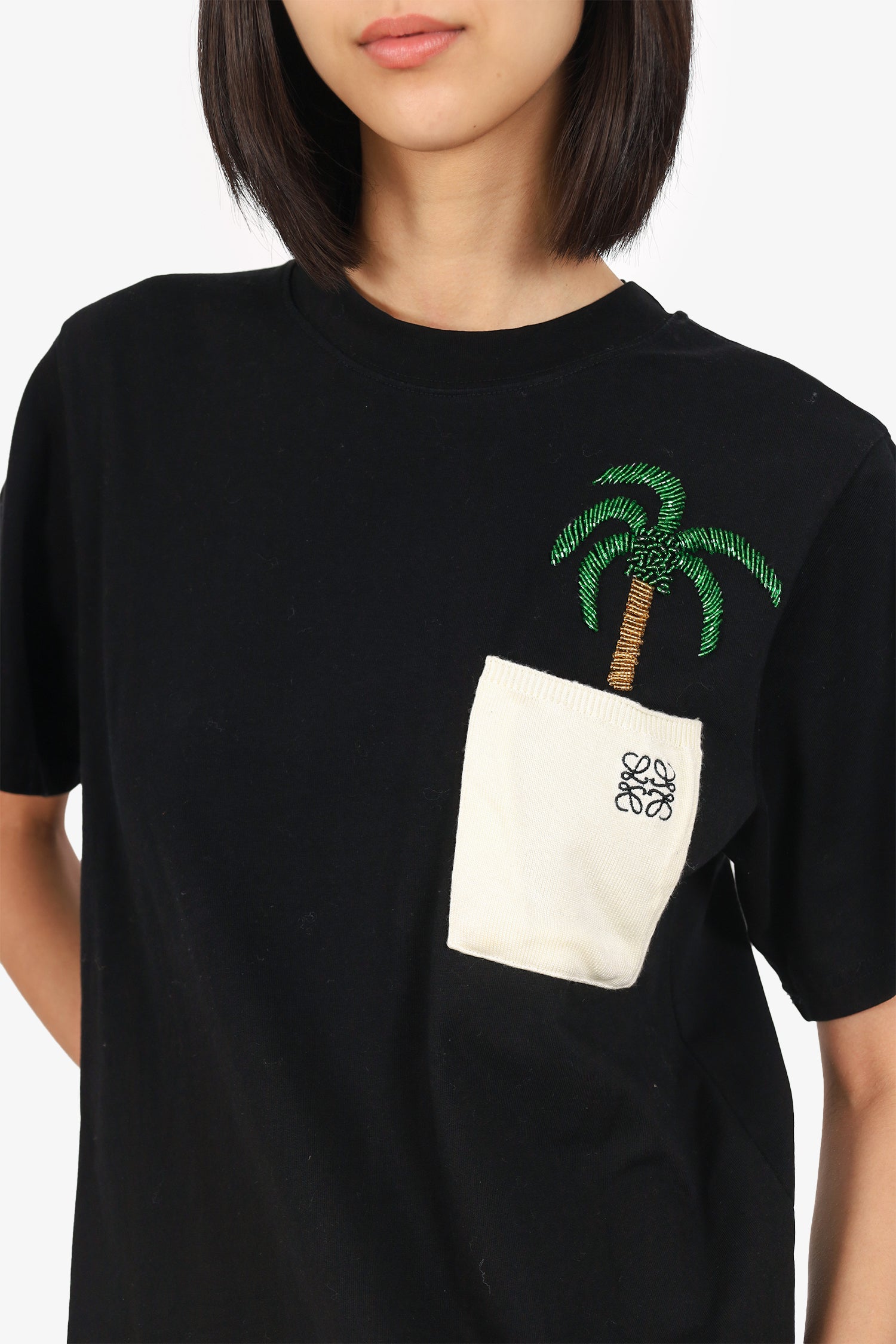 Refresh availabilityLoewe Black Cotton/Knit Anagram Embellished Palm Tree T-Shirt. Pull-on. Round neckline. Front single exterior knitted slip pocket. Tonal stitching.