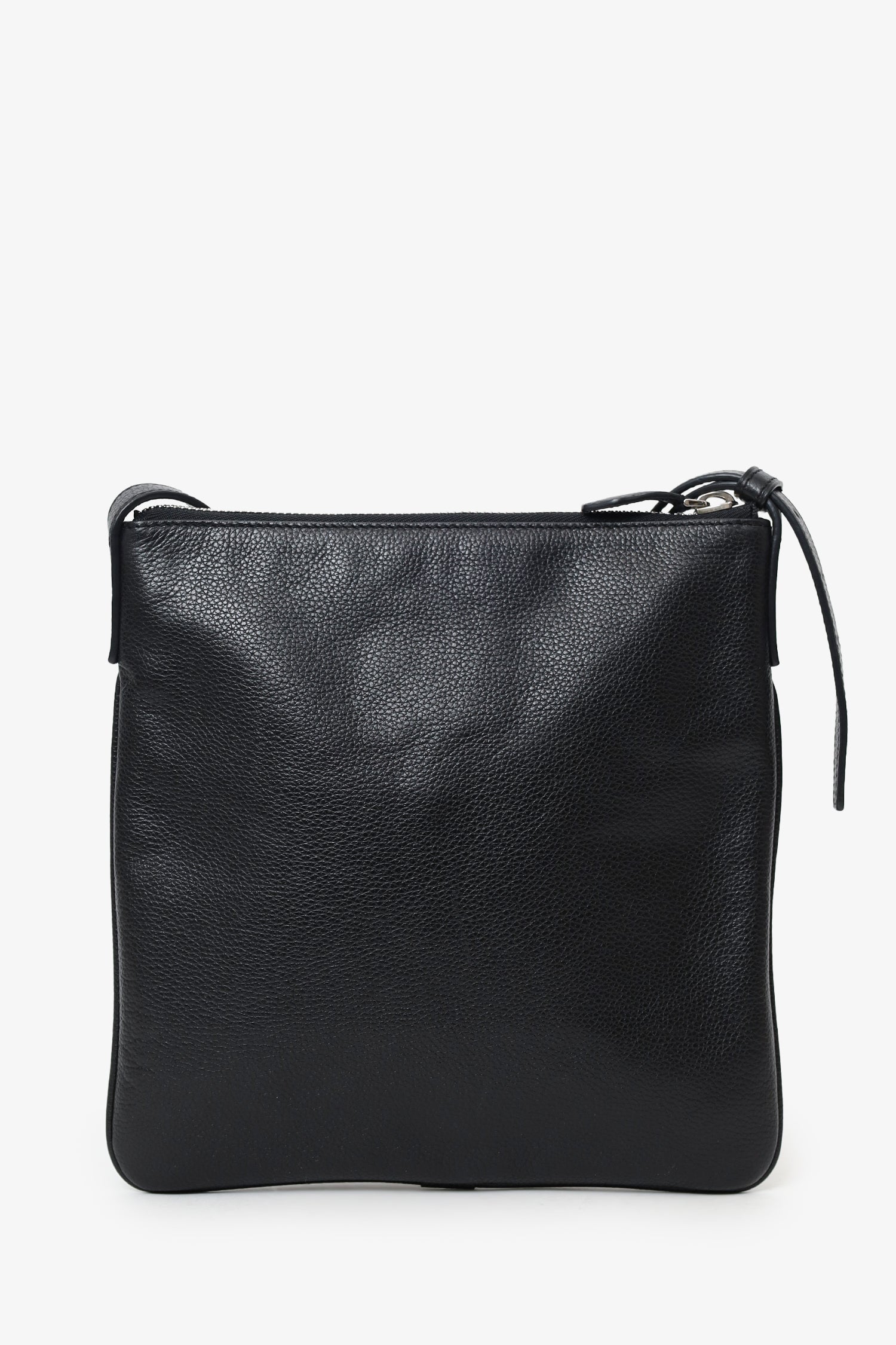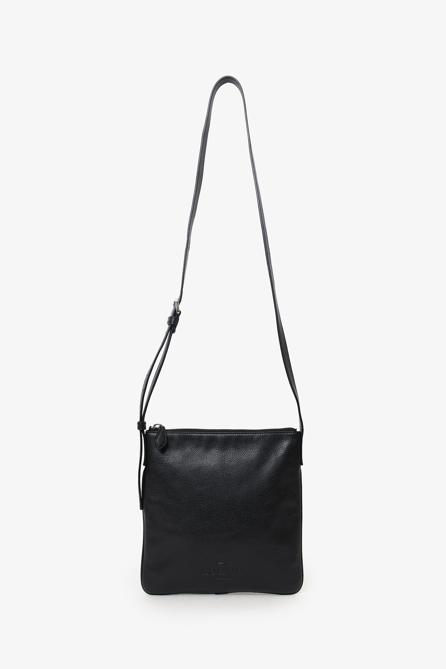 Refresh availabilityLoewe Black Leather Square Crossbody Bag. Top zip closure. Leather strap with adjustable buckle closure. Lined interior. 2 interior slip pockets. Silver-tone hardware. Tonal stitching.