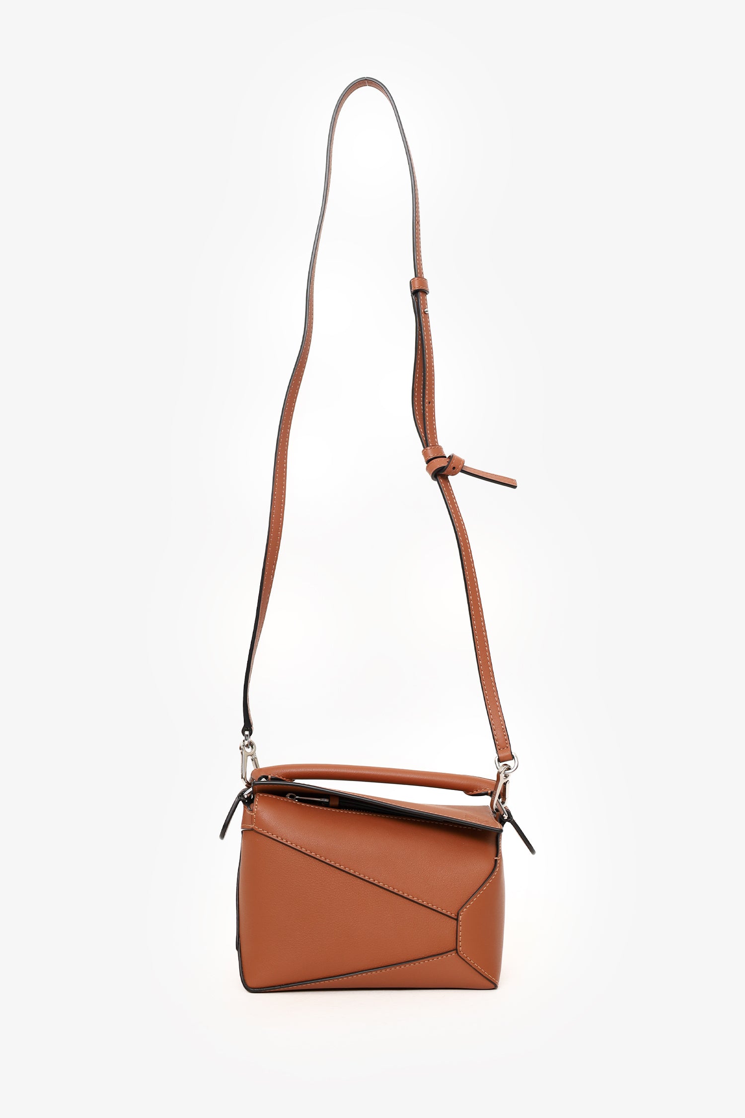Refresh availabilityLoewe Brown Leather Mini Puzzle Crossbody With Strap. Top zip closure. Top handle. Removable adjustable leather crossbody strap. Open canvas-lined interior. Silver-tone hardware. Contrast stitching.