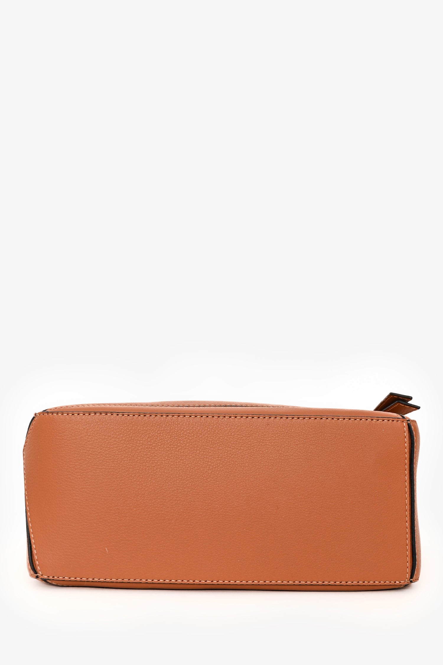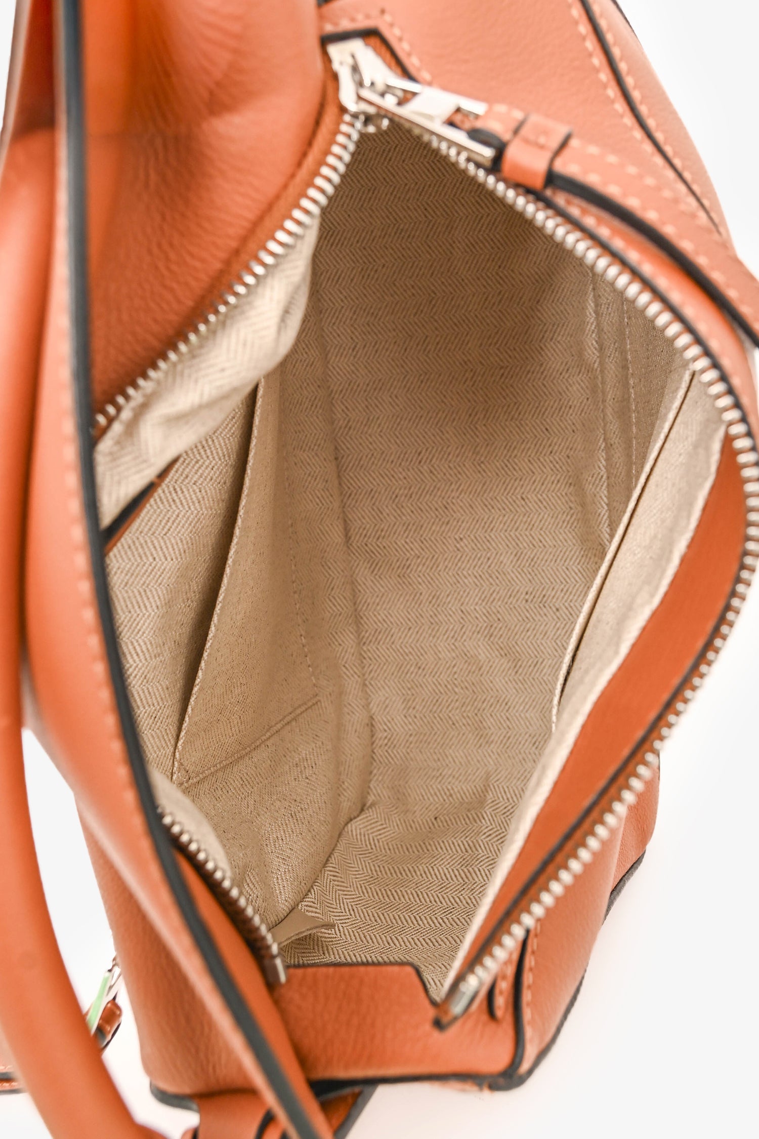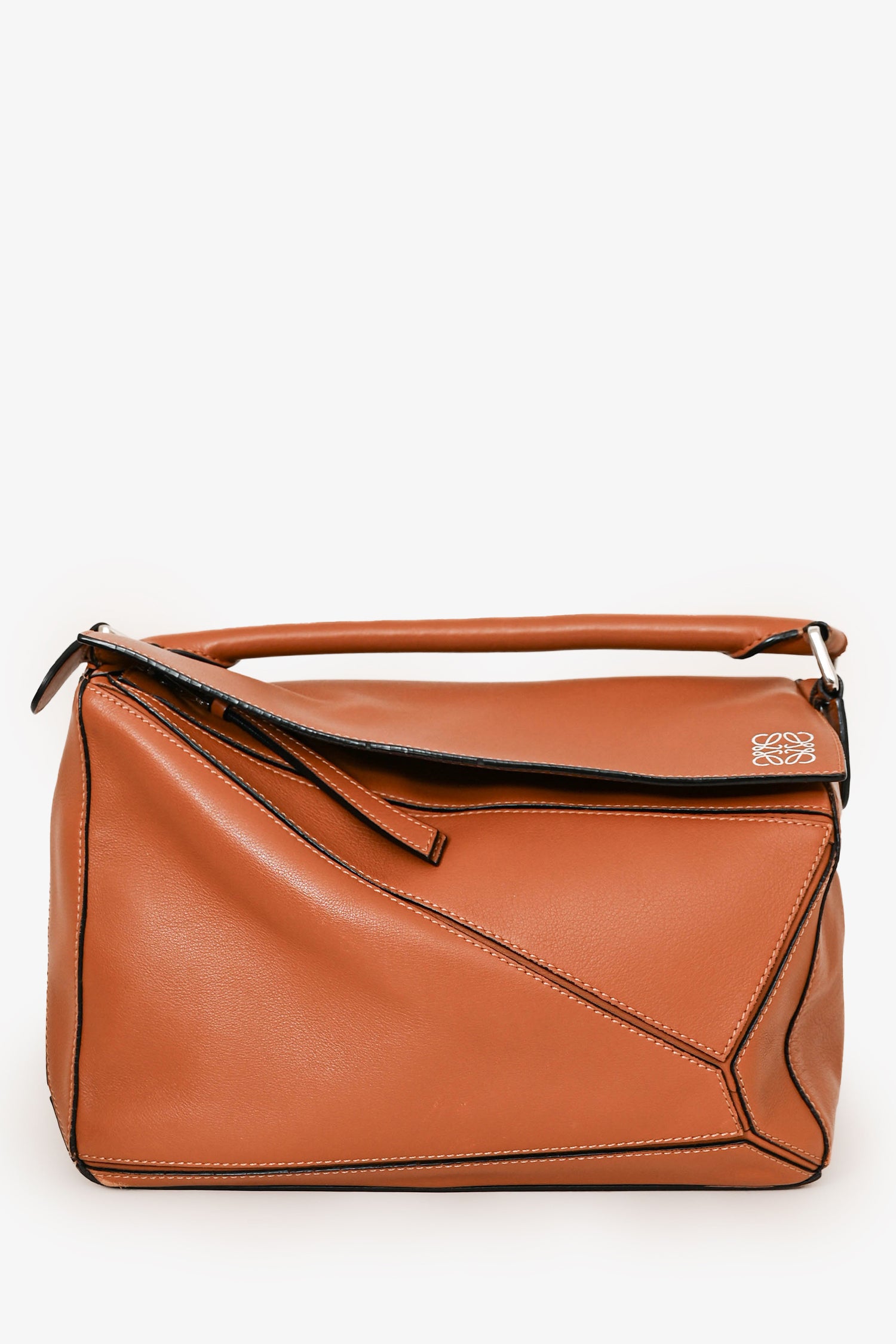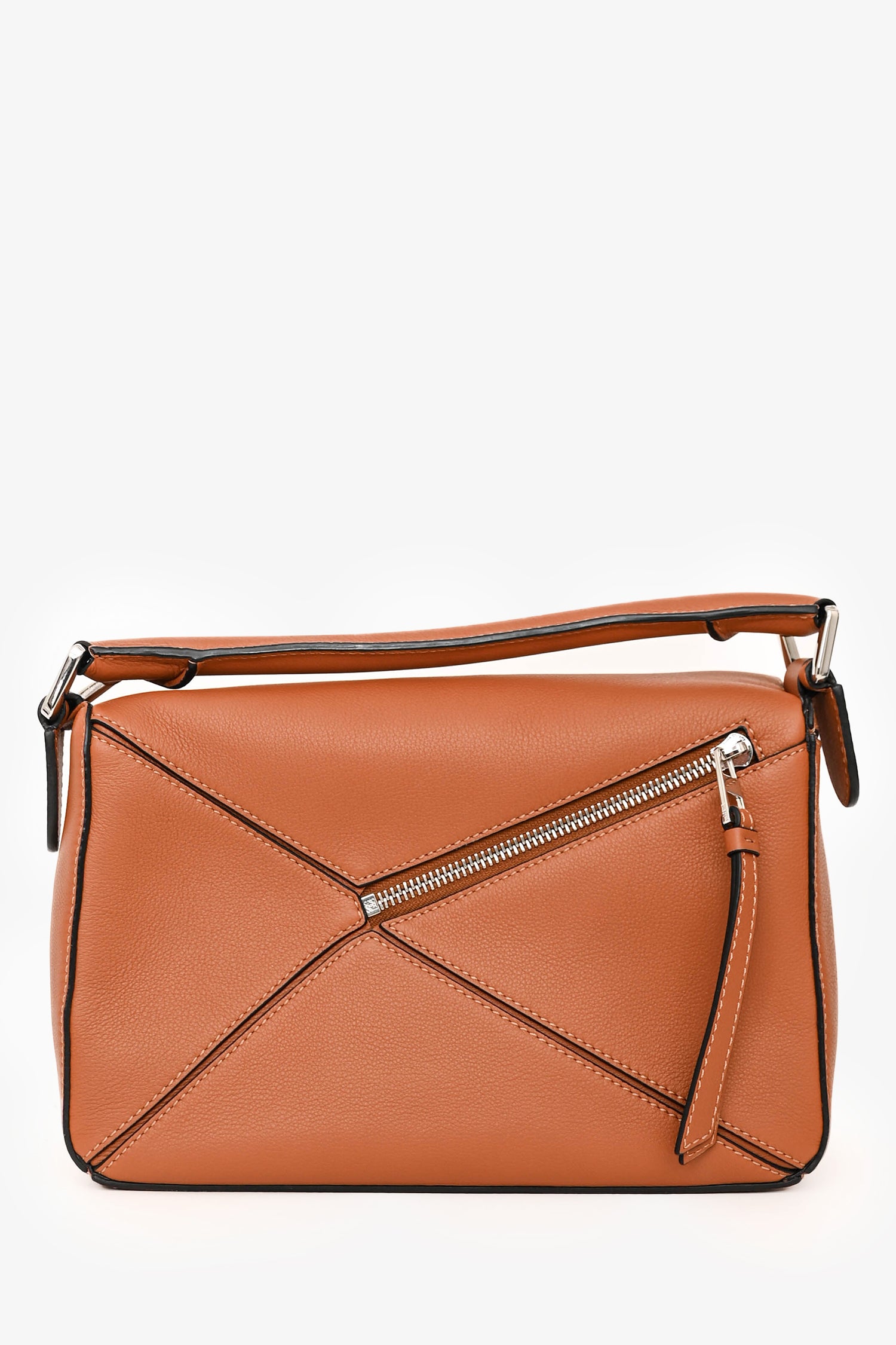 Refresh availabilityLoewe Brown Leather Small Puzzle Bag with Strap. Top zip closure. Rolled top handle and detachable, adjustable shoulder strap. 1 exterior zip pocket; 2 interior slip pockets. Exterior geometric panel construction with tonal stitching. Silver-tone hardware.