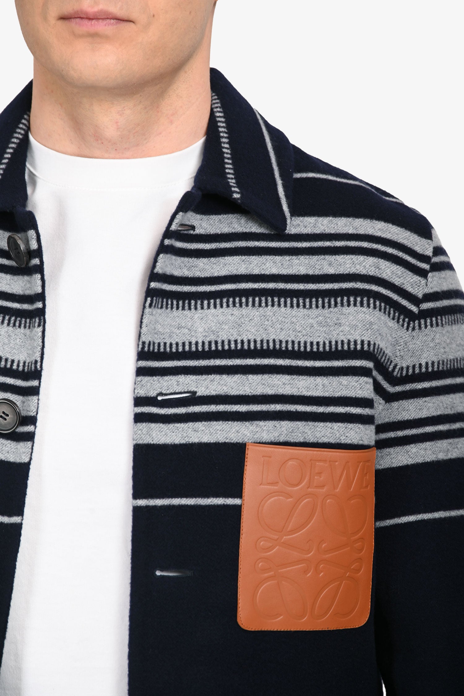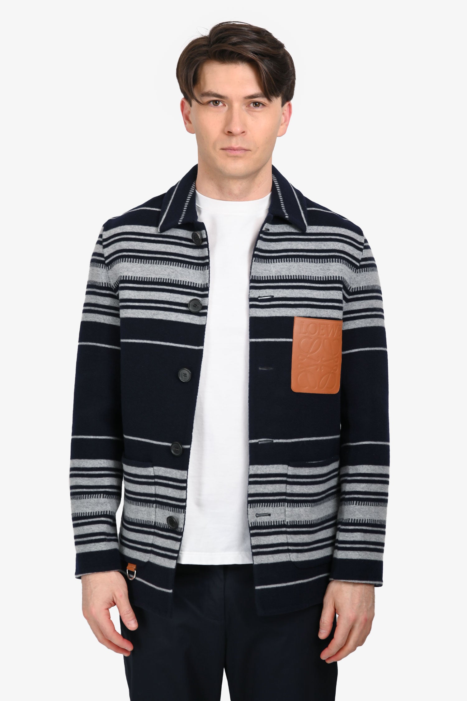 Refresh availabilityLoewe Navy/Grey Wool/Cashmere Leather Pocket Jacket. Collared neckline. Button closure in the front. 3 exterior slip pockets. Tonal hardware. Tonal stitching.