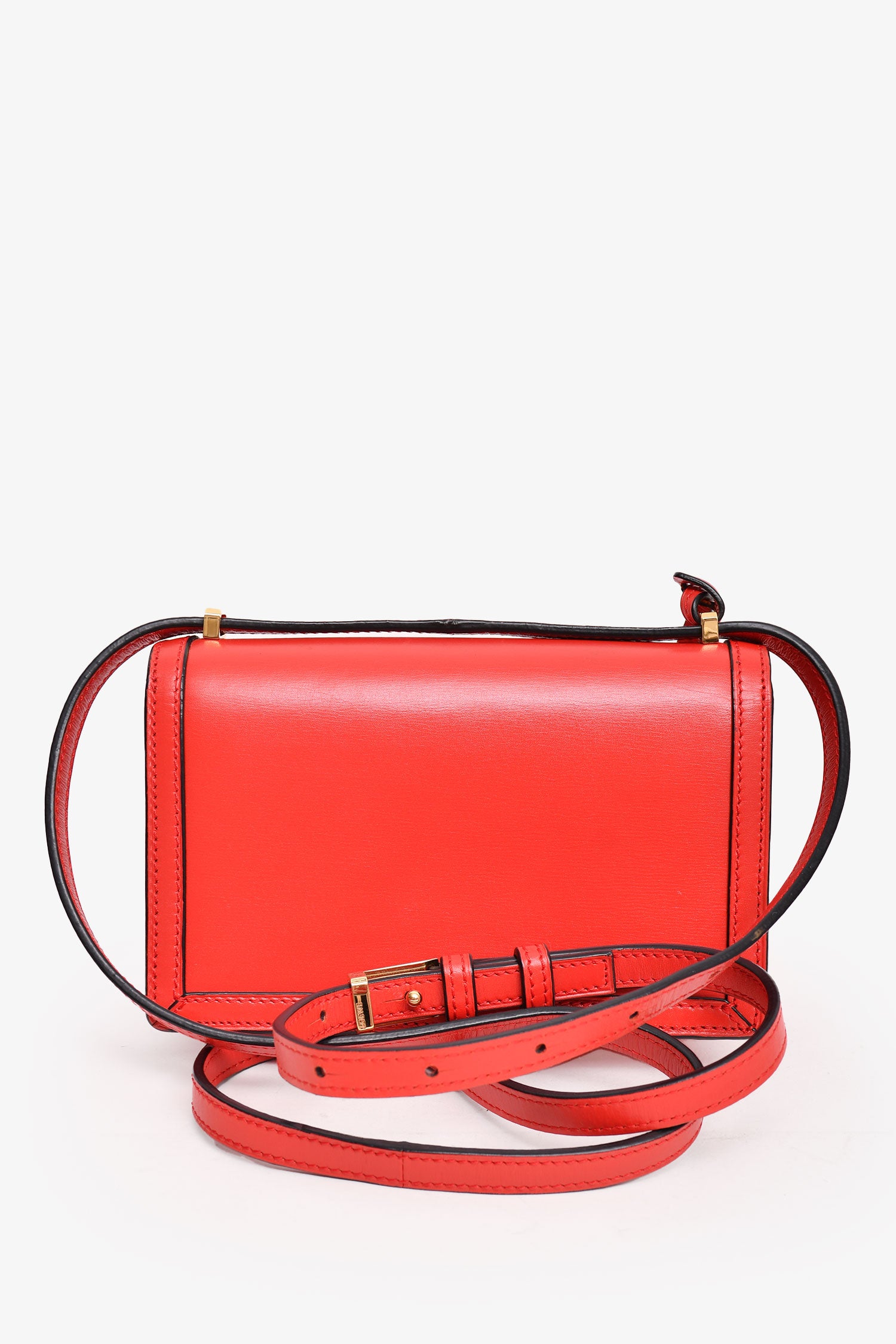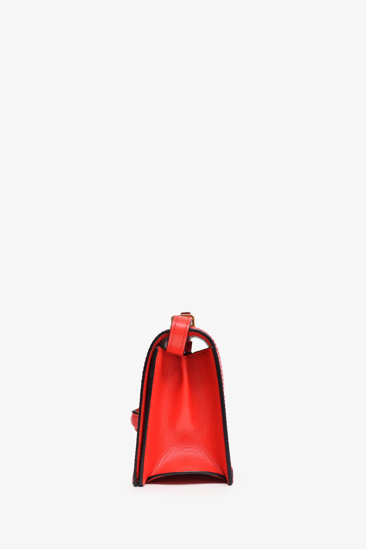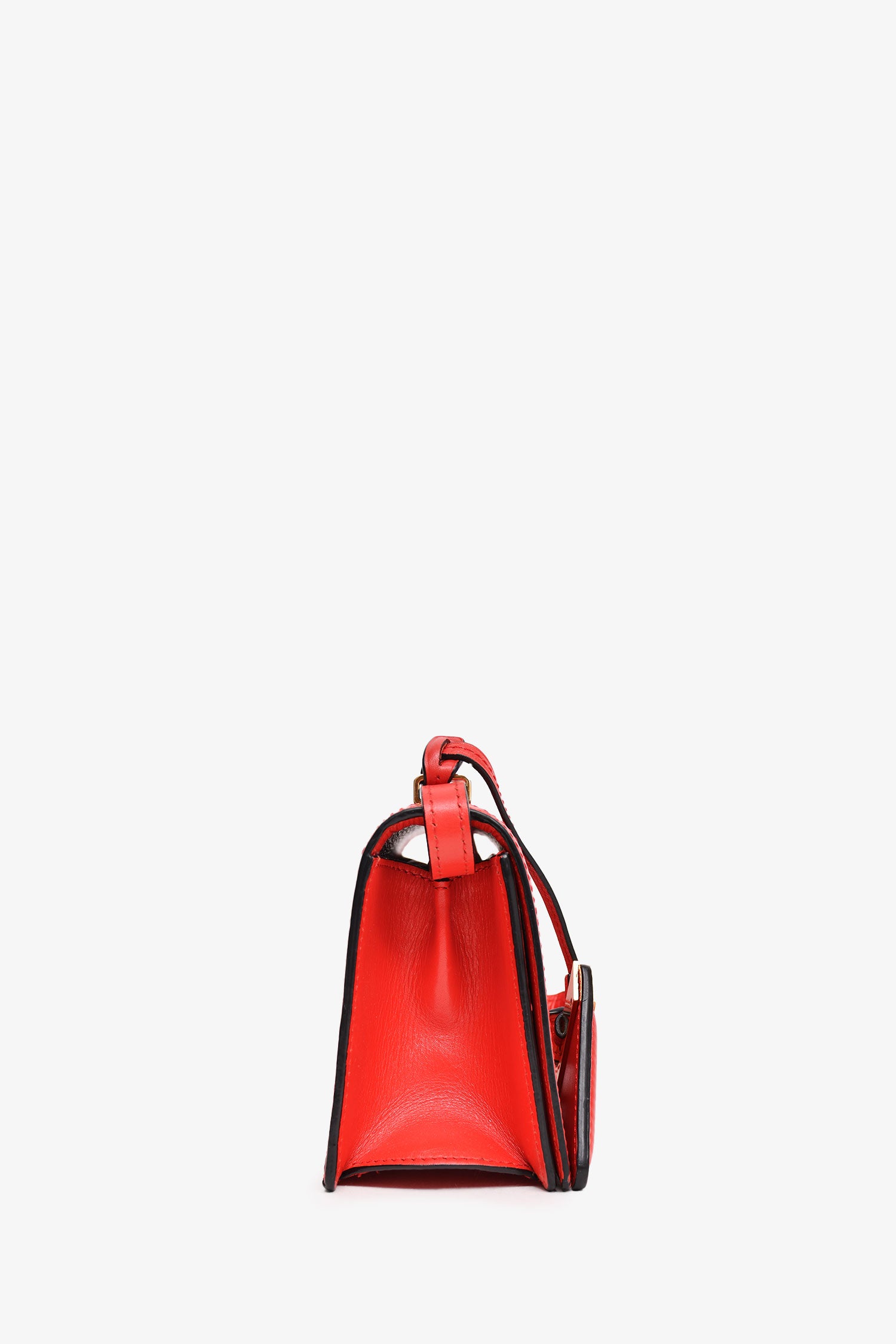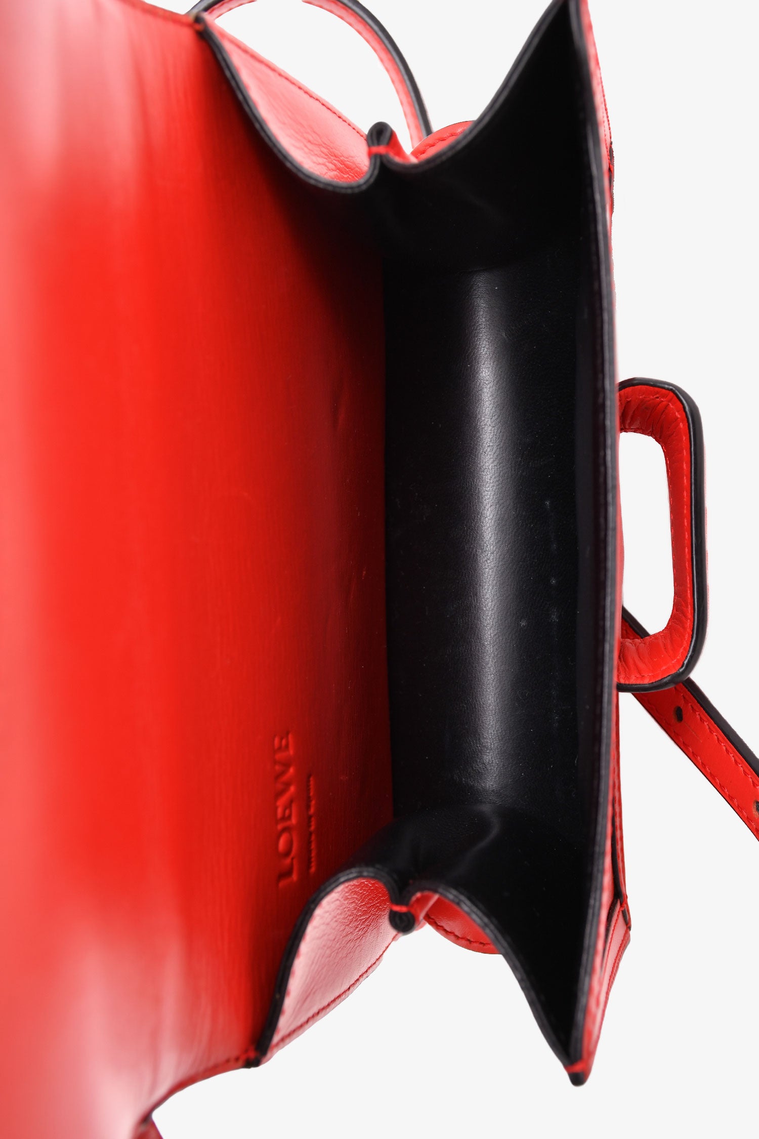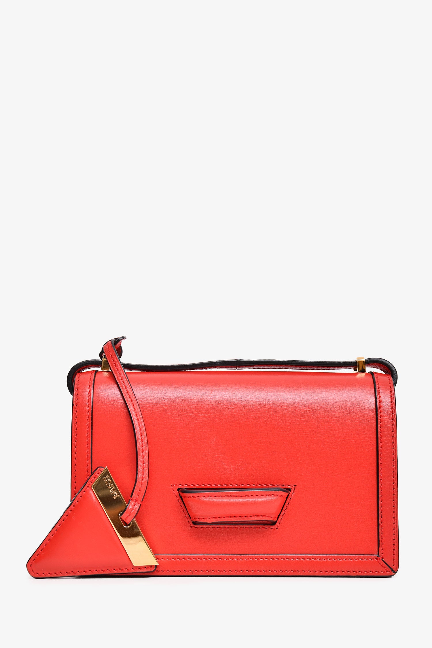 Refresh availabilityLoewe Red Leather Barcelona Mini Shoulder Bag. Front fold-over flap with slide clochette closure. Black leather interior lining. Open interior. Slide-around and adjustable strap. Gold-tone hardware.