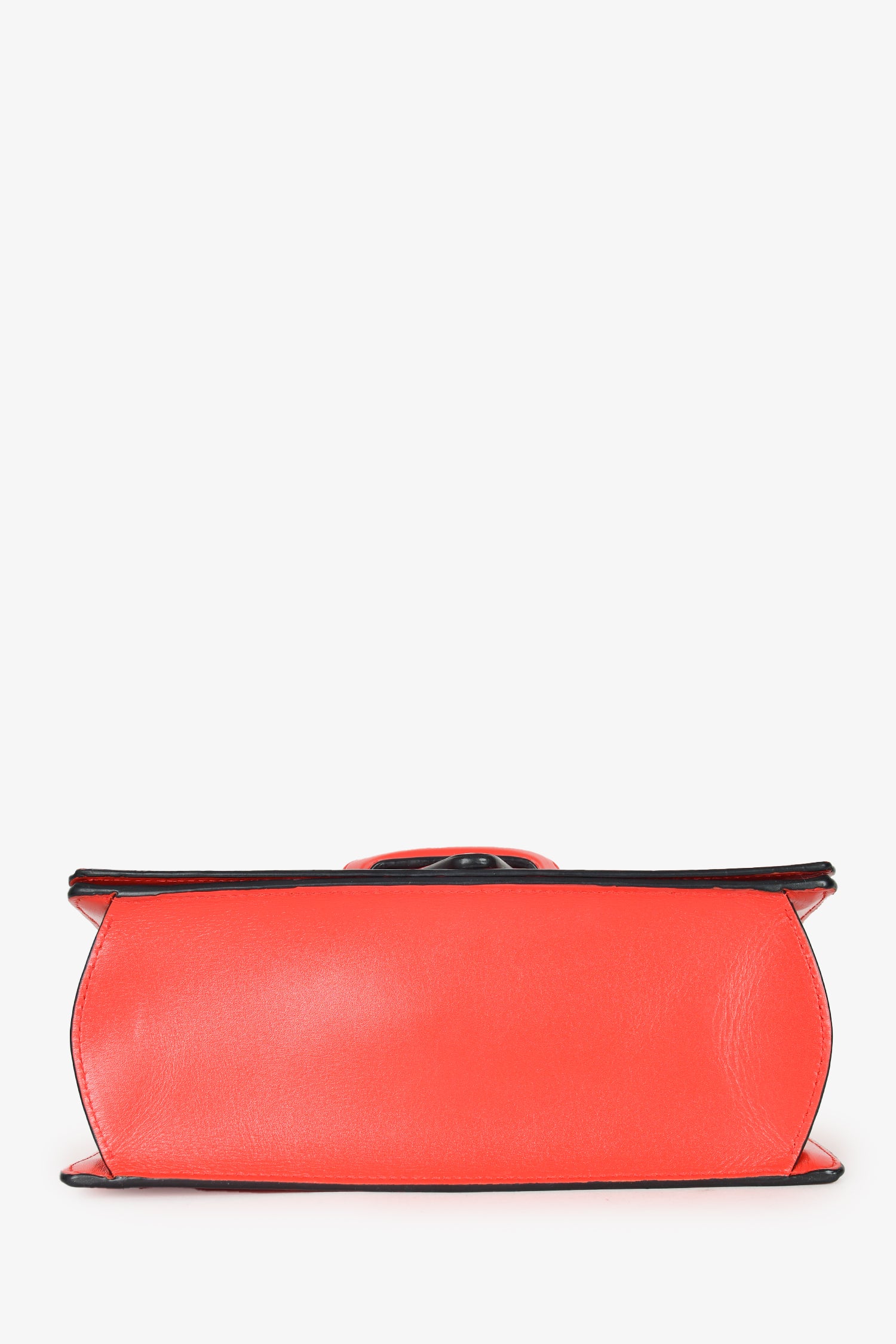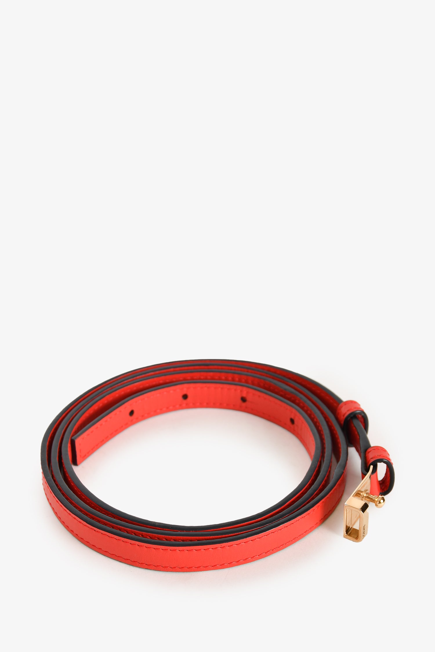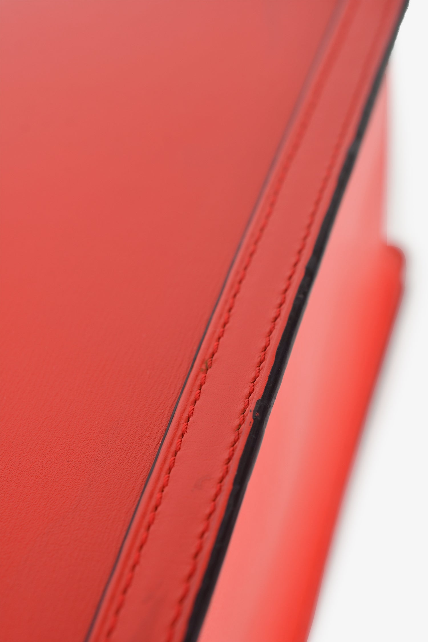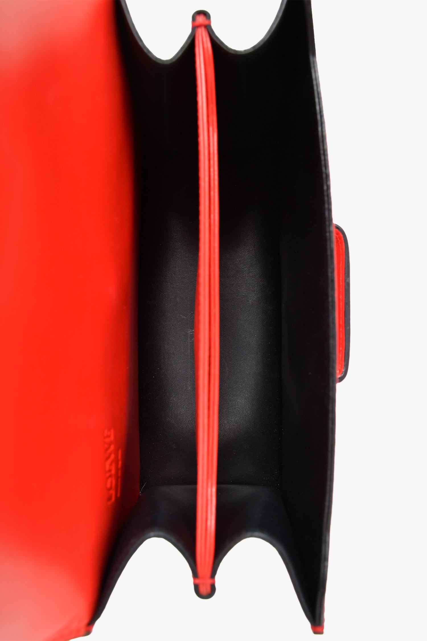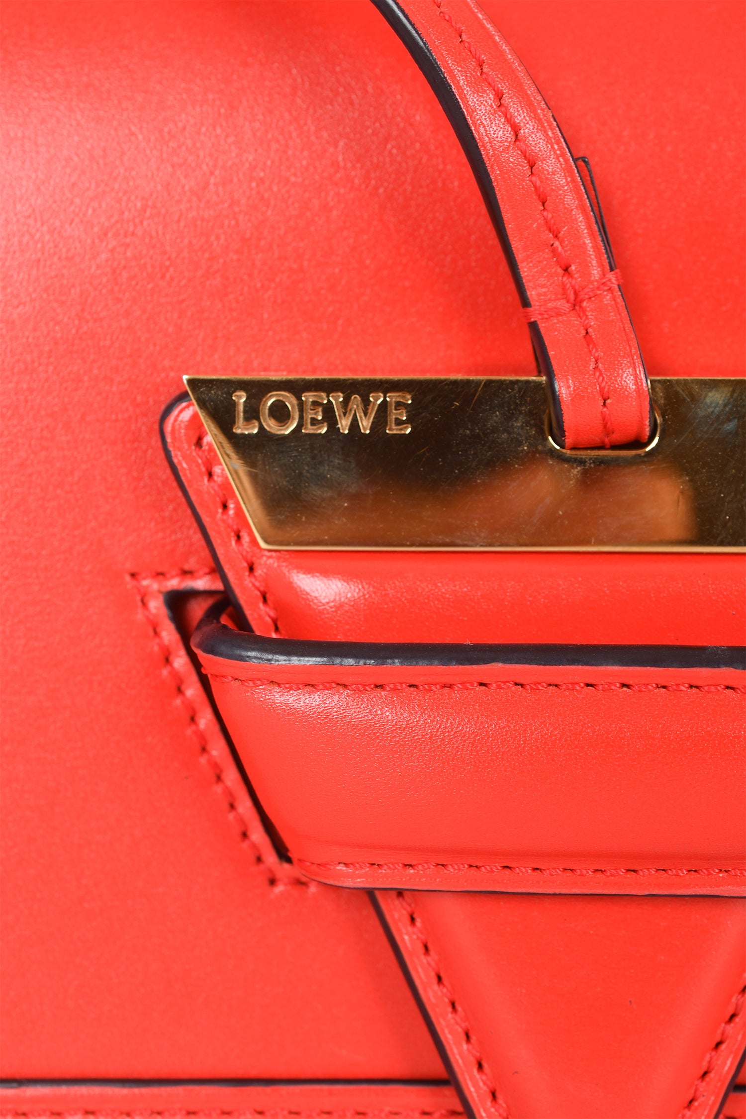 Refresh availabilityLoewe Red Leather Medium Barcelona Crossbody. Front fold-over flap with slip-through closure. Black leather interior. 2 interior compartments; separated by a divider. Single interior wall slip pocket. Outer rear slip pocket. Removable and adjustable strap. Gold-tone hardware.
