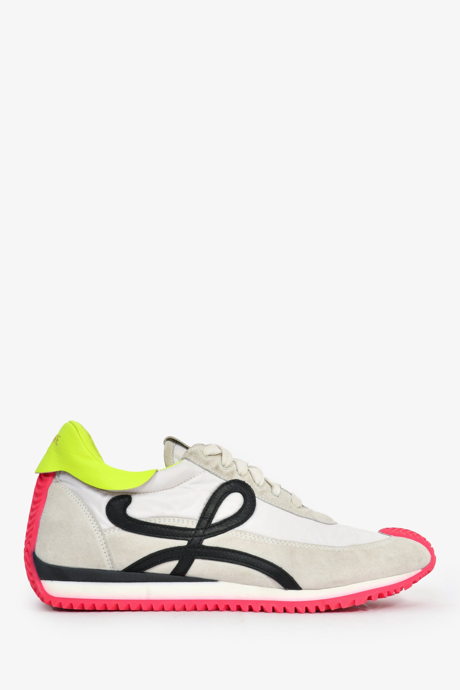 Refresh availabilityLoewe White/Neon Suede Flow Runner Sneaker. Suede exterior. Leather trim and interior. Rubber soles.