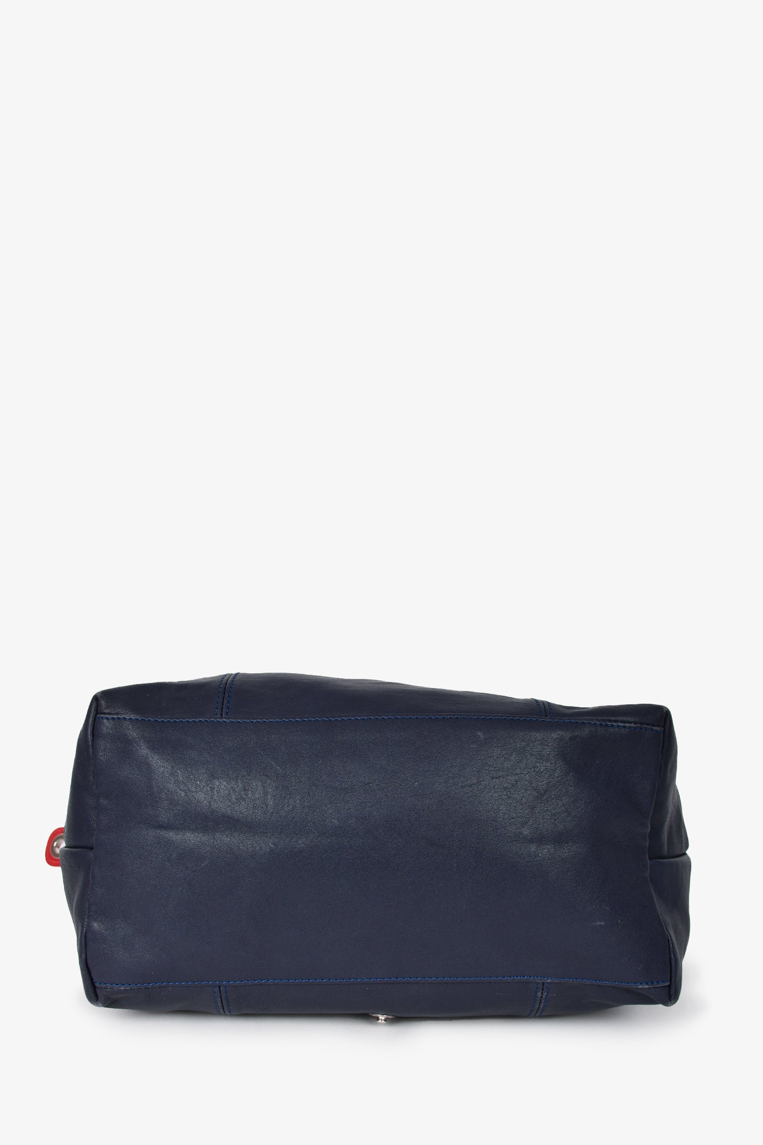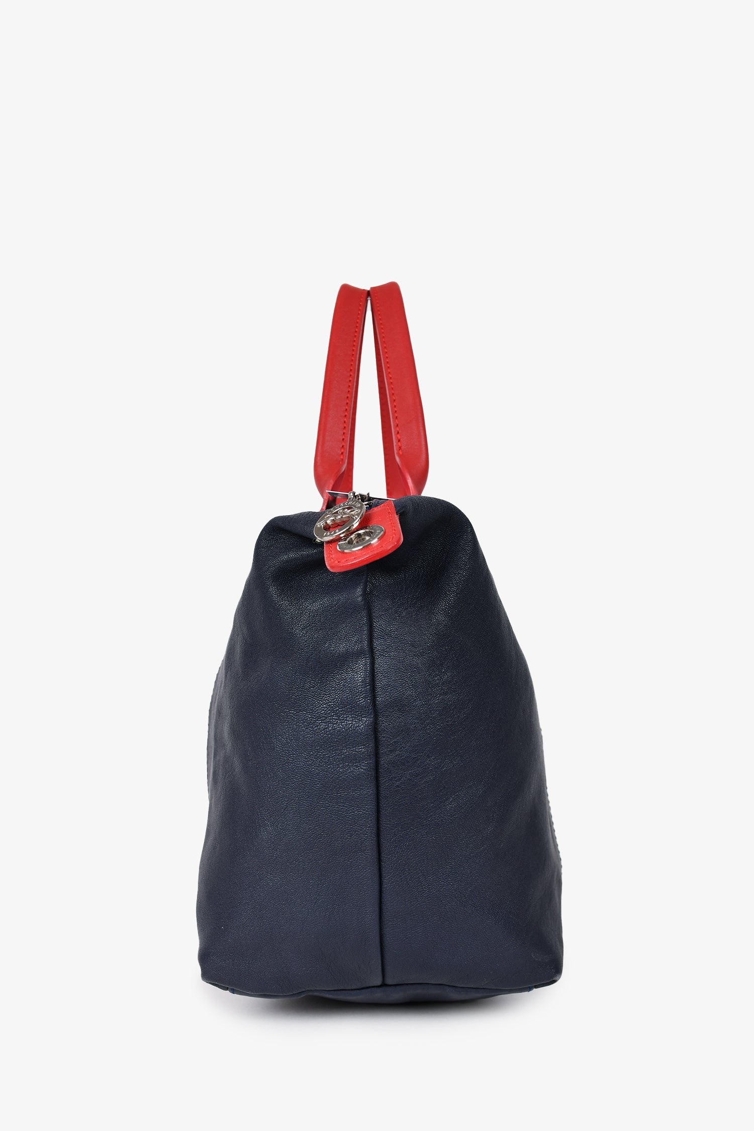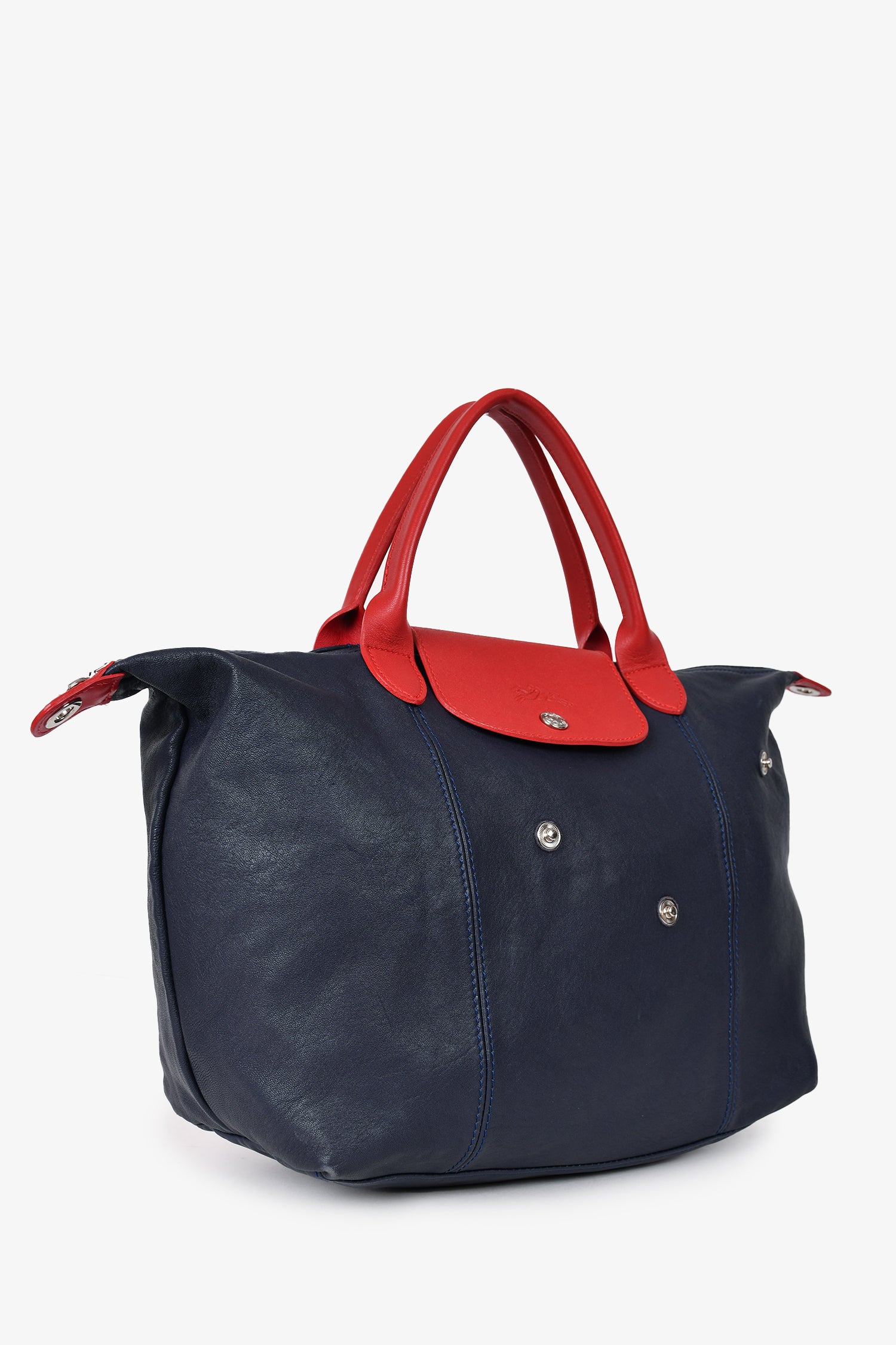 Refresh availabilityLongchamp Limited Edition Navy/Red Leather Removable Patchwork Bag with Strap. Tonal topstitching. Dual rolled top handles. Leather trimming. Top zipper. Interior zippered compartment. Fold-over flap with snap closure. Comes with strap.