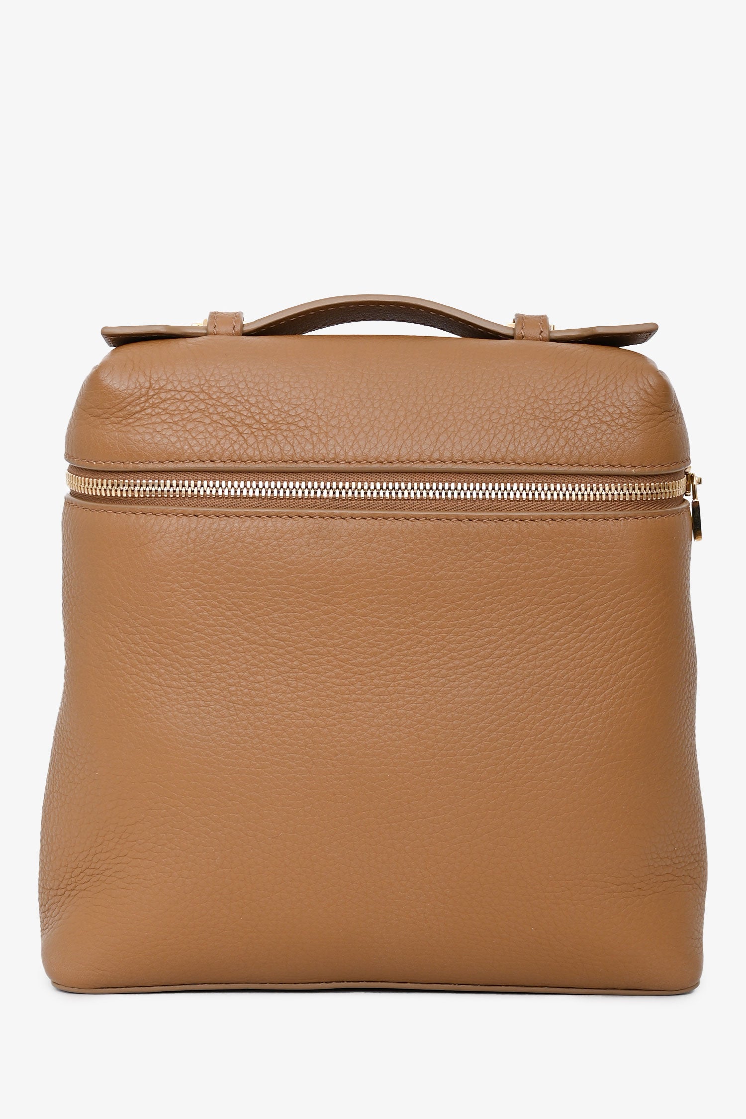 Refresh availabilityLoro Piana Brown Grained Leather Extra Pocket Backpack with Strap. Flat handle. Adjustable and detachable backpack straps. Additional removable crossbody strap. Front two-way zipper closure. Single compartment. Gold-tone hardware. Tonal stitching.