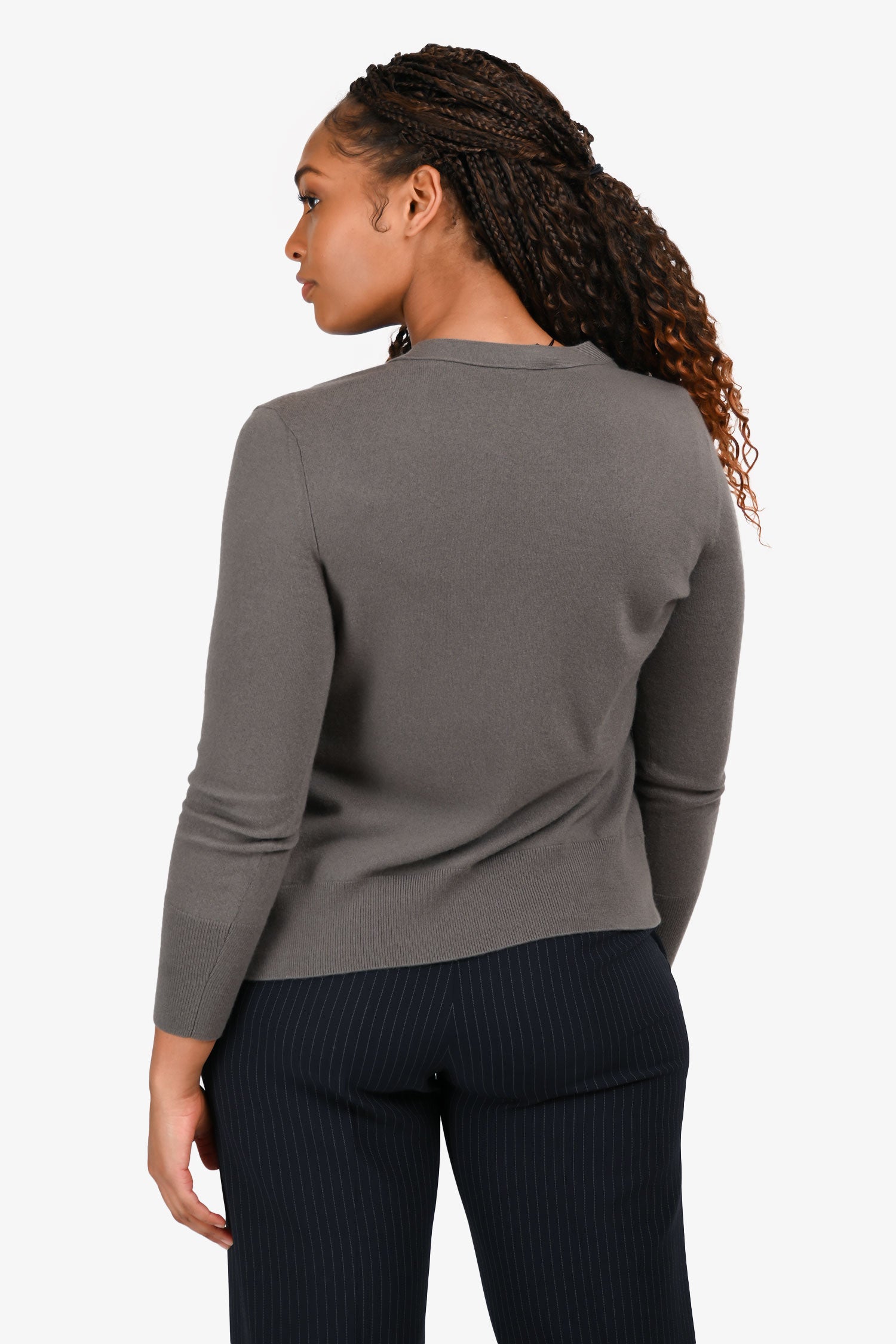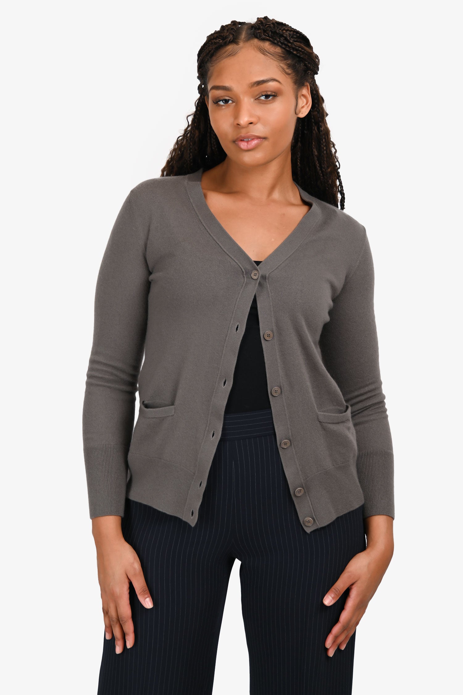Refresh availabilityLoro Piana Grey Cashmere Long Sleeve Buttoned Sweater. Slip-on. V-neckline. Front button-up closure. Ribbed neckline, cuffs, and hemline. 2 slip pockets in the front. Tonal hardware. Tonal stitching.