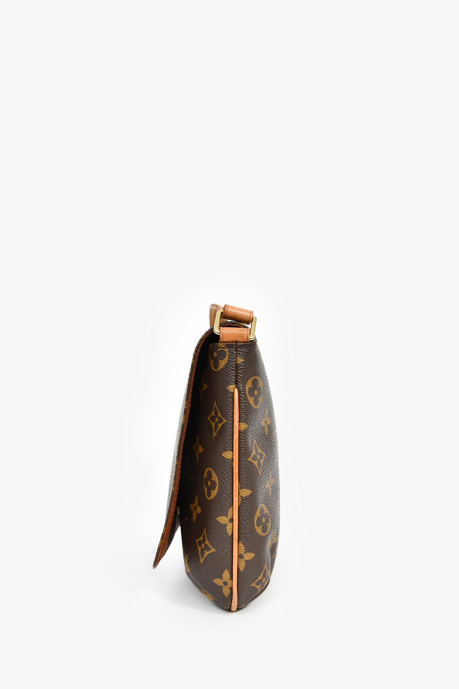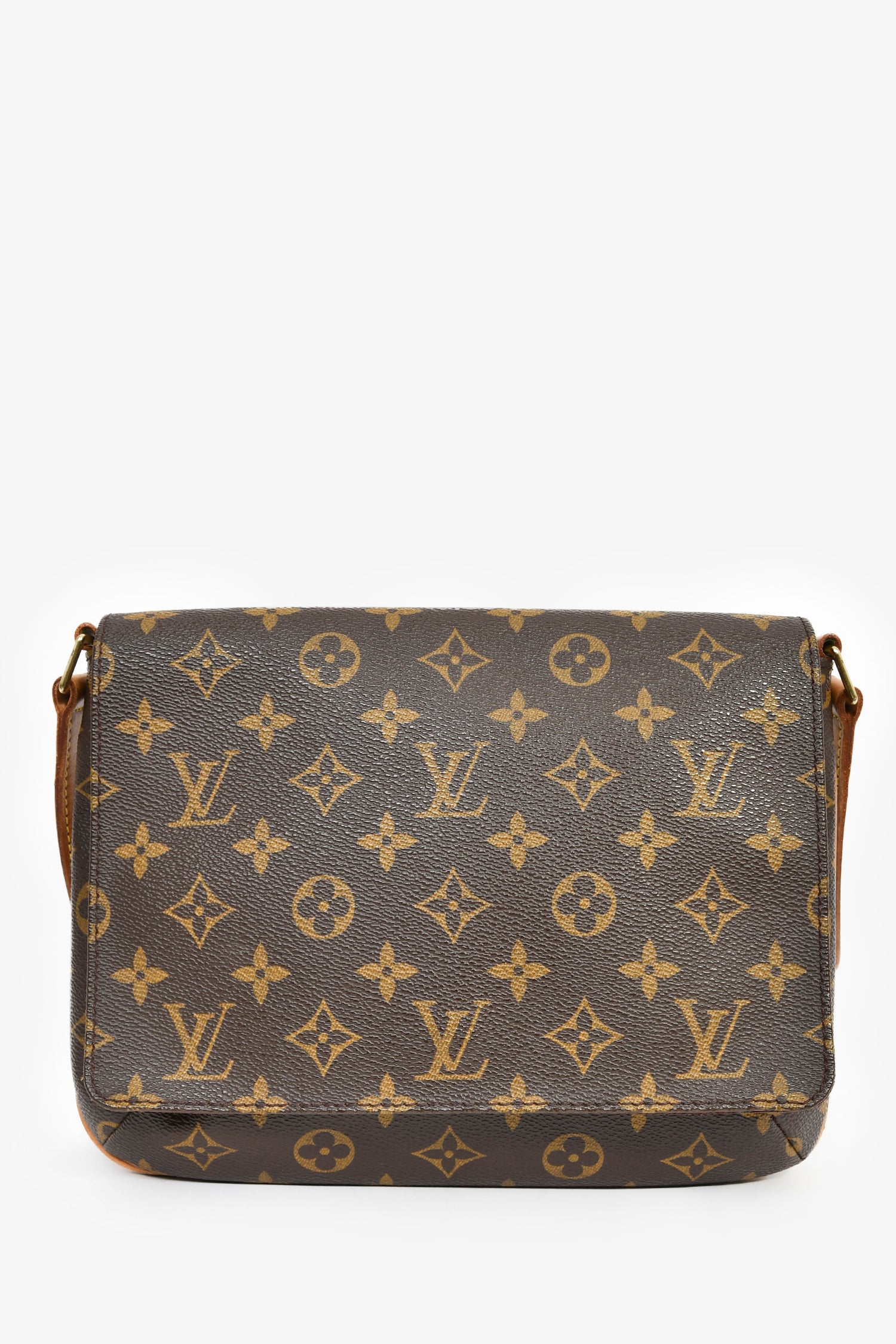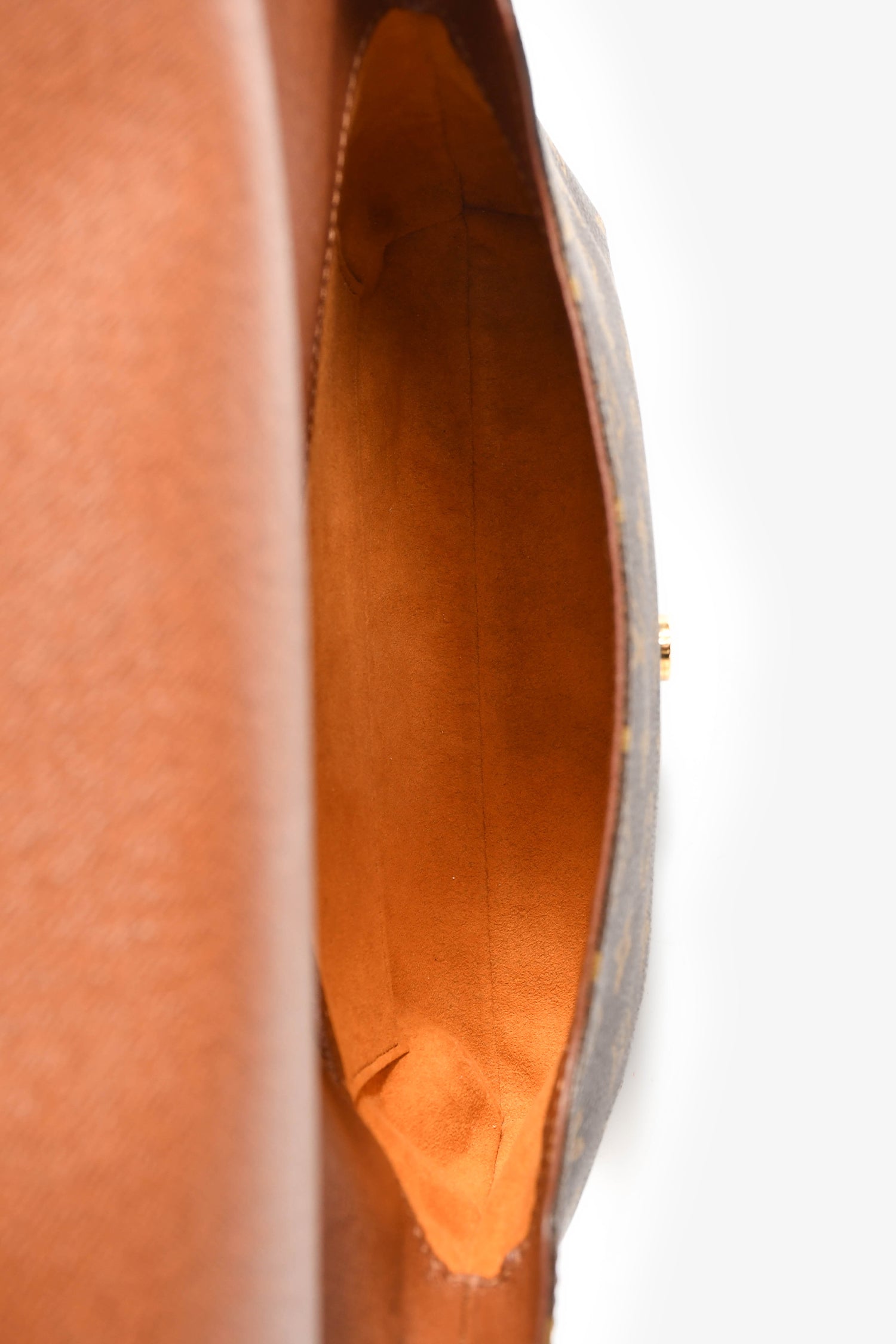 Refresh availabilityLouis Vuitton 1999 Brown Canvas Monogram Shoulder Bag. Front fold-over flap with snap-button closure. Leather shoulder strap. Lined suede interior with a slip compartment. Gold-tone hardware. Tonal and contrast stitching.