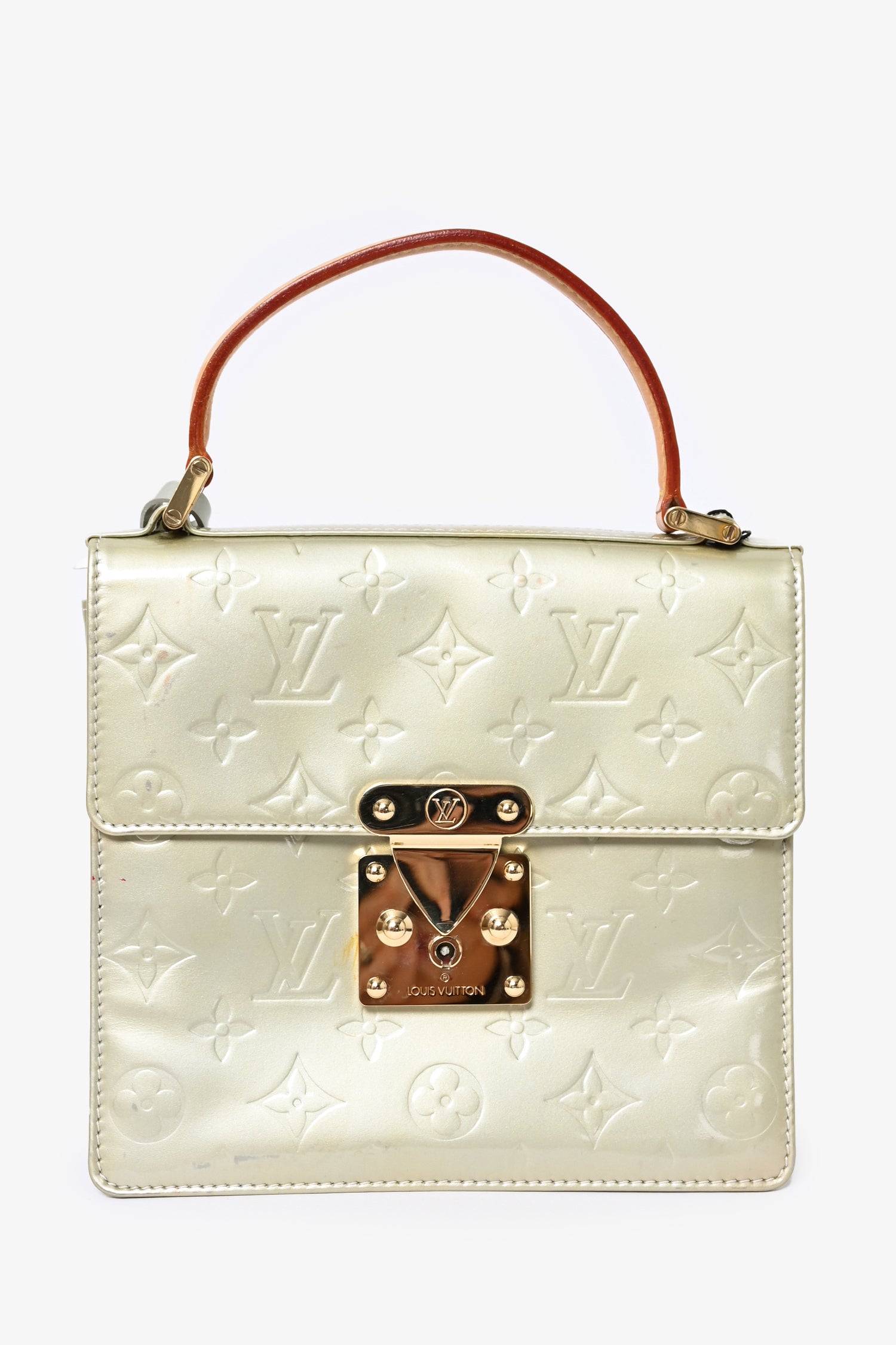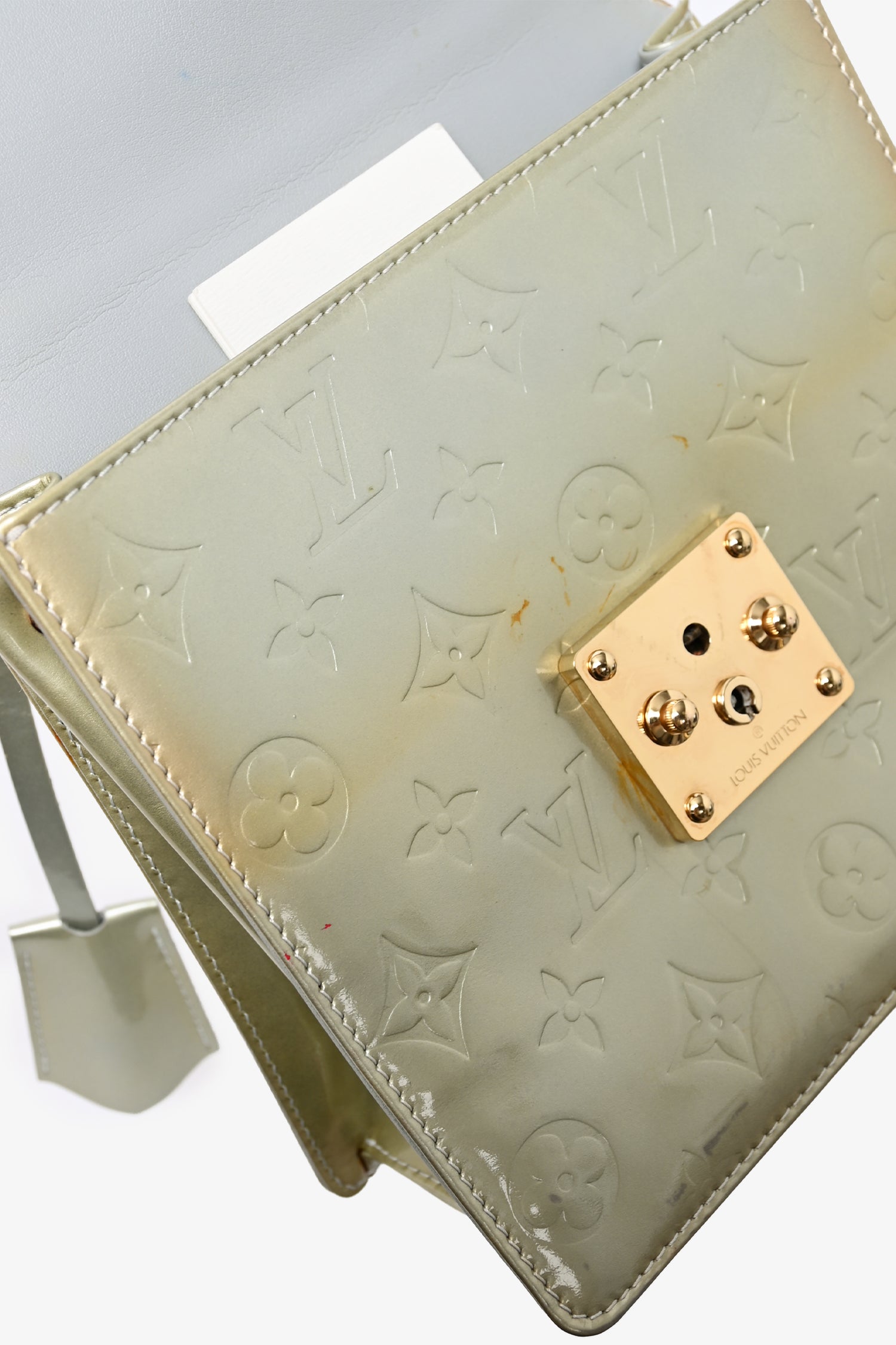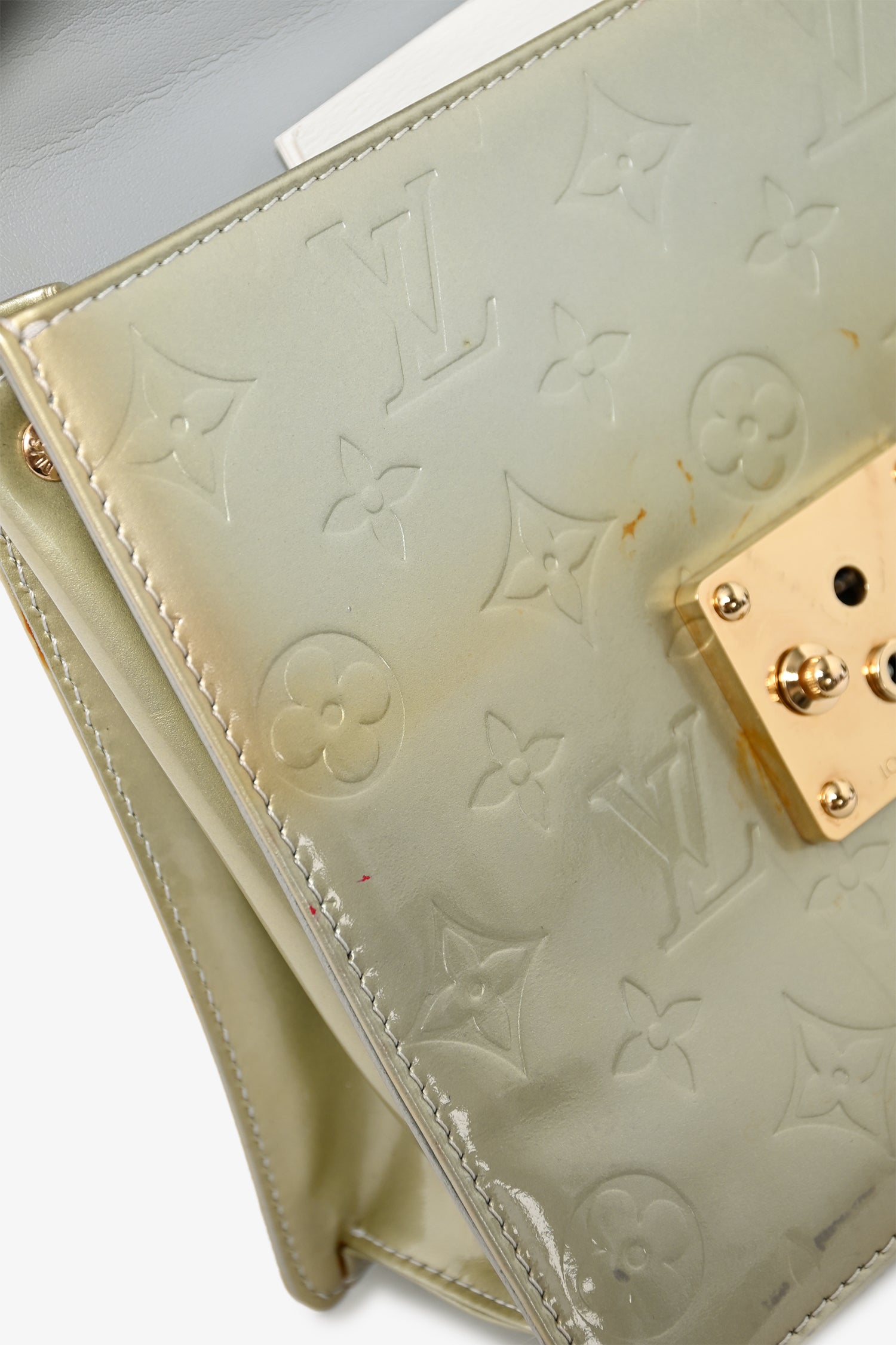Refresh availabilityLouis Vuitton 1999 Green Patent Vernis Monogram Spring Street Top Handle. Green vernis patent leather. Gold-toned push lock closure at front. Top handle with leather trimming. Tonal stitching. Blue smooth leather interior. Attached clochette.