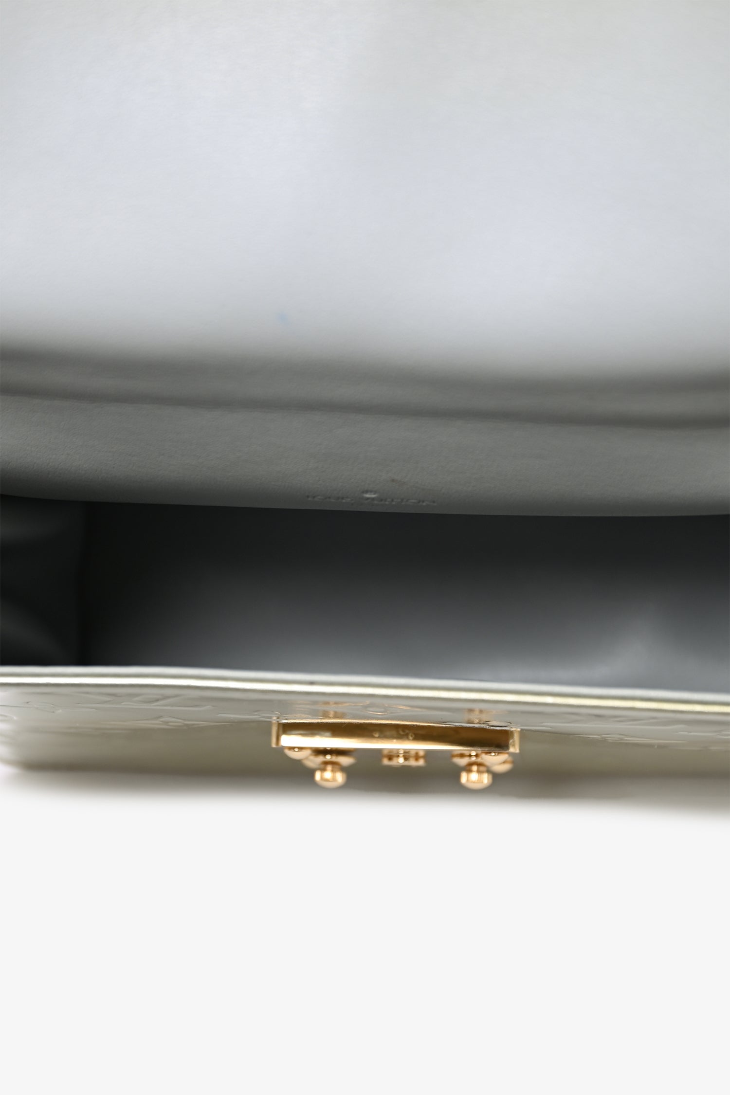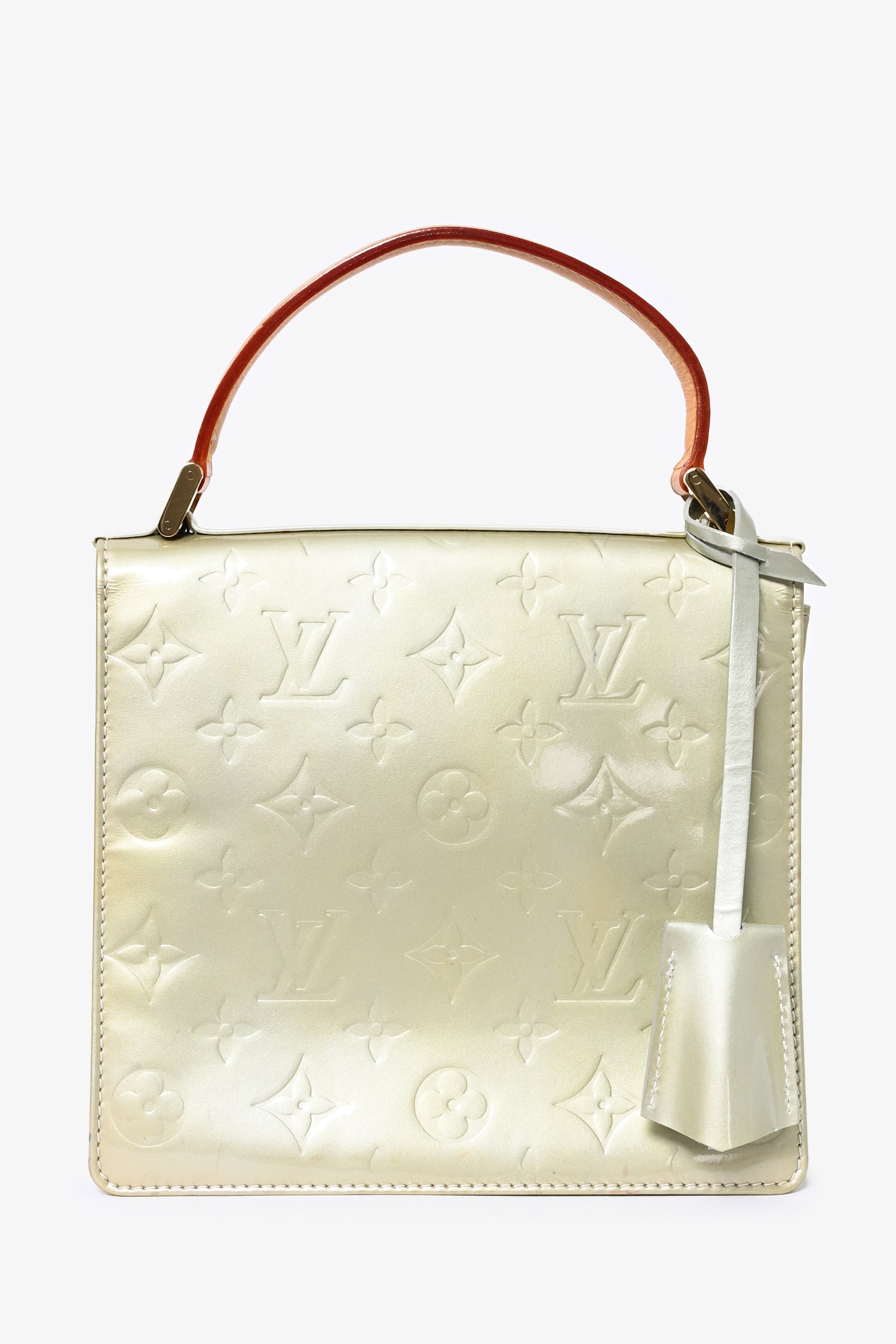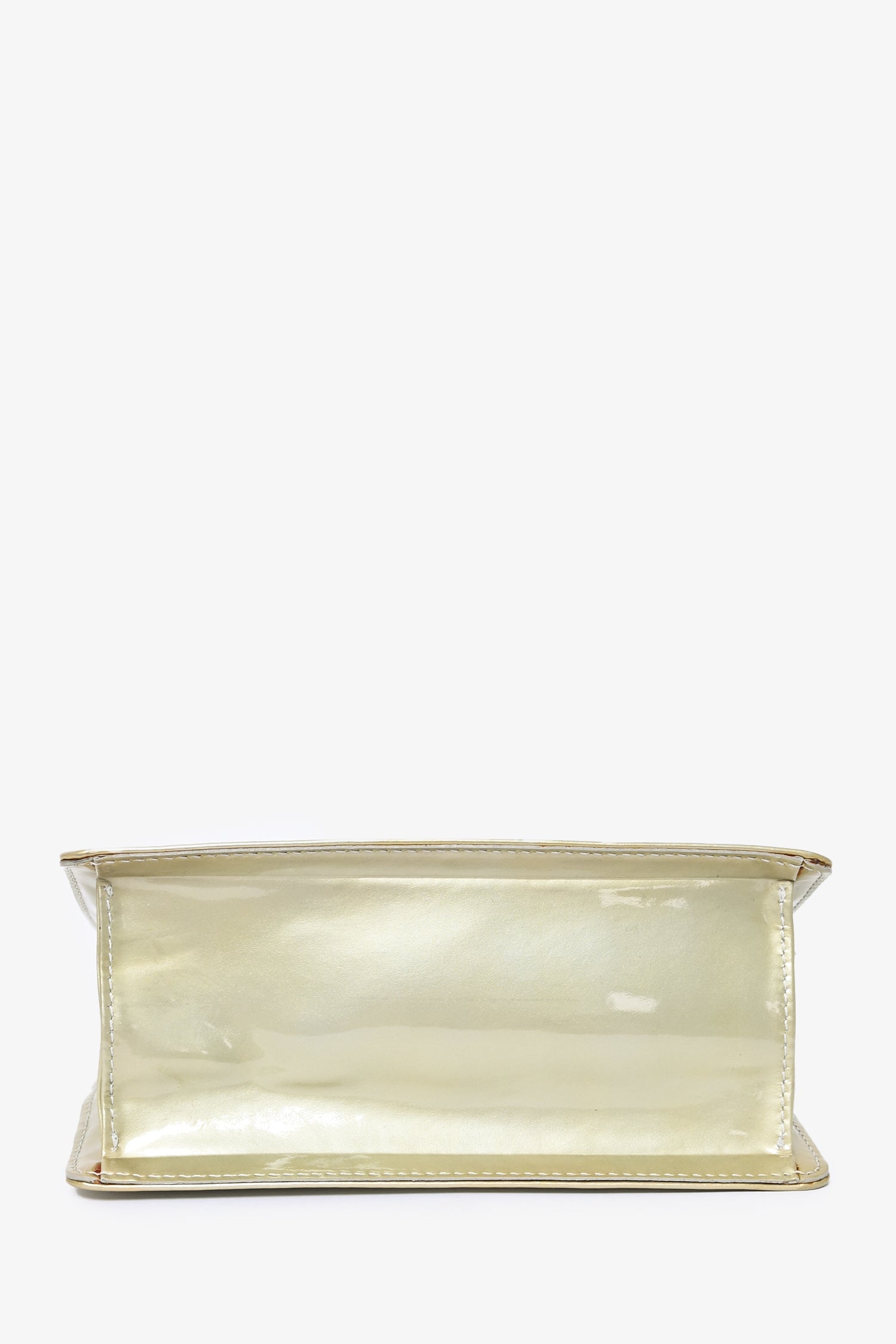 Refresh availabilityLouis Vuitton 1999 Green Patent Vernis Monogram Spring Street Top Handle. Green vernis patent leather. Gold-toned push lock closure at front. Top handle with leather trimming. Tonal stitching. Blue smooth leather interior. Attached clochette.