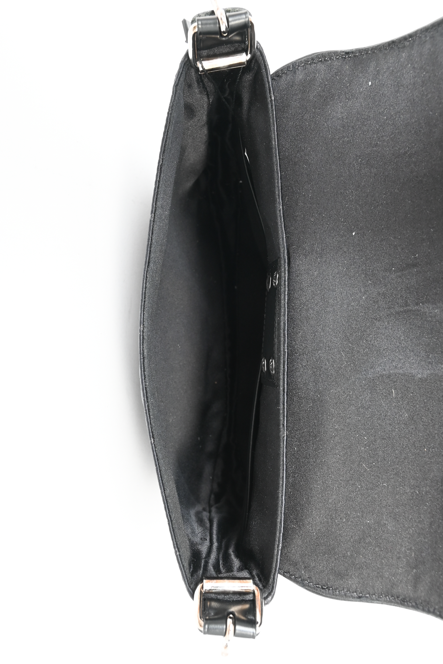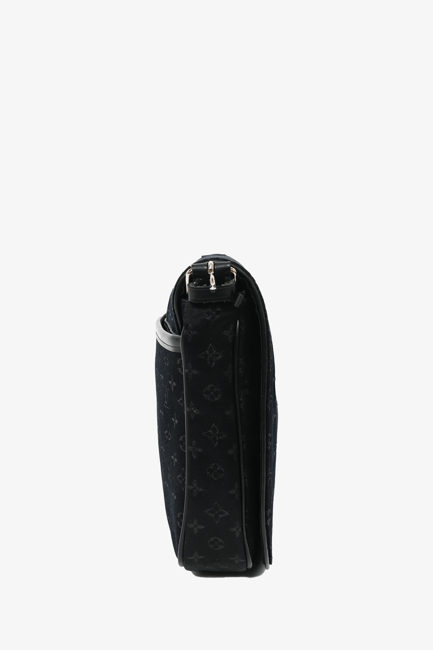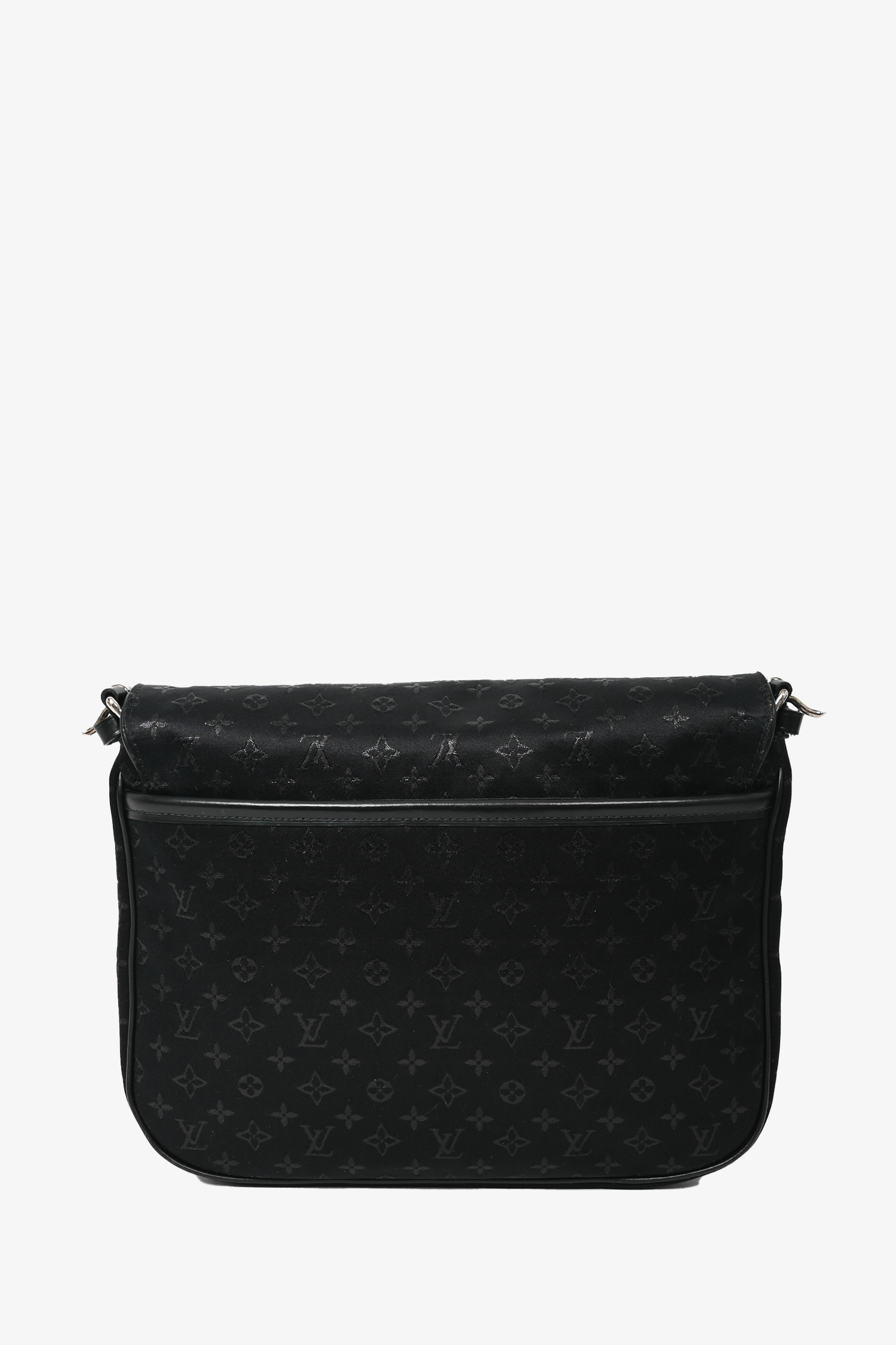 Louis Vuitton 2002 Black Monogram Satin Conte de Fées Crossbody Bag. 1 interior slip pocket. 1 exterior pocket. Fold over flap with magnetic button closure. Silver-tone hardware. Tonal stitching.