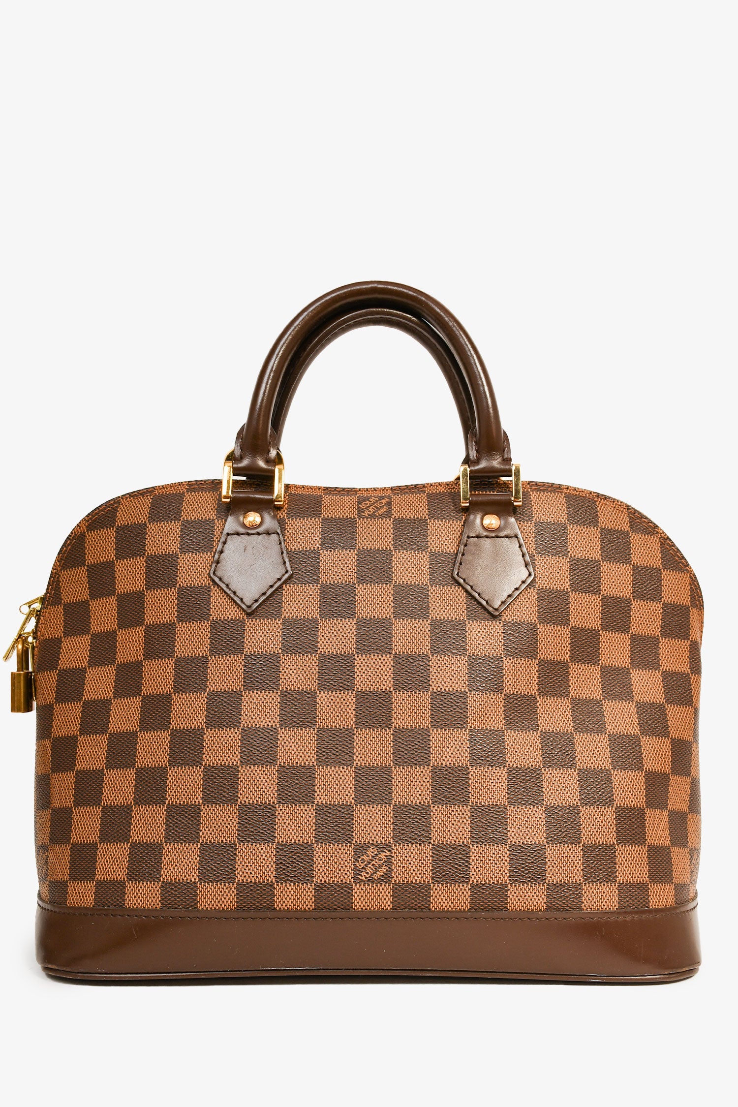 Refresh availabilityLouis Vuitton 2003 Ebene Damier MM Alma Top Handle Bag. Dual handles. Top zipper closure. Single interior compartment with a pen slot and a wall slip pocket. Adjustable and detachable strap. Gold-tone hardware. Textile lining. Tonal stitching.