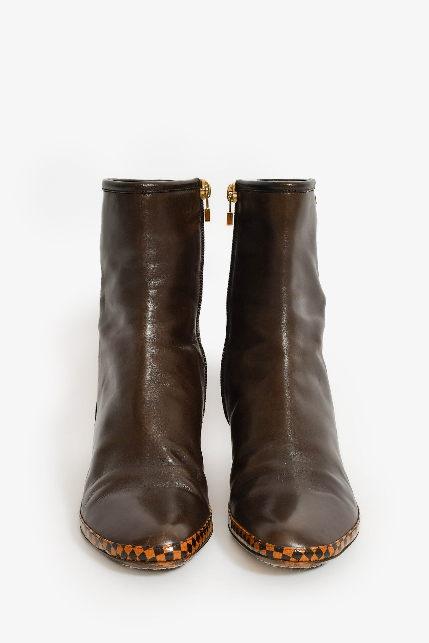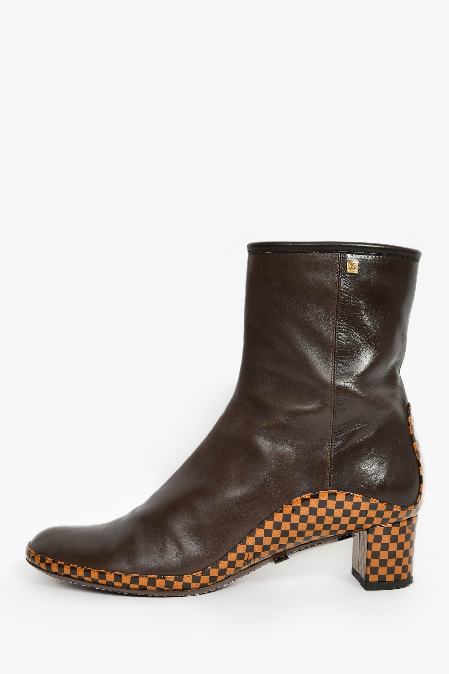 Refresh availabilityLouis Vuitton 2004 Brown Leather Checkered Ankle Boots. Slip-on. Side zip closure. Leather lined interior. Gold-tone hardware. Tonal stitching.