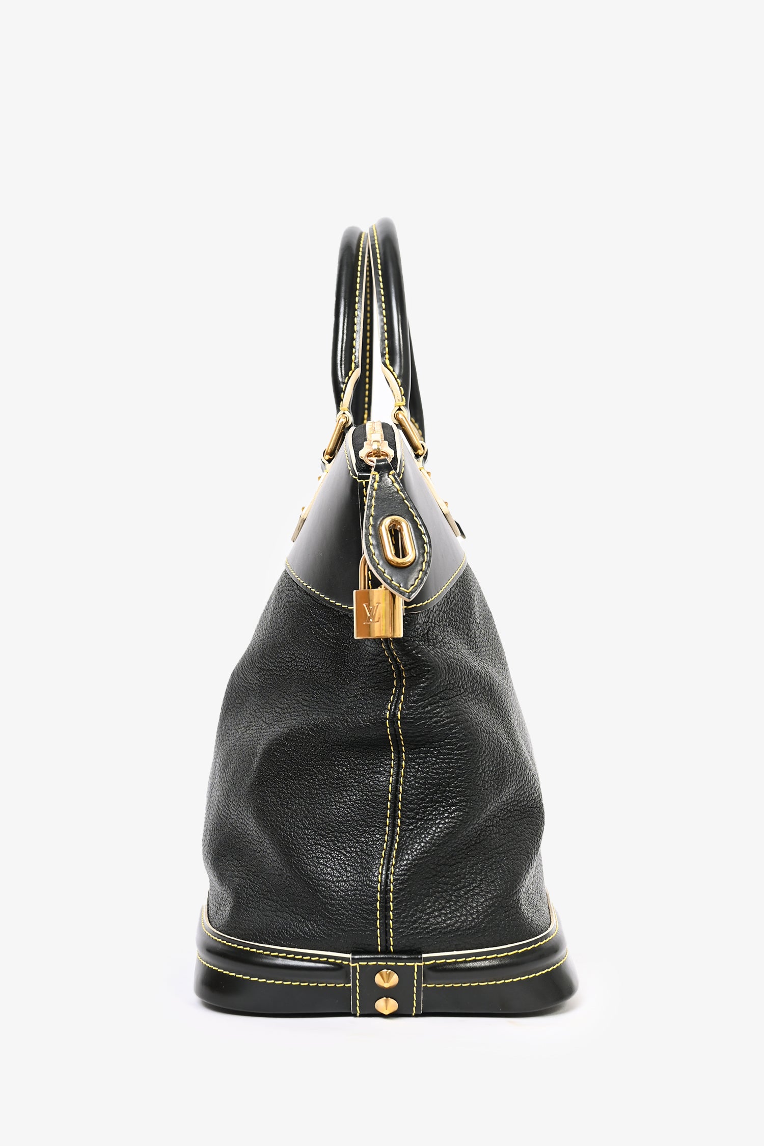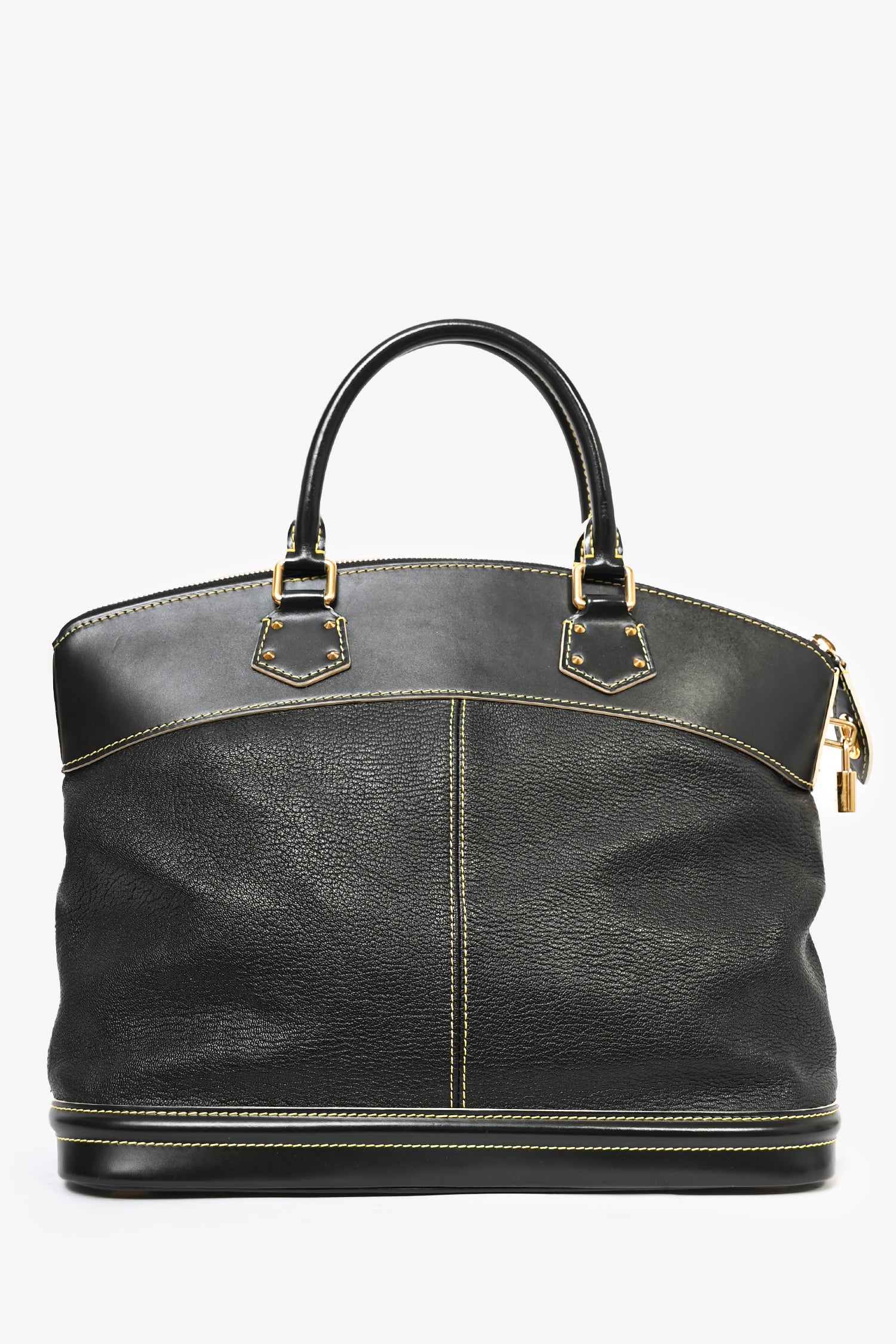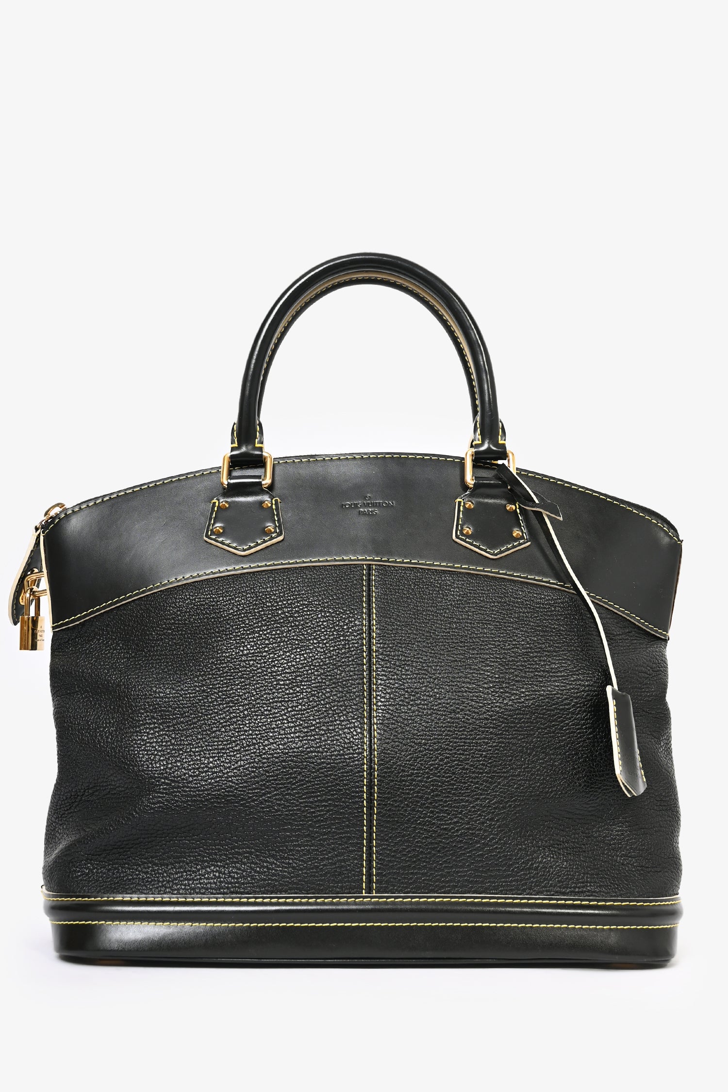 Refresh availabilityLouis Vuitton 2007 Black Leather Suhali Lockit MM Bag. Dual rolled handles. Top zip closure. Tonal monogrammed textile interior lining. 3 interior wall pockets; 2 slip and 1 with zip closure. Gold-tone hardware. Protective metal bottom. Detachable clochette.