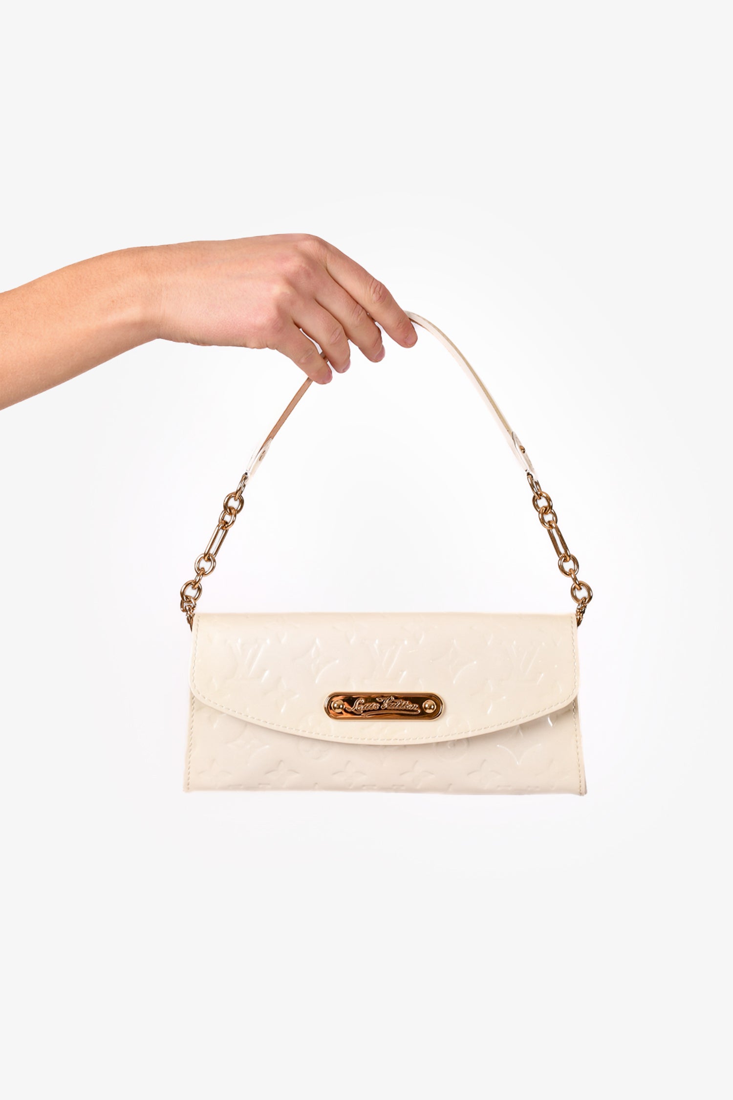 Louis Vuitton 2007 Cream Vernis Leather Sunset Boulevard Chain Shoulder Bag. Fold over flap closure with magnetic button closure. 6 card slips pockets. 1 interior zip pockets. Tonal stitching.