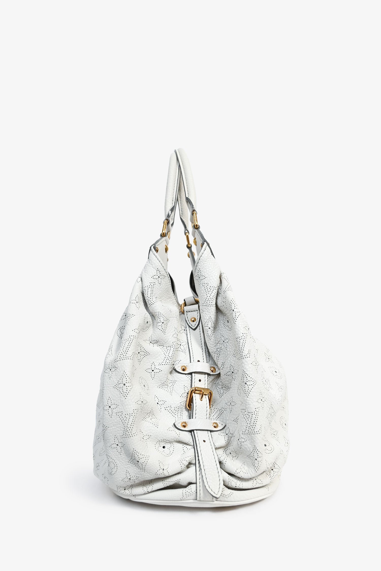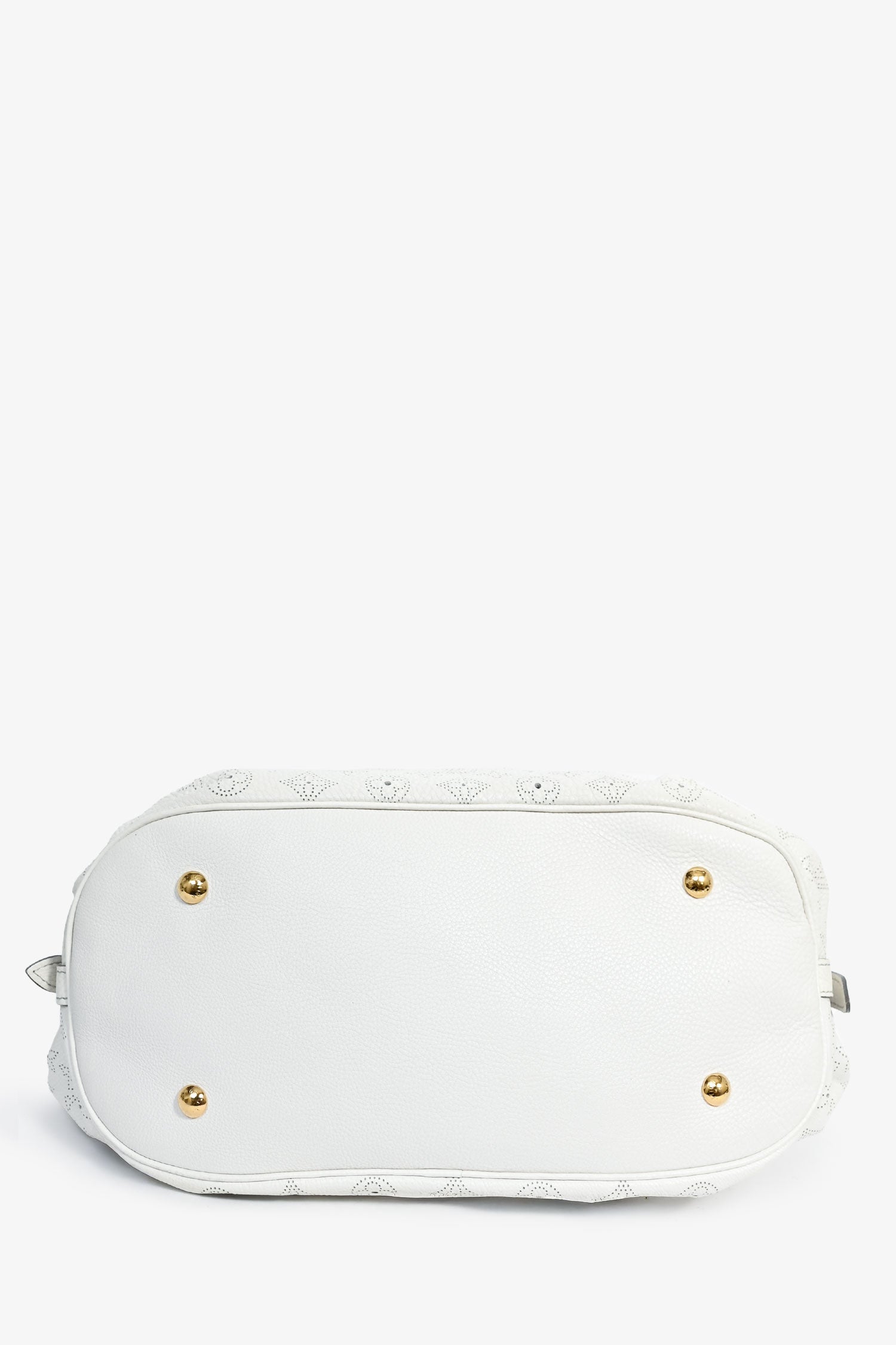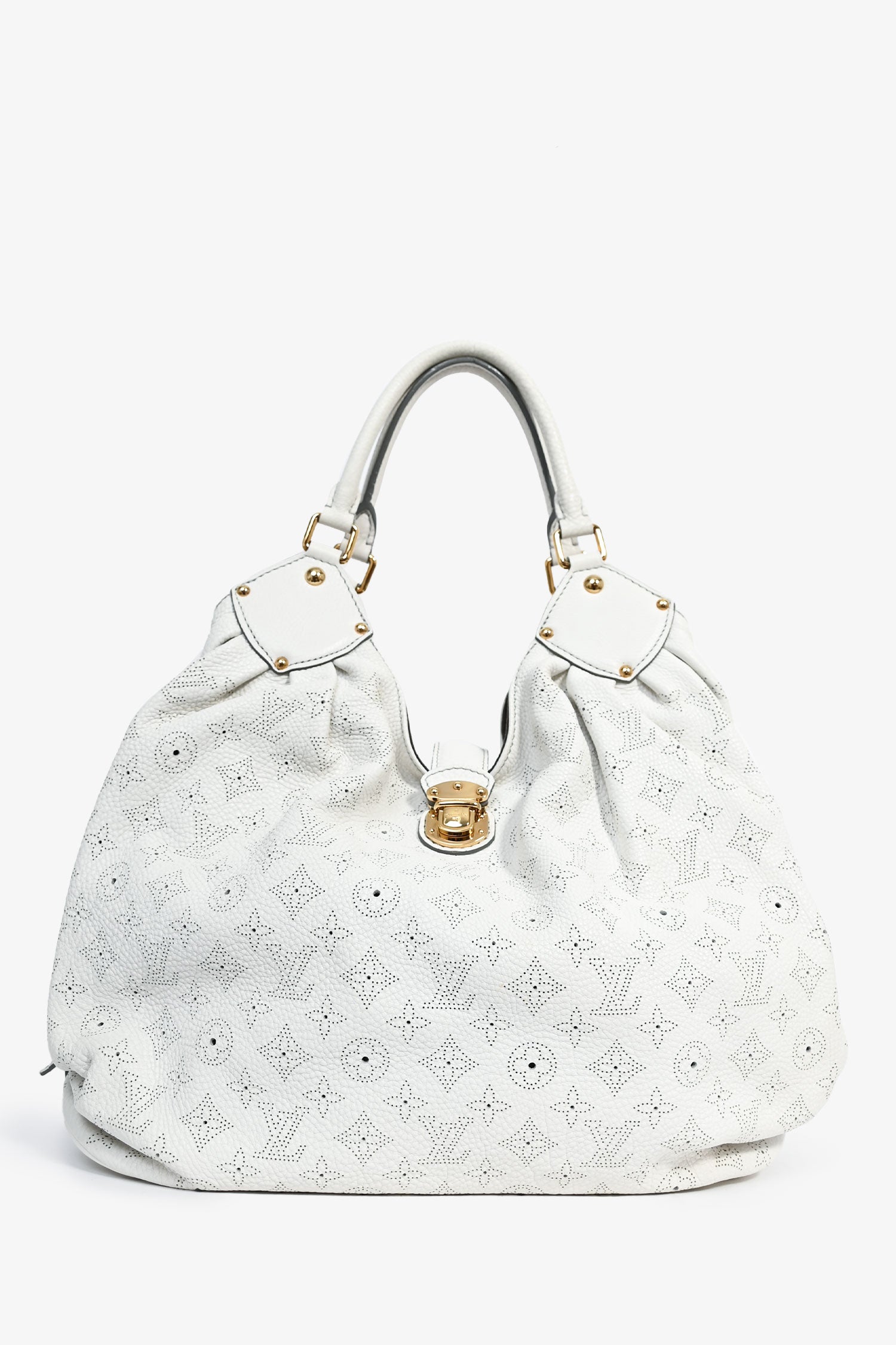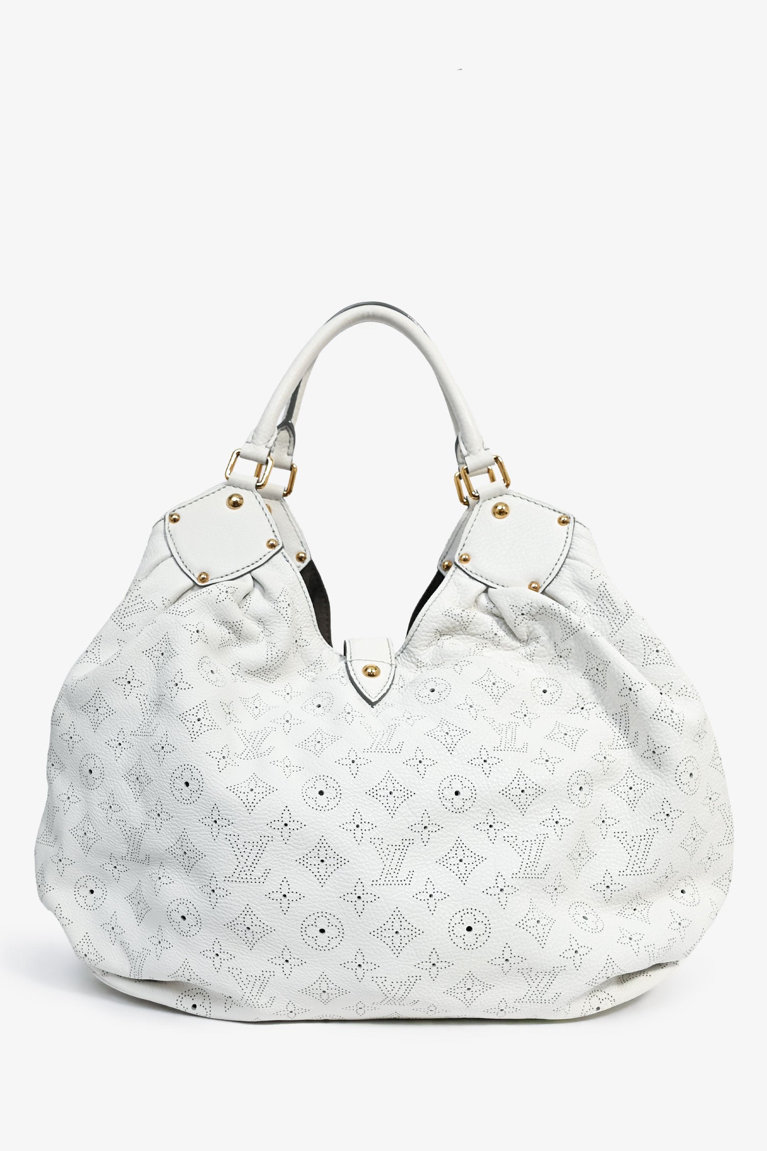 Refresh availabilityLouis Vuitton 2008 White Mahina Leather Hobo Bag. Rolled top handles. Gold-tone hardware. Fold-over strap with a pull-through push closure. Perforated detail. Lined interior with a zipped compartment. Coated trimming. Tonal stitching.