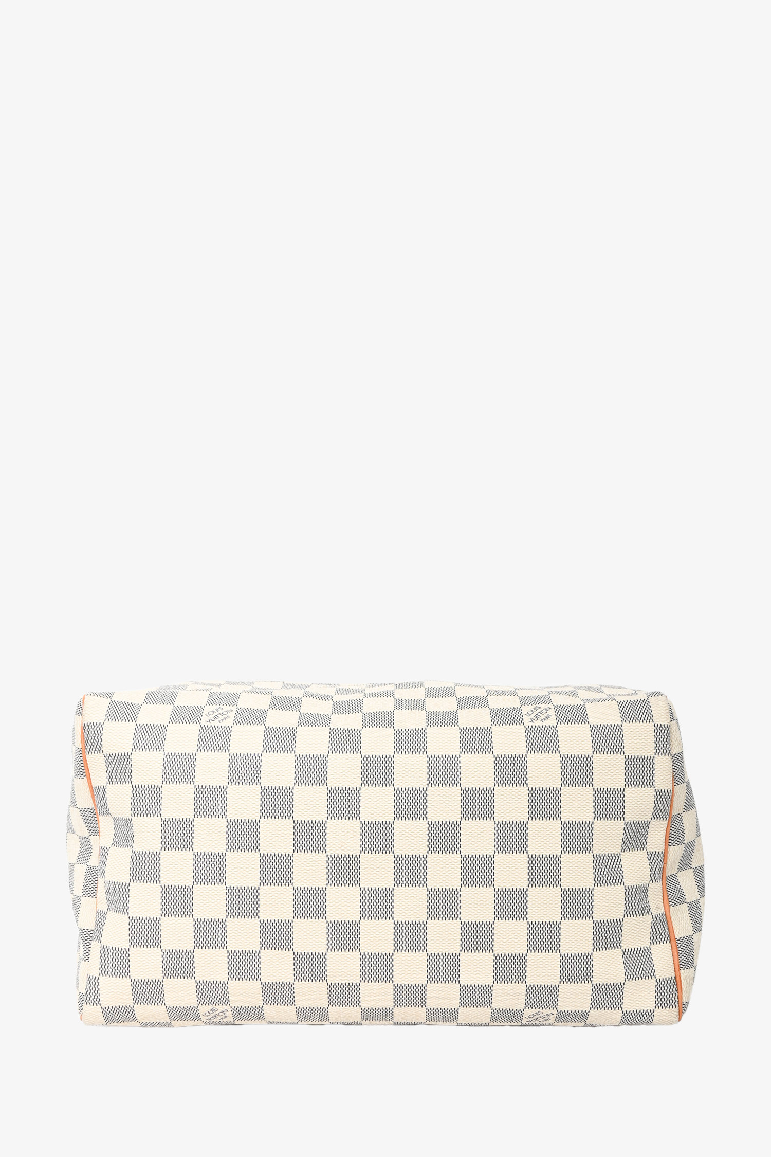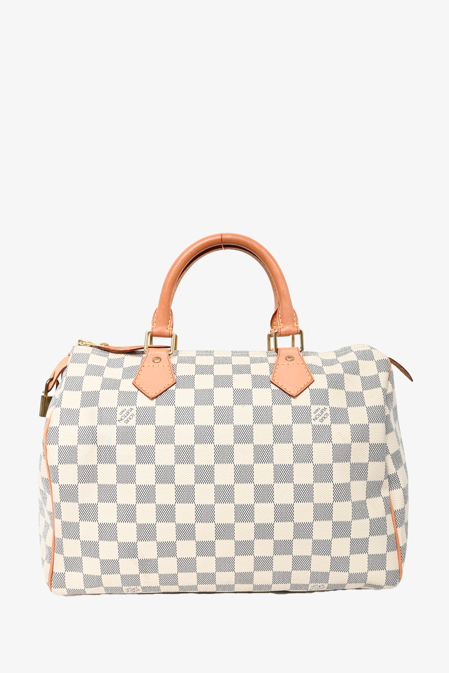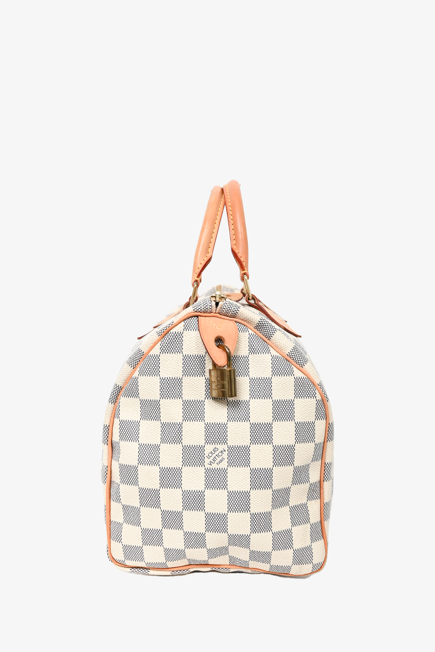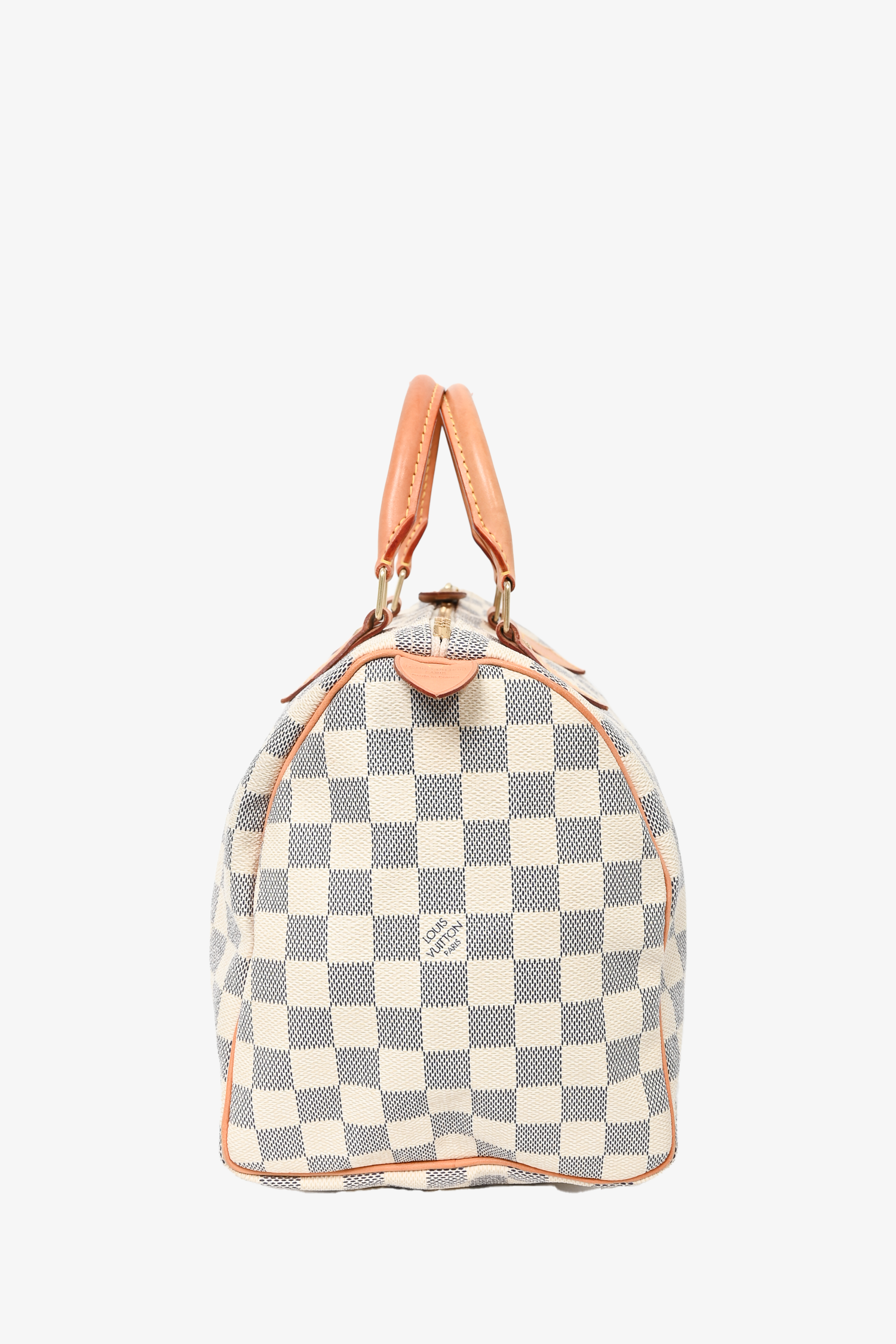 Refresh availabilityLouis Vuitton 2008 Damier Azur Speedy 30. Top zip closure. Twin top handles. 1 interior slip pocket. Gold-tone hardware. Contrast stitching.
