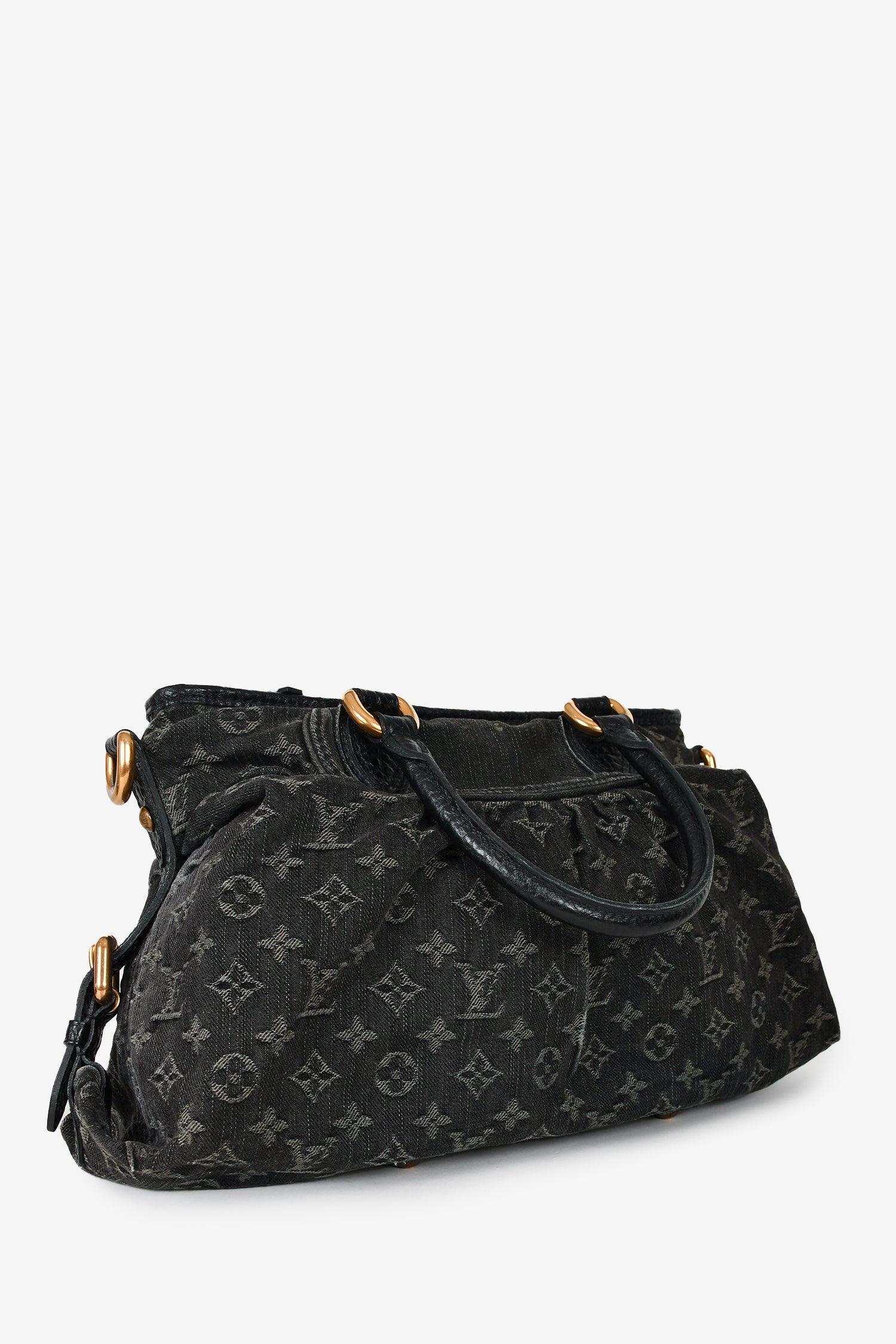 Refresh availabilityLouis Vuitton 2009 Black Denim Monogram 'Neo Cabby' MM. Dual rolled handles. Top zip closure. Dark yellow textile interior lining. 2 interior wall slip pockets. Removable and adjustable strap. Protective metal bottom. Gold-tone hardware. Tonal stitching.