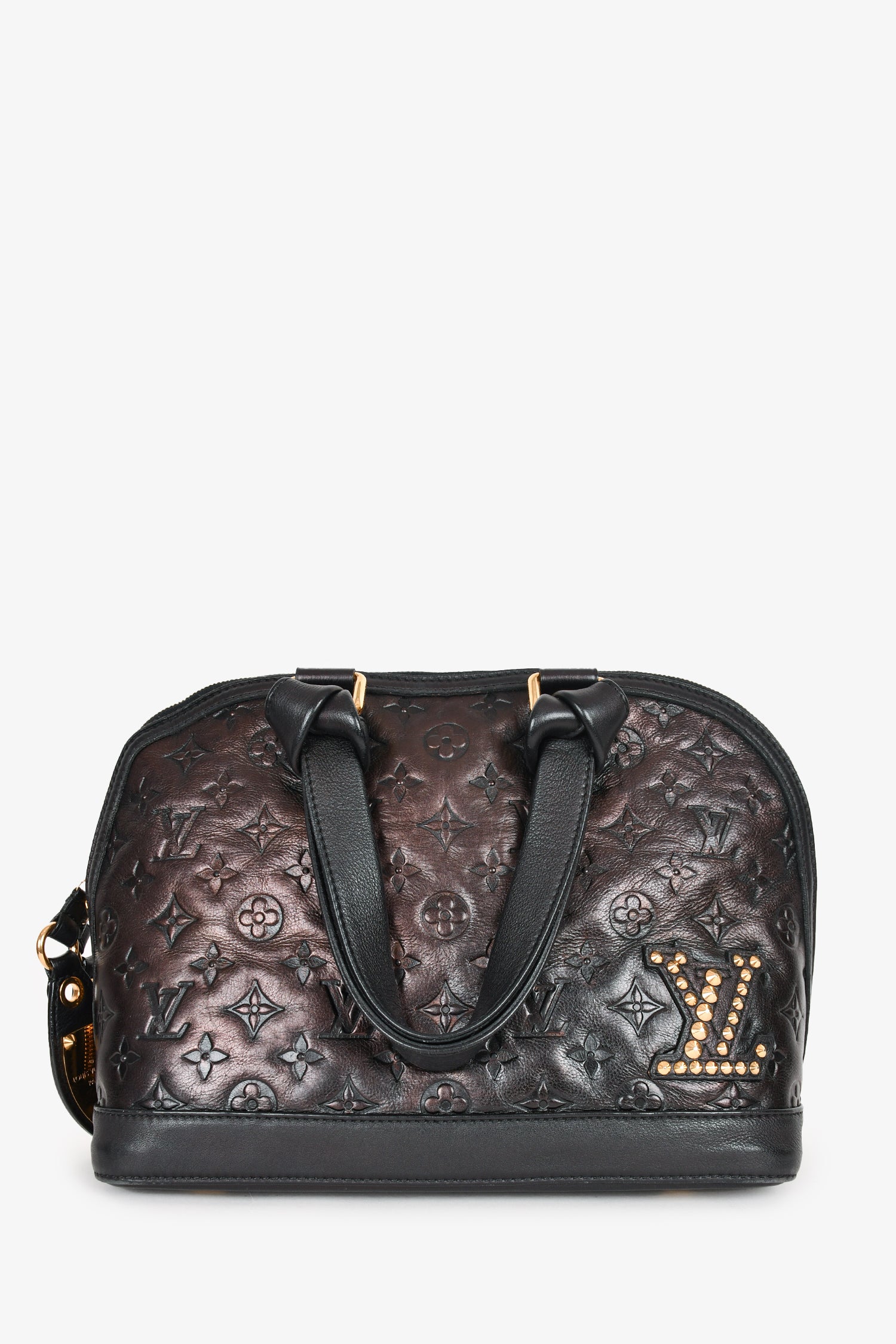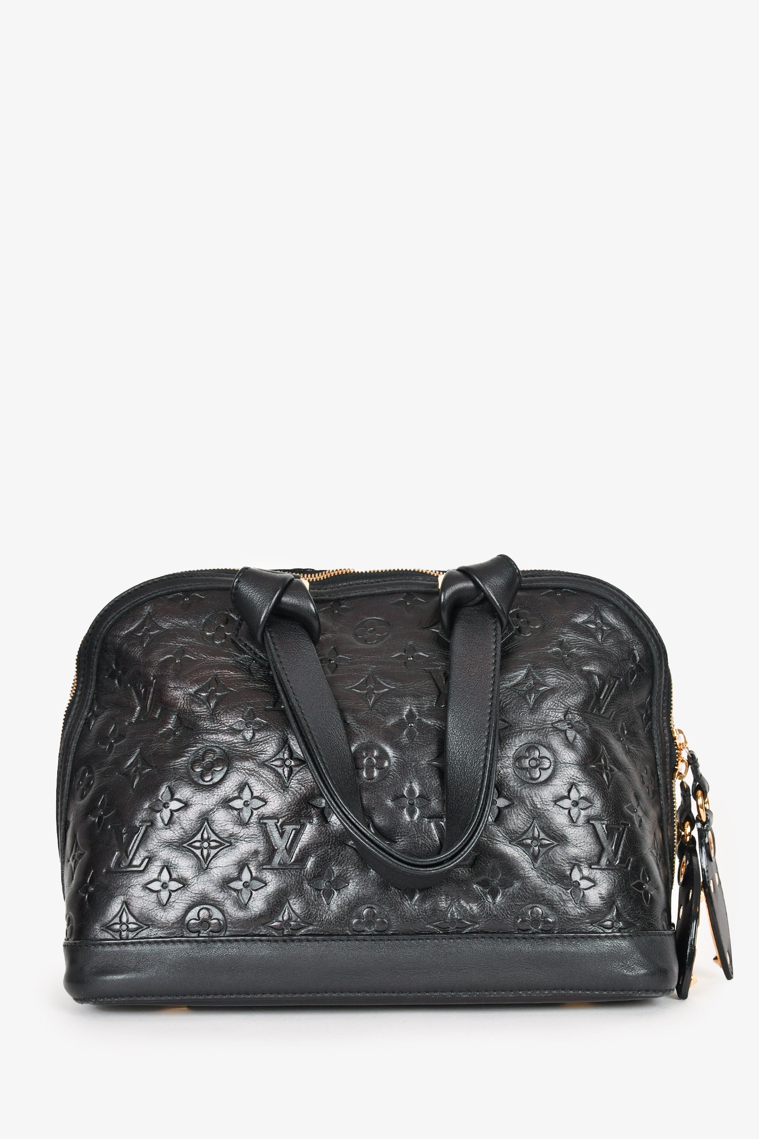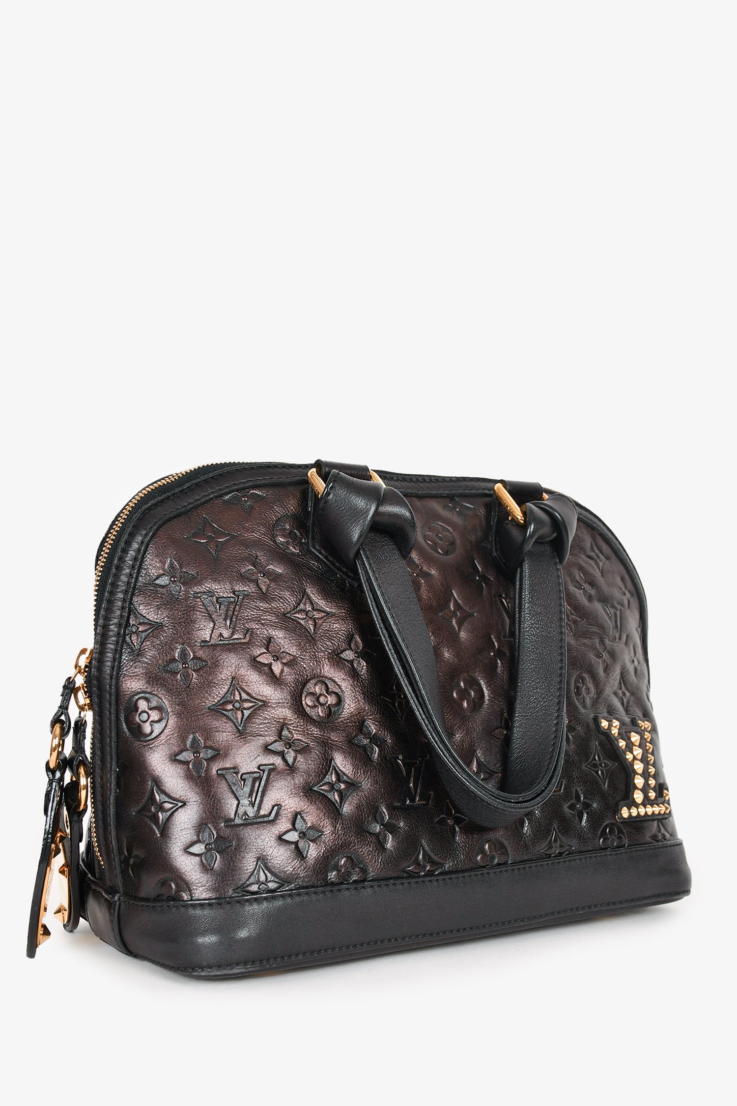 Refresh availabilityLouis Vuitton 2009 Black Leather 'Jeu Neo Alma' Bag with Tote Bag. LV logo in gold studs at front. Dual handles with knot design at hardware. Top double zip closure. Black textile interior lining. Single interior wall zip pocket. Gold-tone hardware. Protective metal bottom. Tonal stitching.
