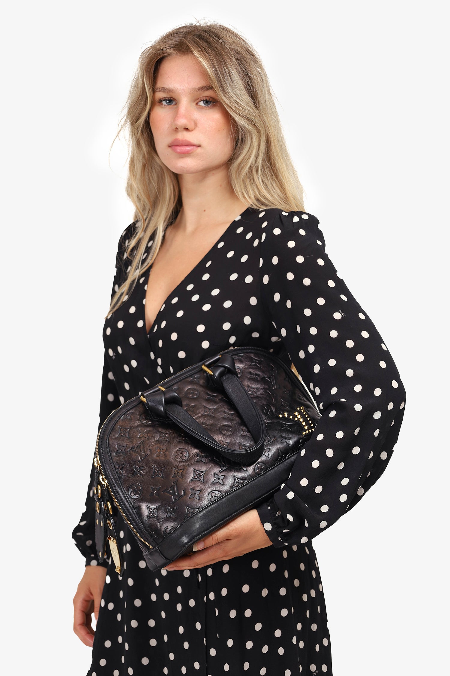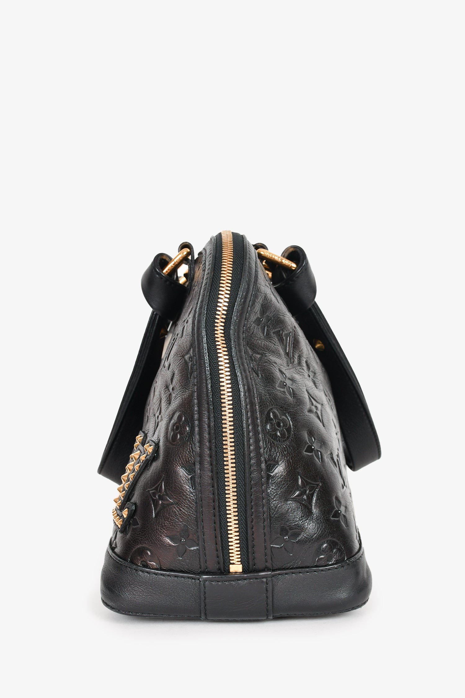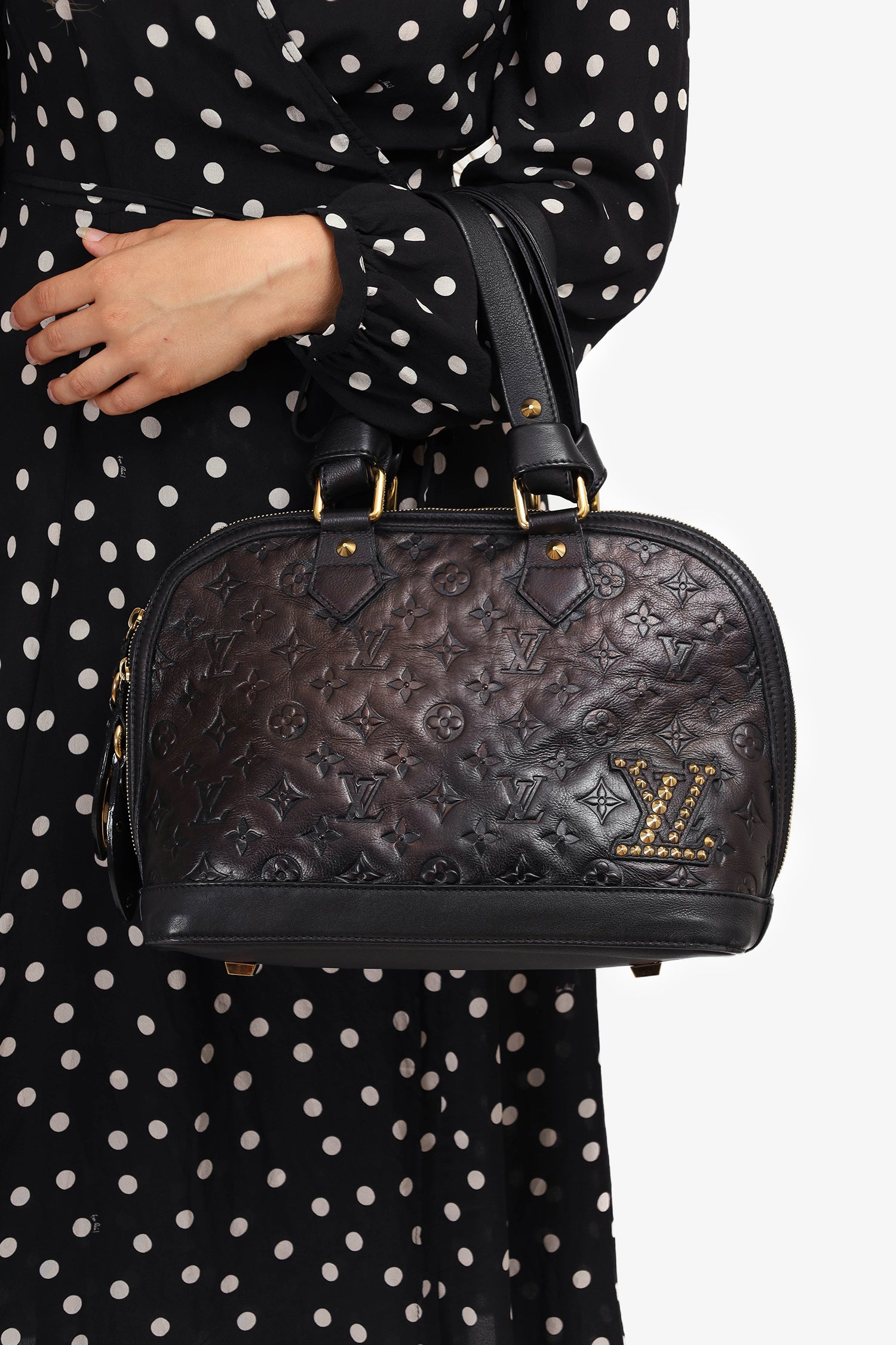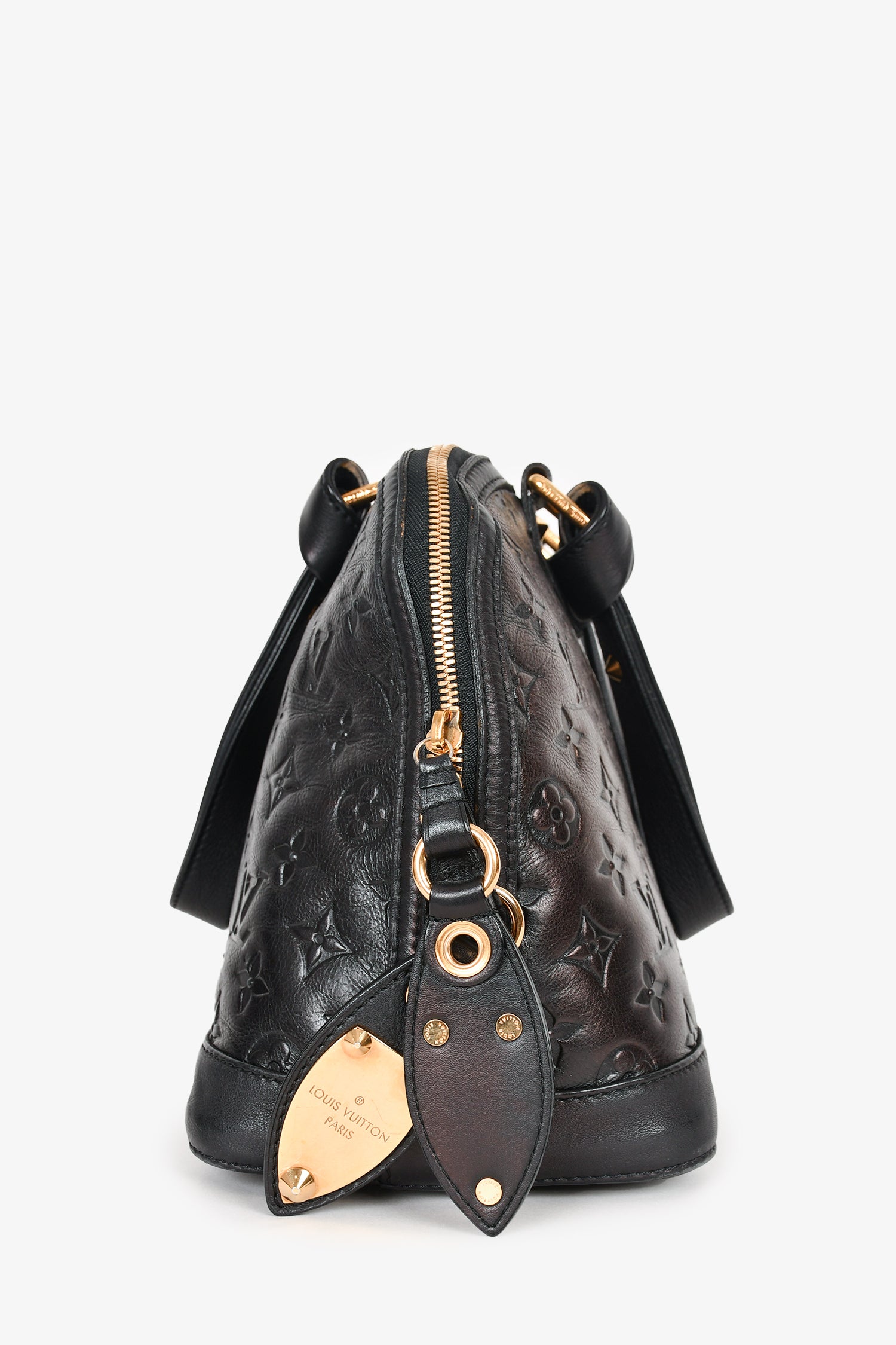 Refresh availabilityLouis Vuitton 2009 Black Leather 'Jeu Neo Alma' Bag with Tote Bag. LV logo in gold studs at front. Dual handles with knot design at hardware. Top double zip closure. Black textile interior lining. Single interior wall zip pocket. Gold-tone hardware. Protective metal bottom. Tonal stitching.