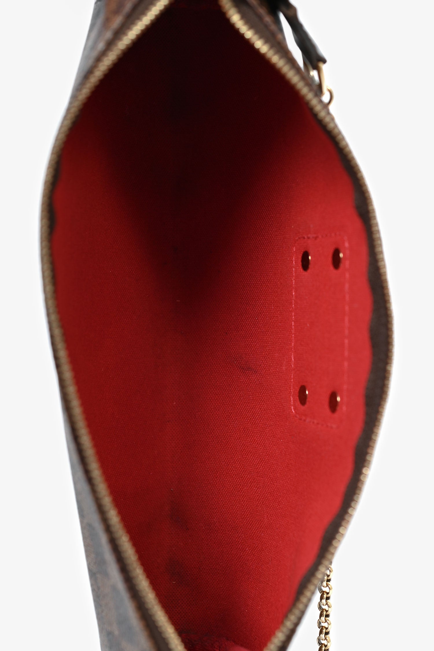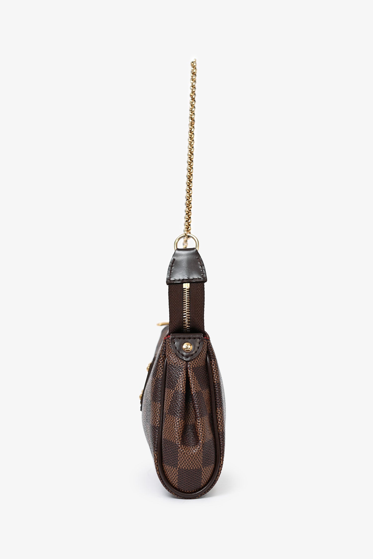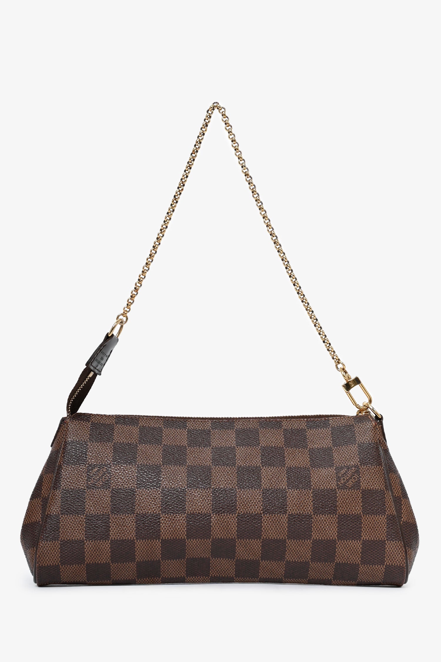 Refresh availabilityLouis Vuitton 2010 Damier Ebene Eva Pochette. Gold-tone hardware. Chain-link shoulder strap. Zipped top opening. Leather trimming. Coated trimming. Red contrast lined interior. Tonal stitching.
