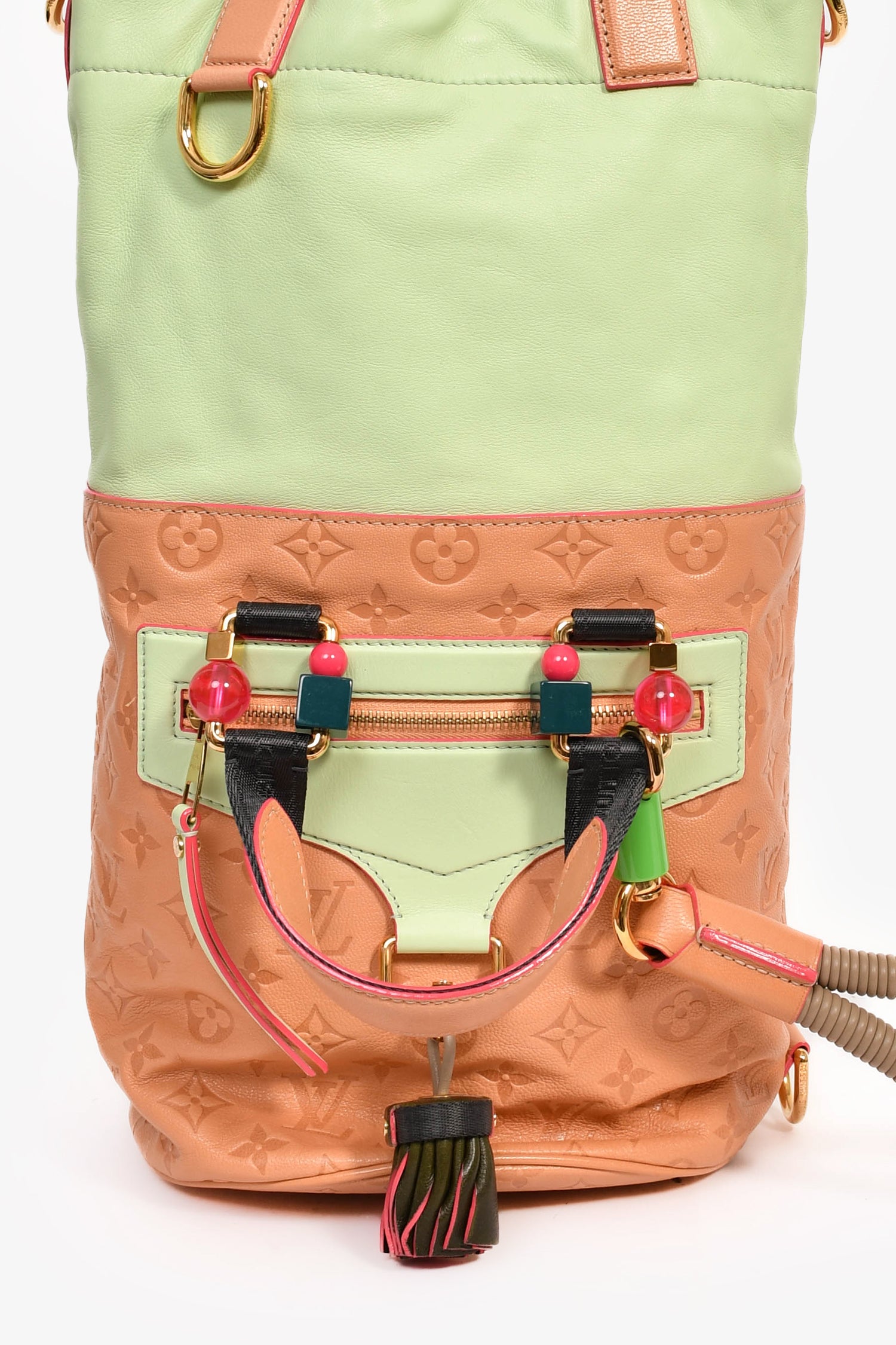 Refresh availabilityLouis Vuitton 2010 Green/Peach Limited Edition Monogram Empreinte Underground Duffle Bag. Top open. Dual handles with bead detailing. Detachable shoulder strap. Front zip pocket. Textile-lined interior. Single interior wall zip pocket. Gold-tone hardware. Tonal stitching.
