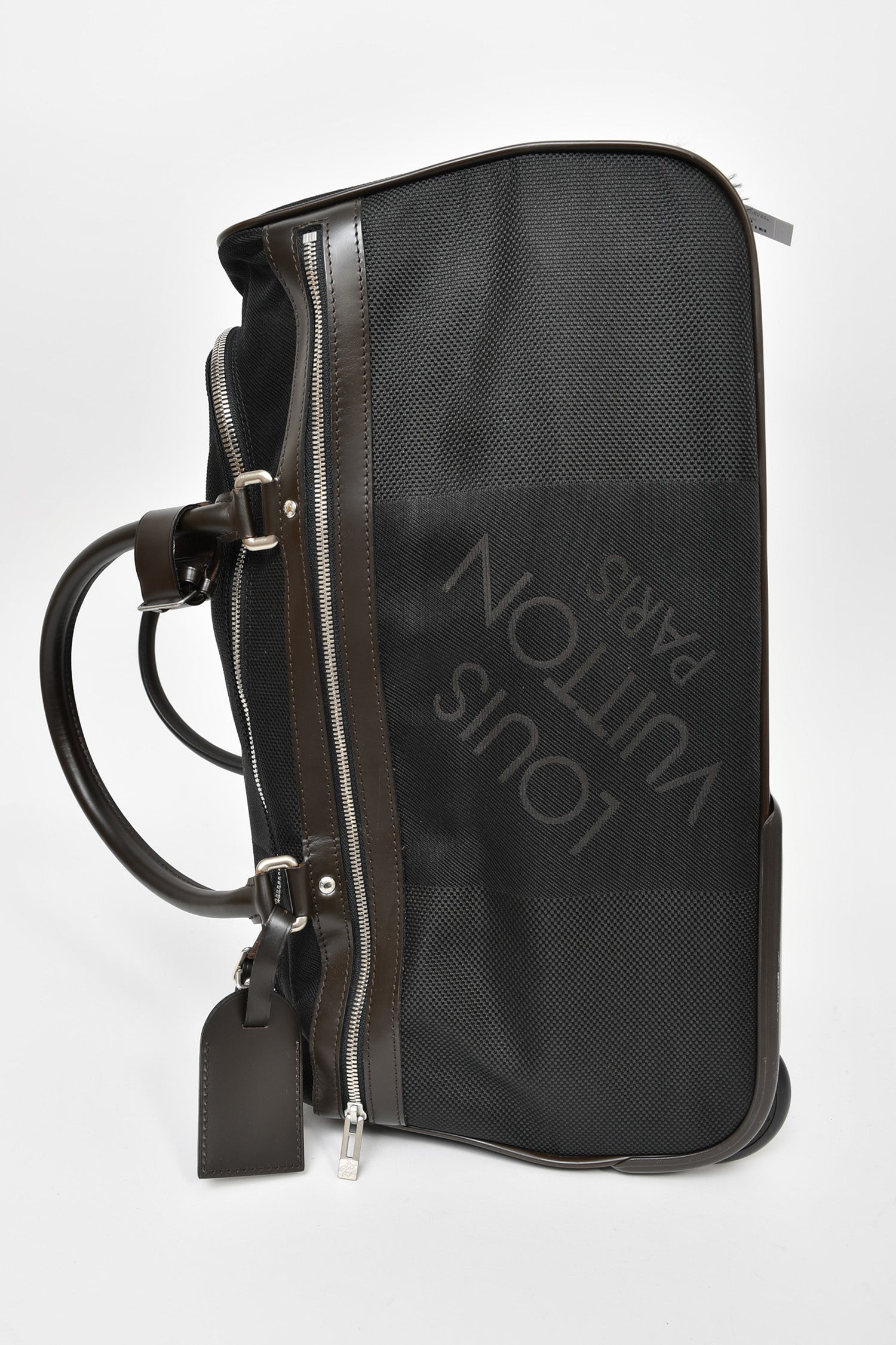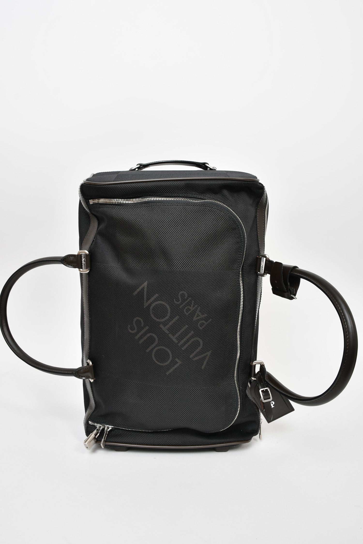 Refresh availabilityLouis Vuitton 2011 Black Damier Geant Eole 50 Rolling Duffle Bag. Twin rolled top handles for duffle usage, single top handle for suitcase usage. Double zip closure with padlock. 1 large zip exterior pocket. Brown nylon interior with two slip pockets. Lining removable with zipper. Retractable handle with zipper closure. Silver-tone hardware. Tonal stitching. Also comes with personalized luggage tag, embossed in silver foil with 'D P'.