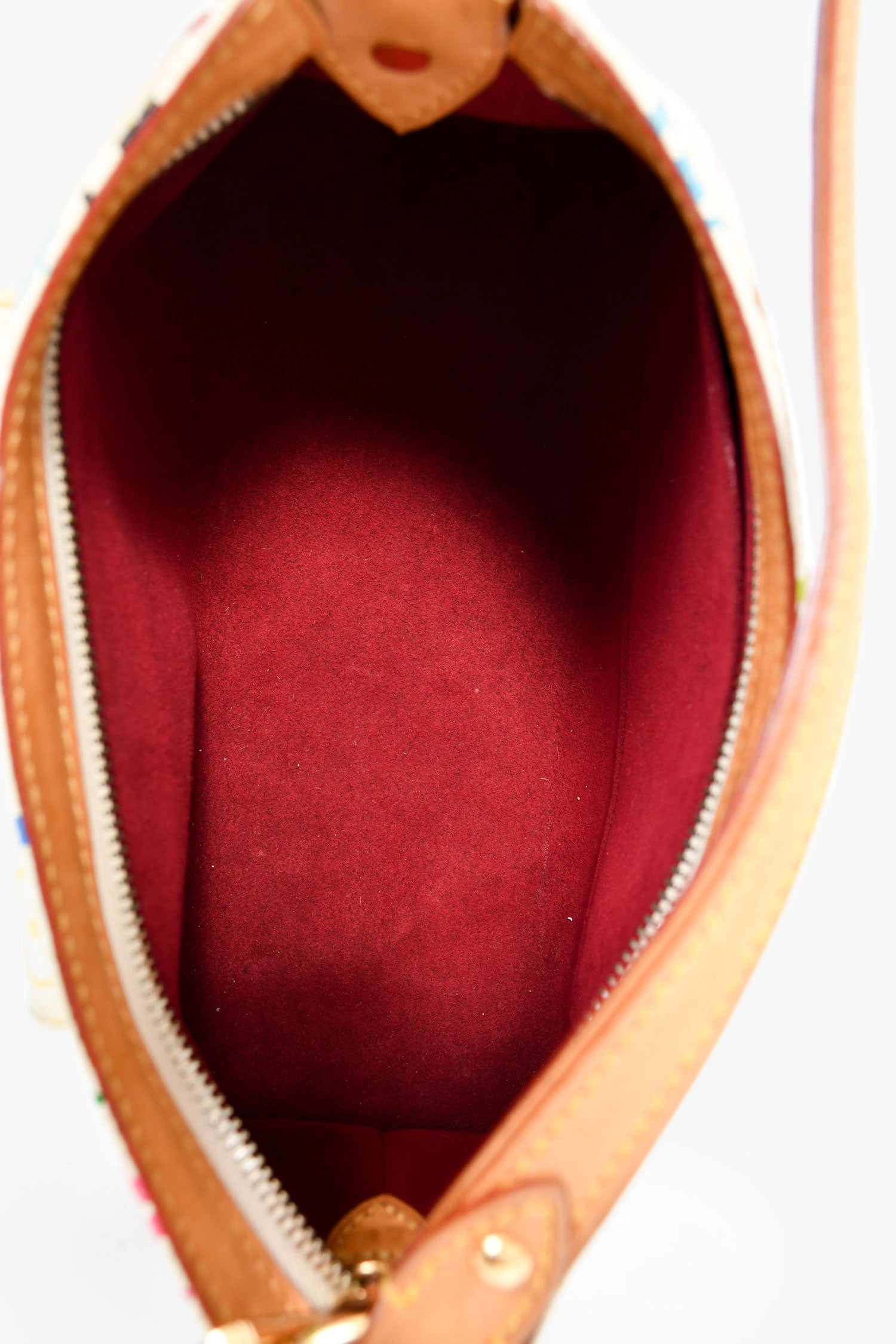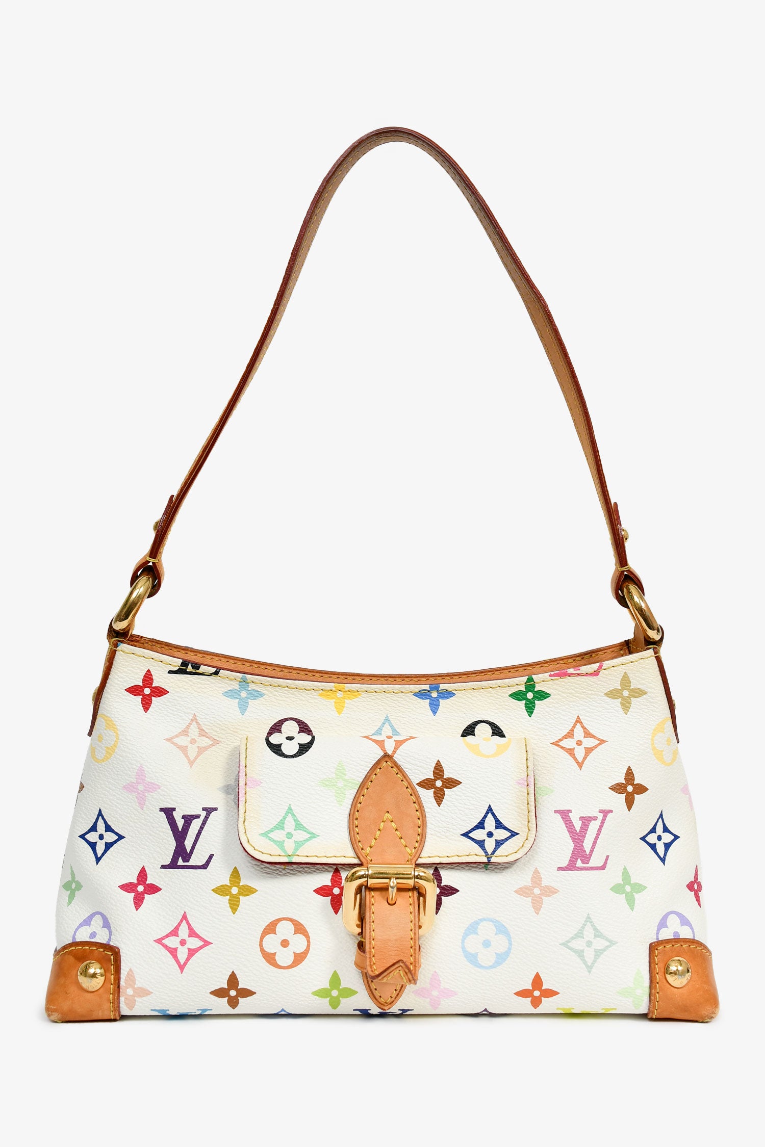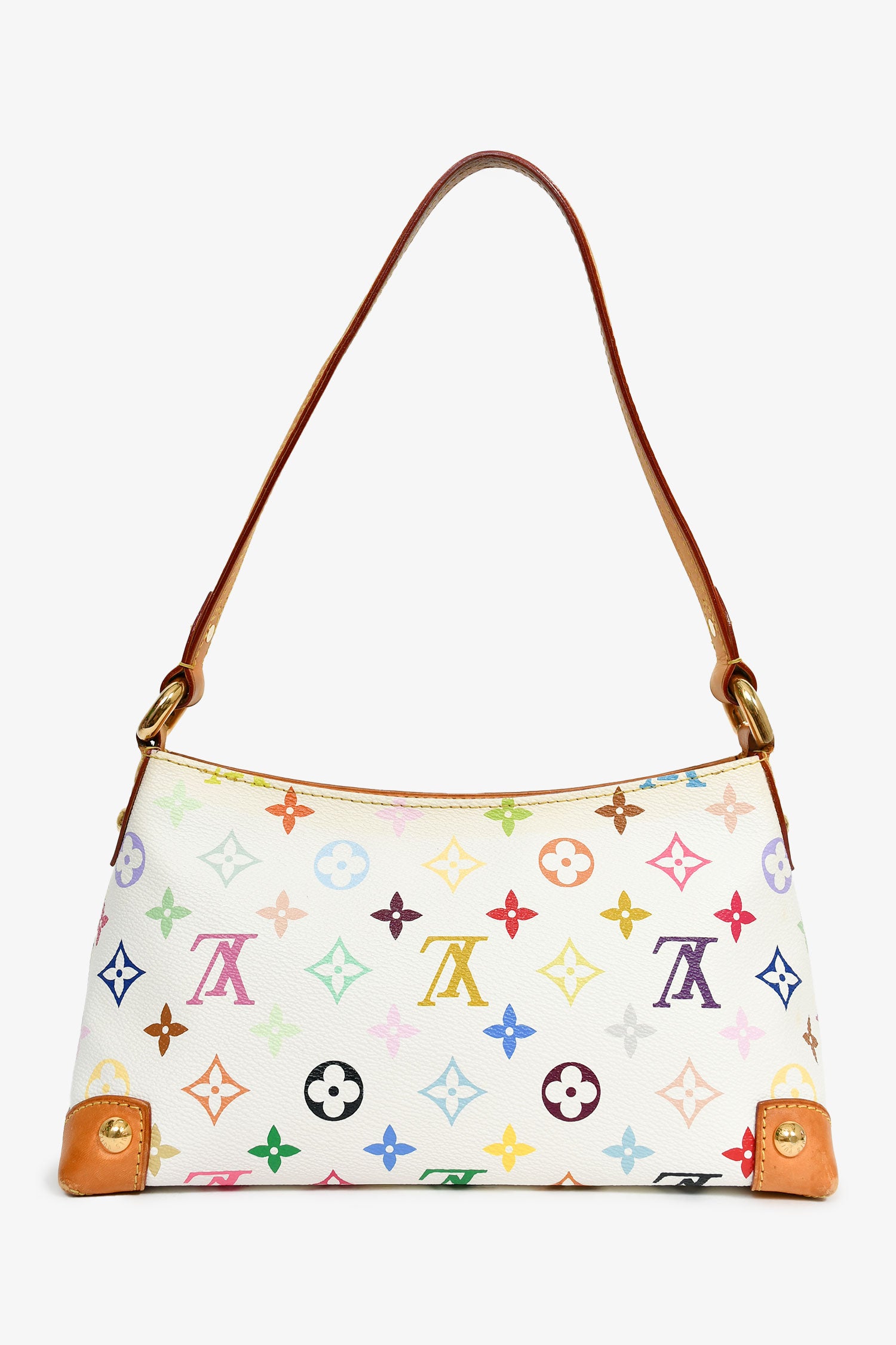 Refresh availabilityLouis Vuitton 2006 White/Multicolour Monogram 'Eliza' Shoulder Bag. Top zip closure. Single shoulder strap. Exterior slip compartment. Lined suede interior with a slip compartment. Gold-tone hardware. Contrast stitching.