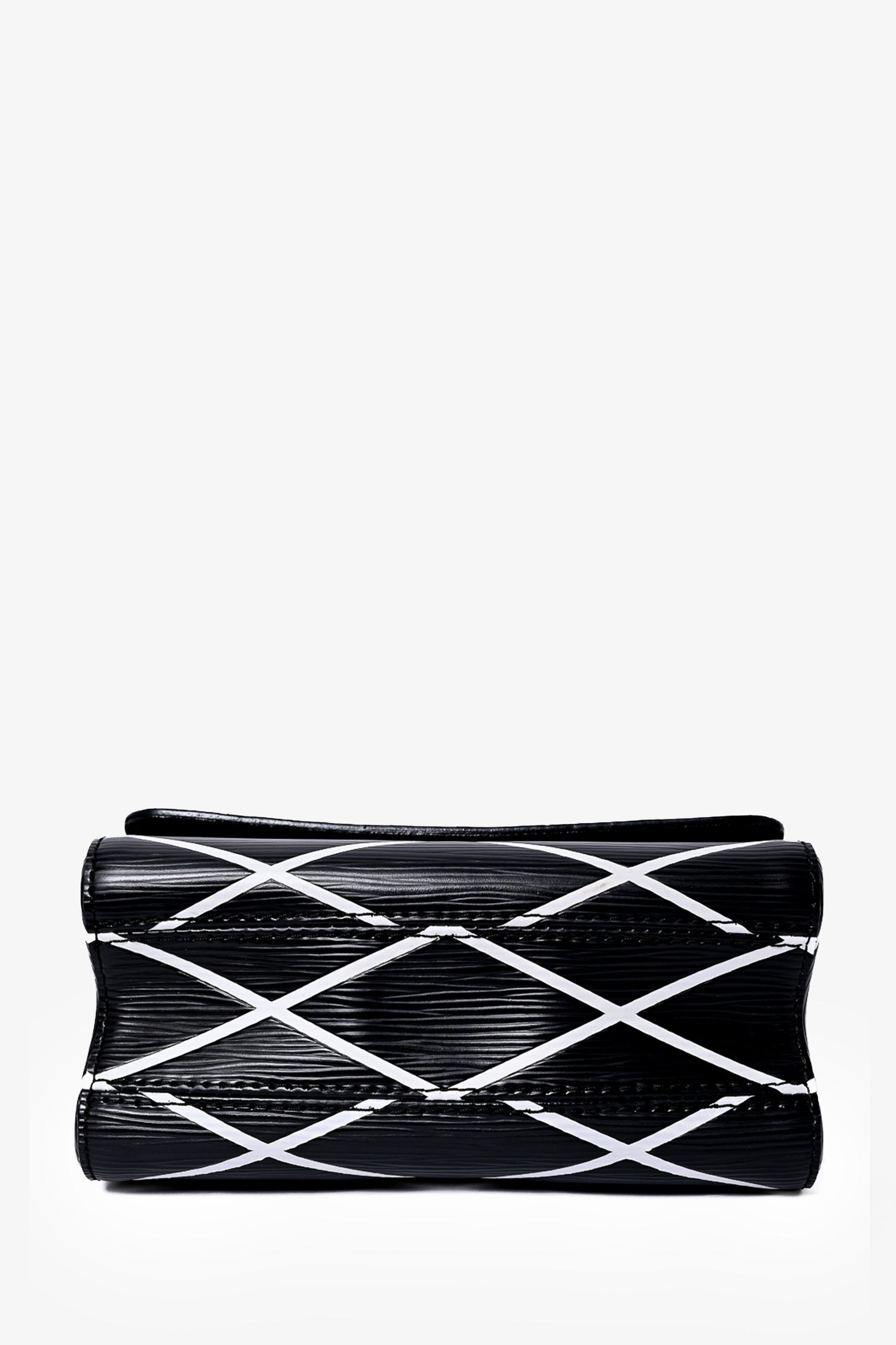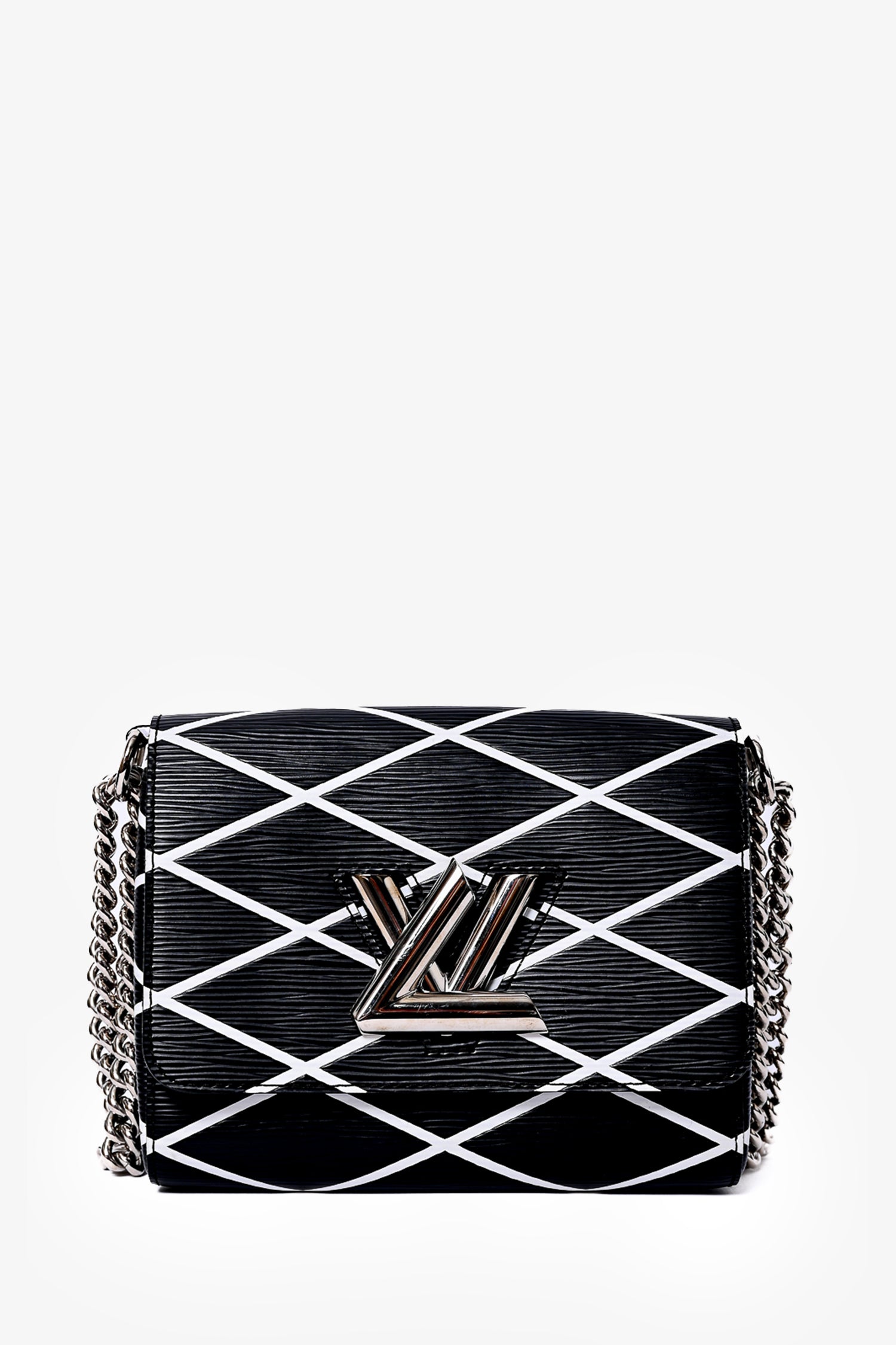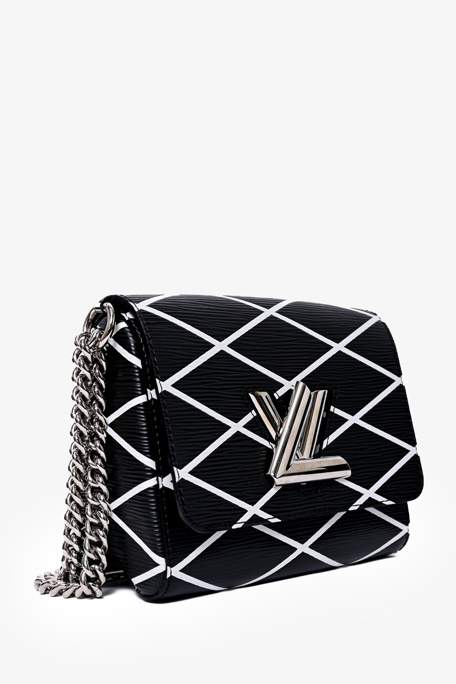 Refresh availabilityLouis Vuitton 2014 Black/White Malletage Leather Twist PM Shoulder Bag. Front fold-over flap with turn-lock closure. Black textile interior lining. 1 interior wall slip pockets. Slide-around chain. Silver-tone hardware. Tonal stitching.