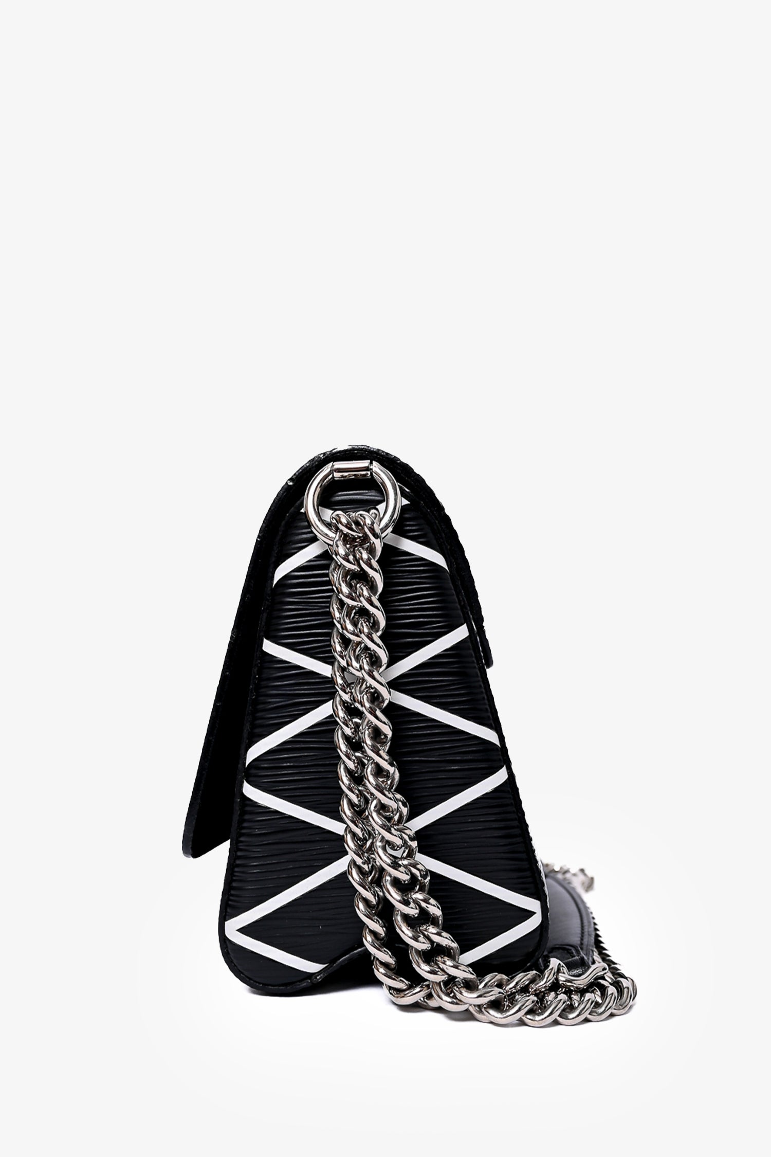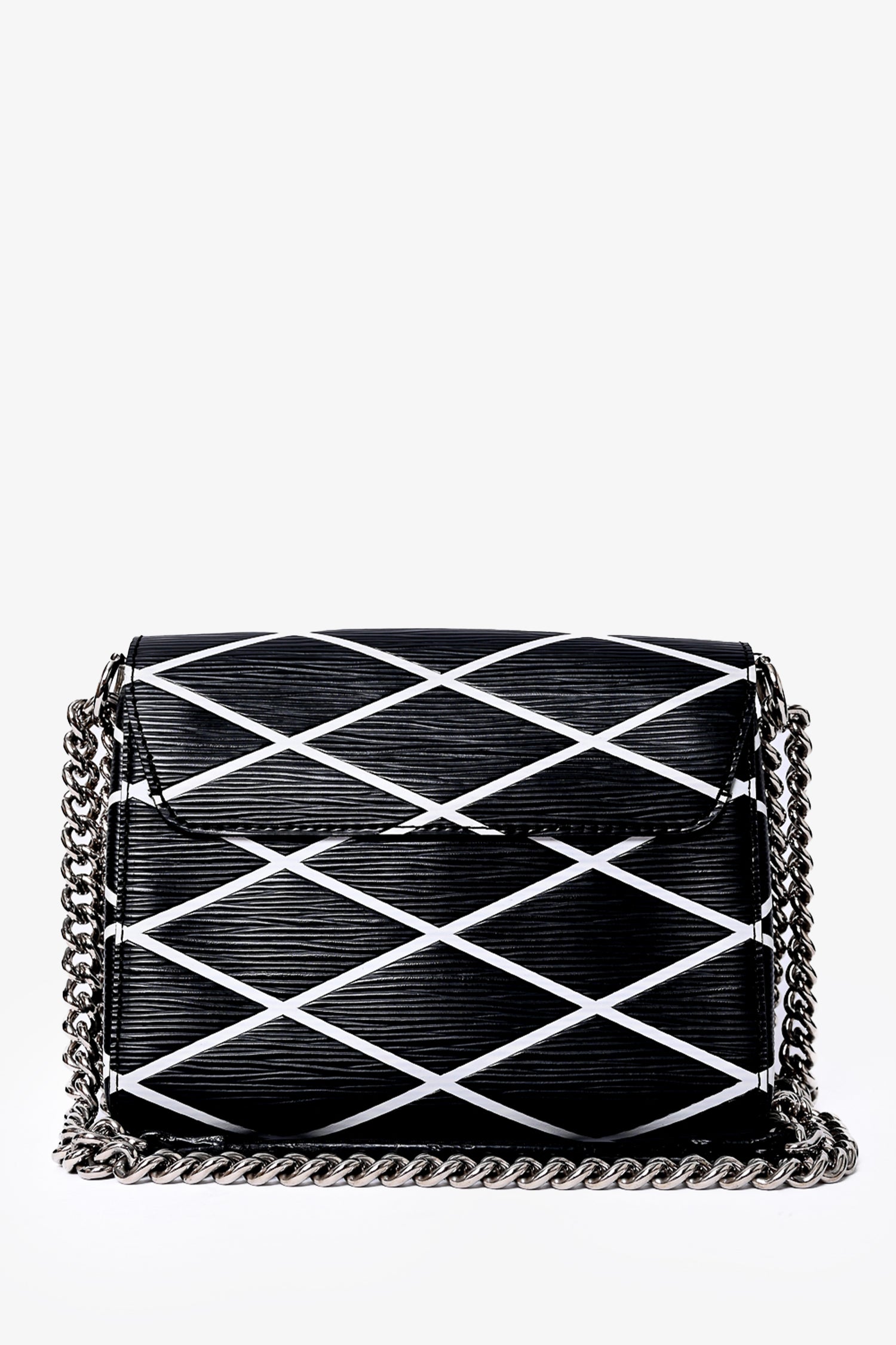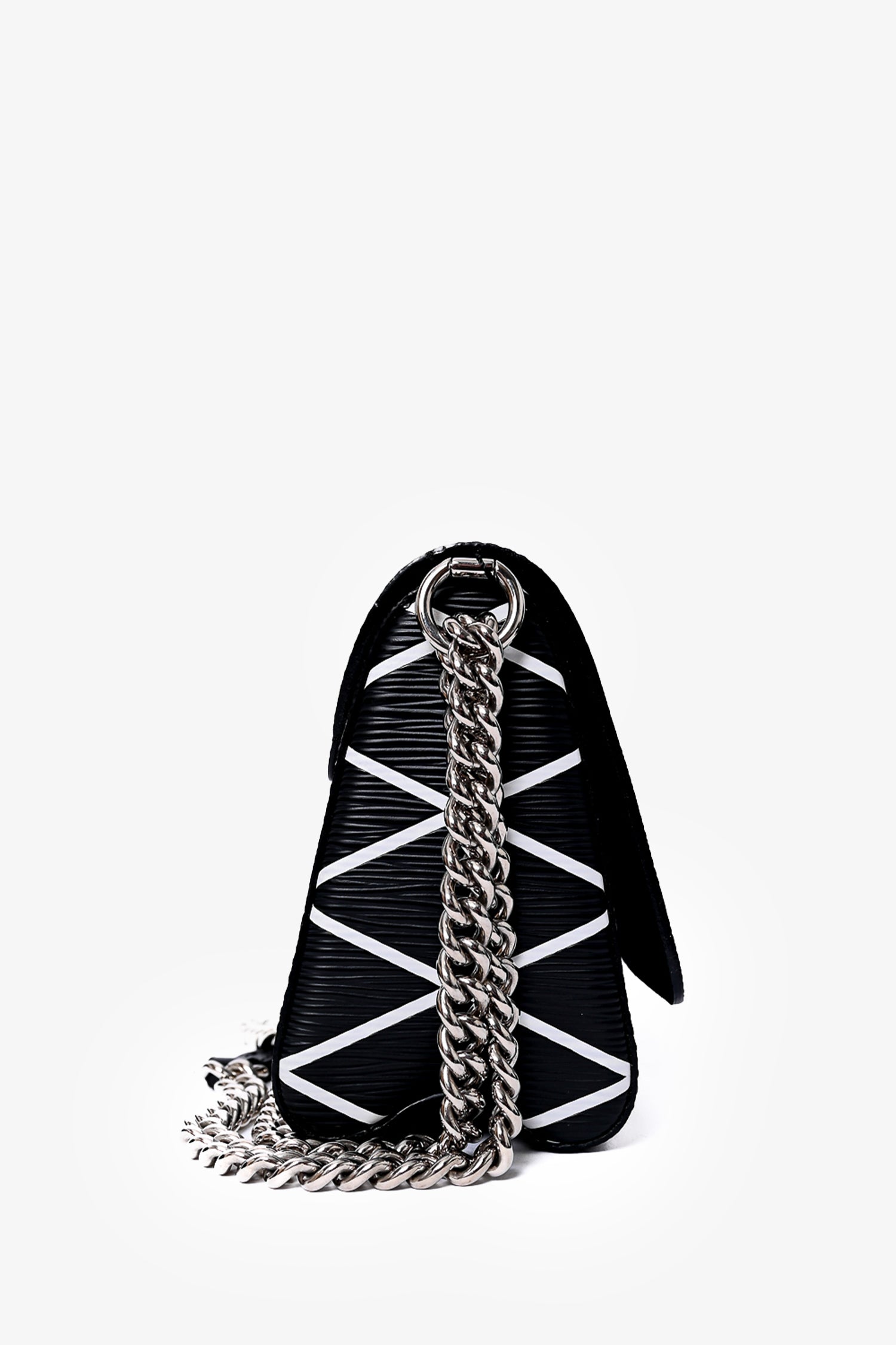 Refresh availabilityLouis Vuitton 2014 Black/White Malletage Leather Twist PM Shoulder Bag. Front fold-over flap with turn-lock closure. Black textile interior lining. 1 interior wall slip pockets. Slide-around chain. Silver-tone hardware. Tonal stitching.