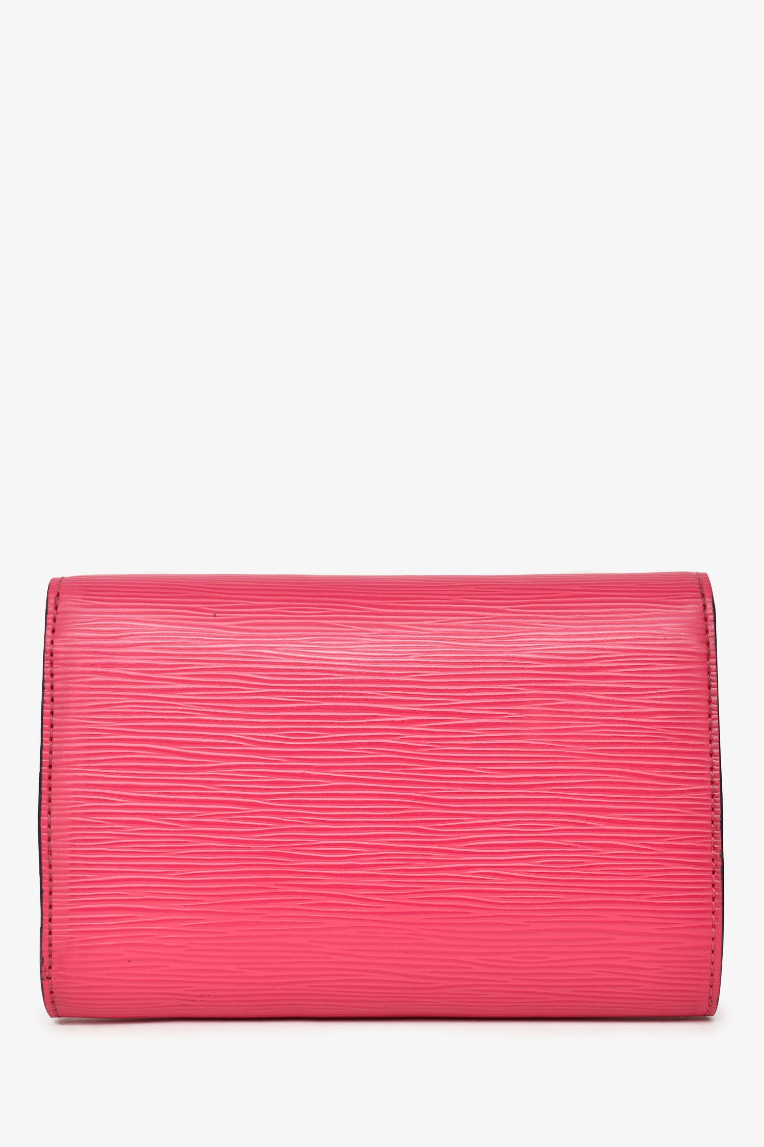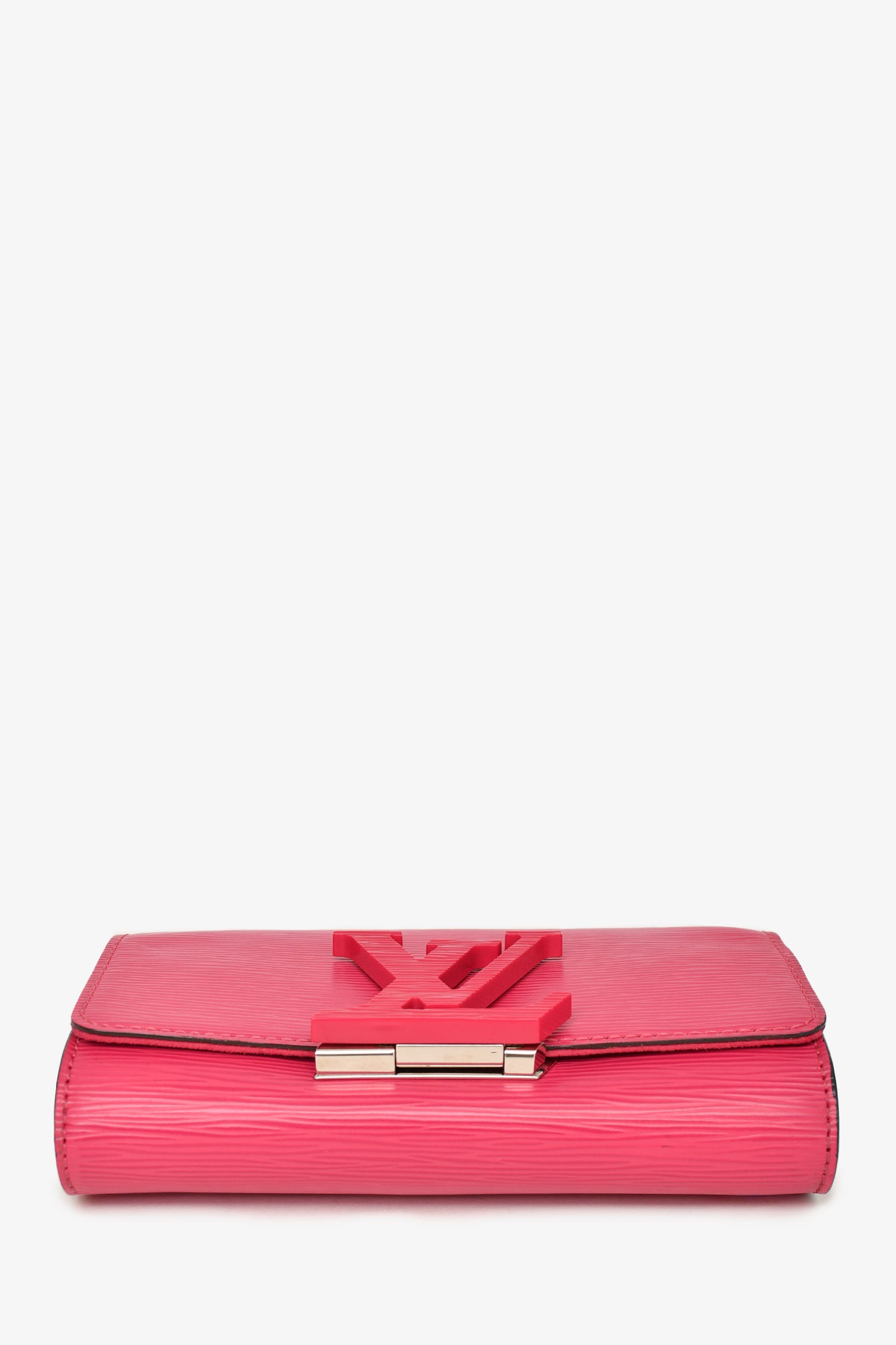 Refresh availabilityLouis Vuitton 2014 Fuchsia Epi Leather Louise Clutch With Strap. Top flap with hardware closure. 4 interior pockets; one with zipper closure. Silver-tone hardware. Tonal stitching.