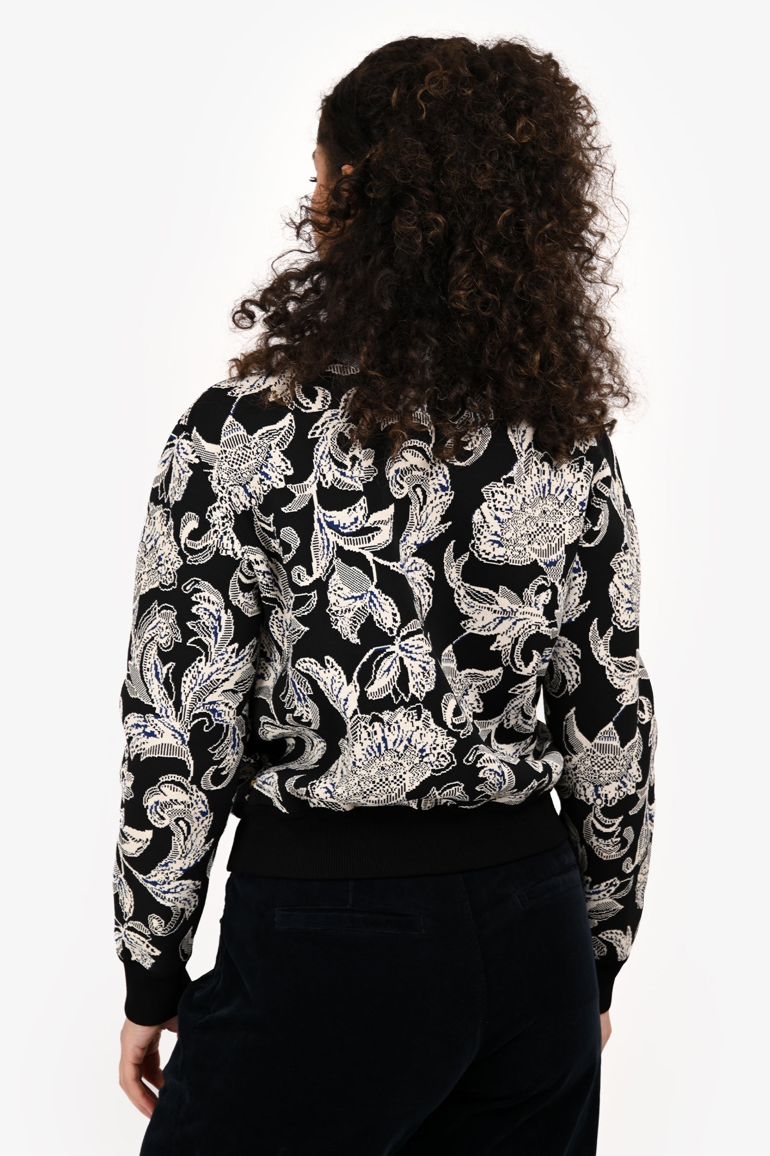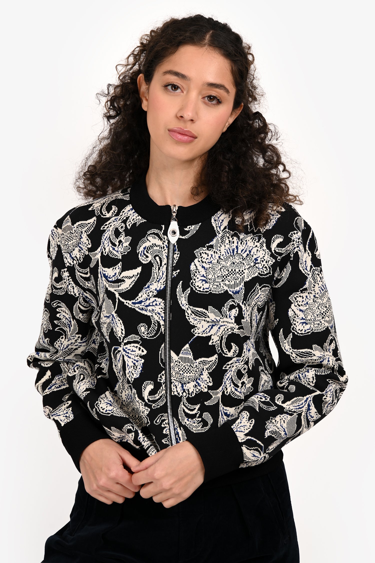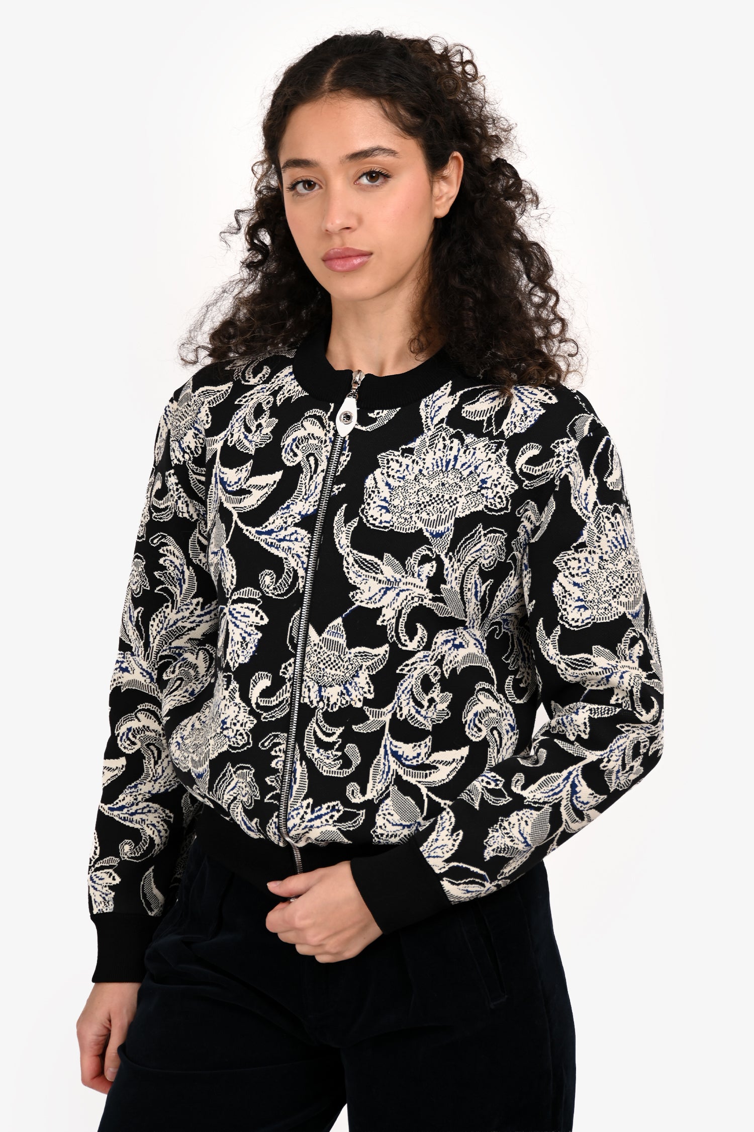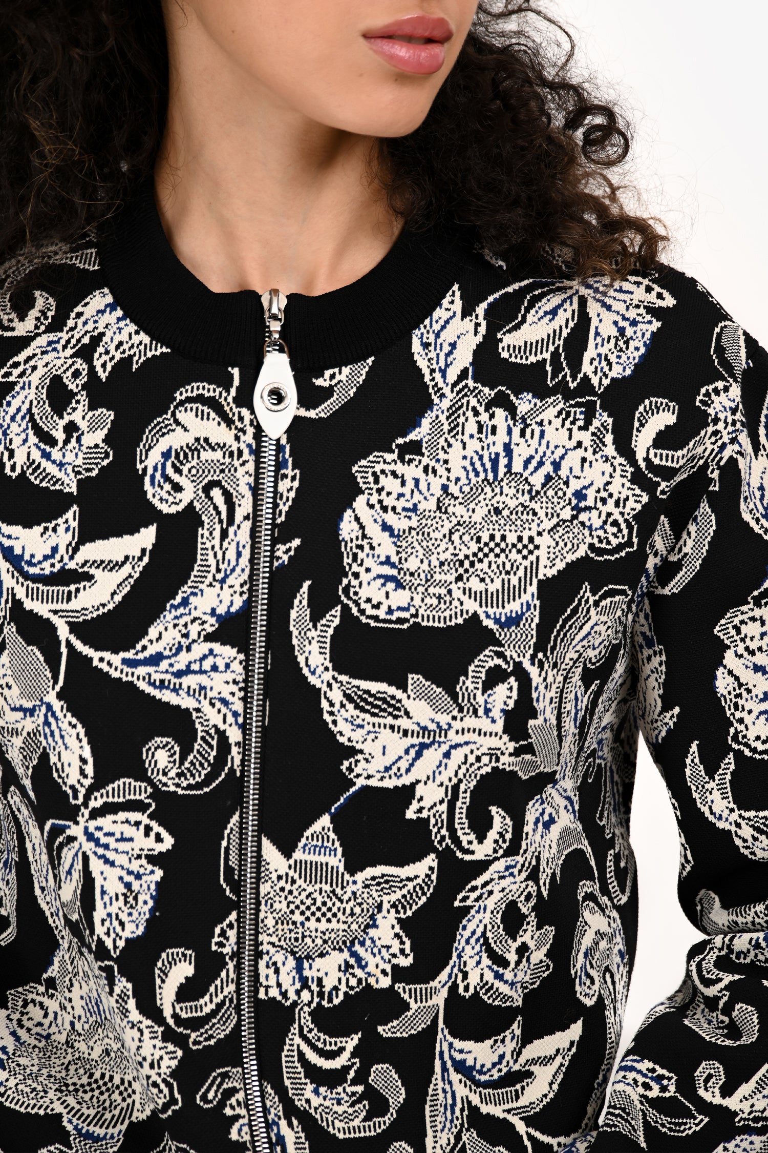 Refresh availabilityLouis Vuitton 2017 Black/White Knit Zip-Up Floral Bomber Jacket. Pull-on. Round neckline. Zip closure in the front. Ribbed neck, cuffs, and hemline. 2 slip pockets on the sides. Silver-tone hardware. Tonal stitching.