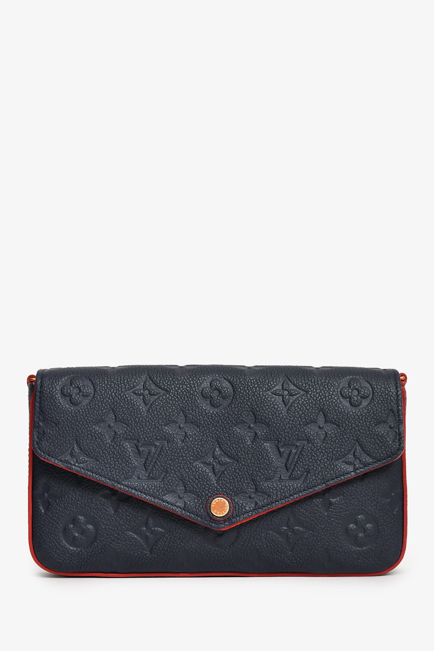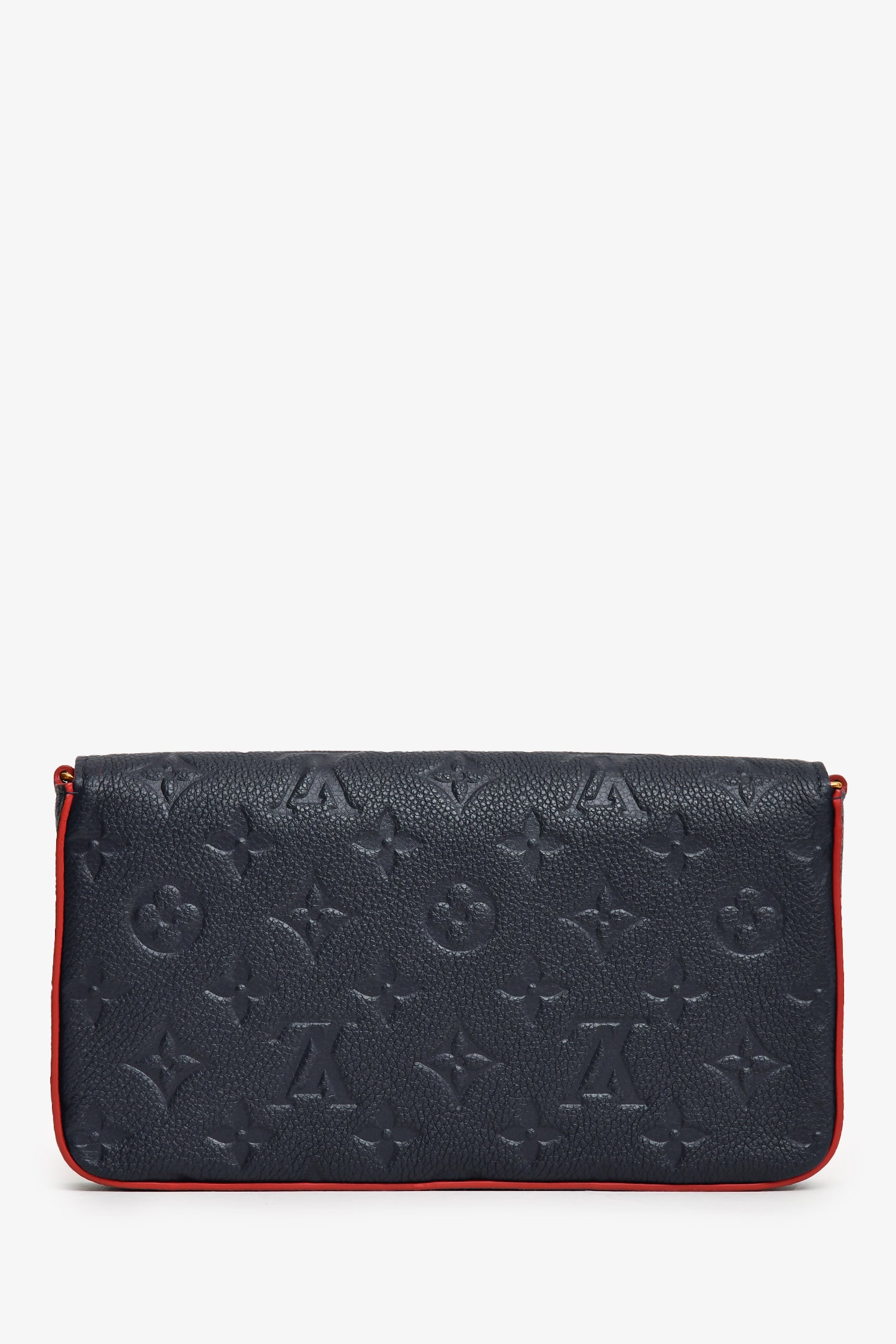 Refresh availabilityLouis Vuitton 2017 Navy/Red Leather Empriente Felicie Crossbody Bag. Fold-over flap with a snap closure. 1 zipped insert. 1 insert with 8 card holders and a bill compartment. Monogrammed motif. Red coated trimming. Chain-link crossbody strap. Tonal stitching.