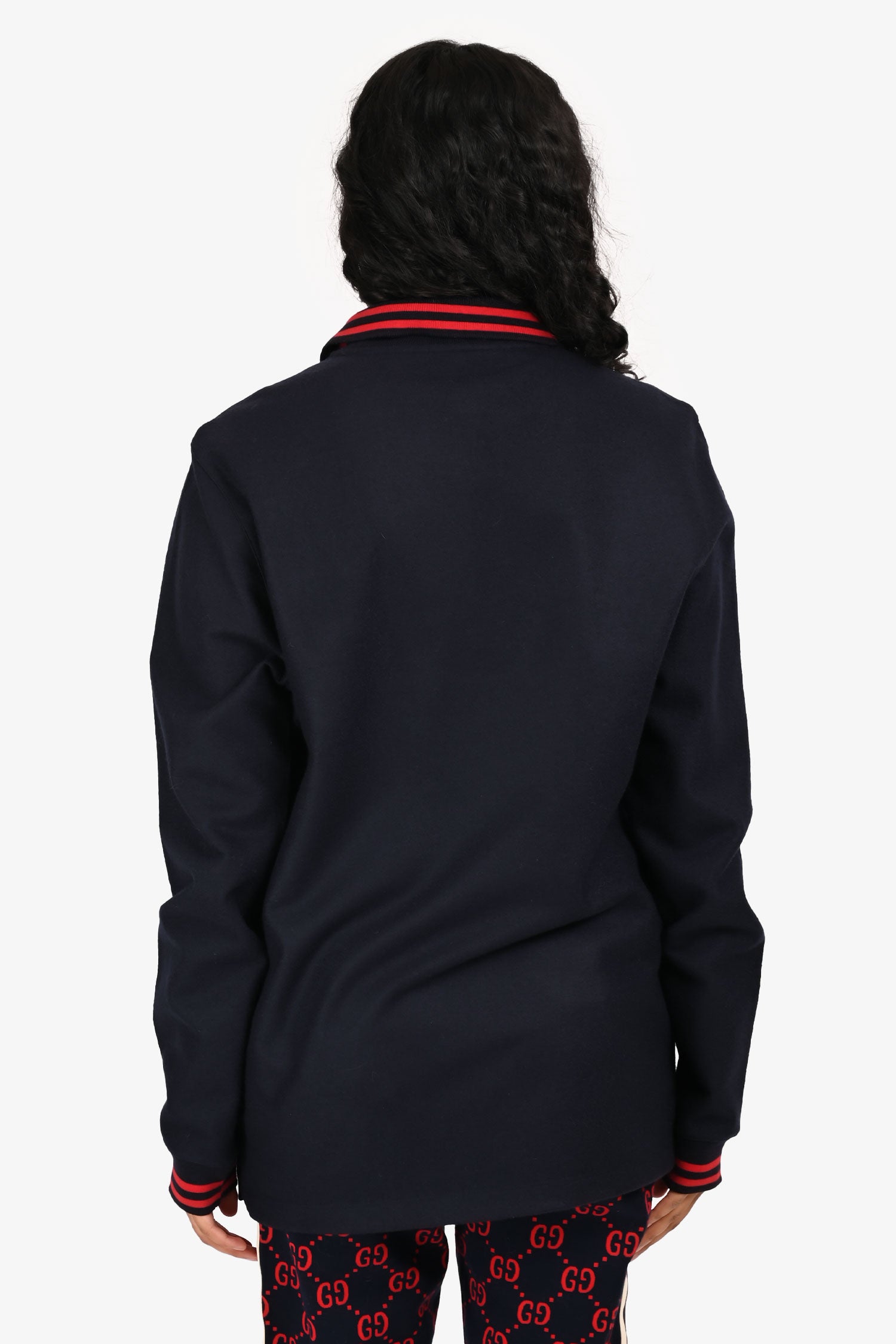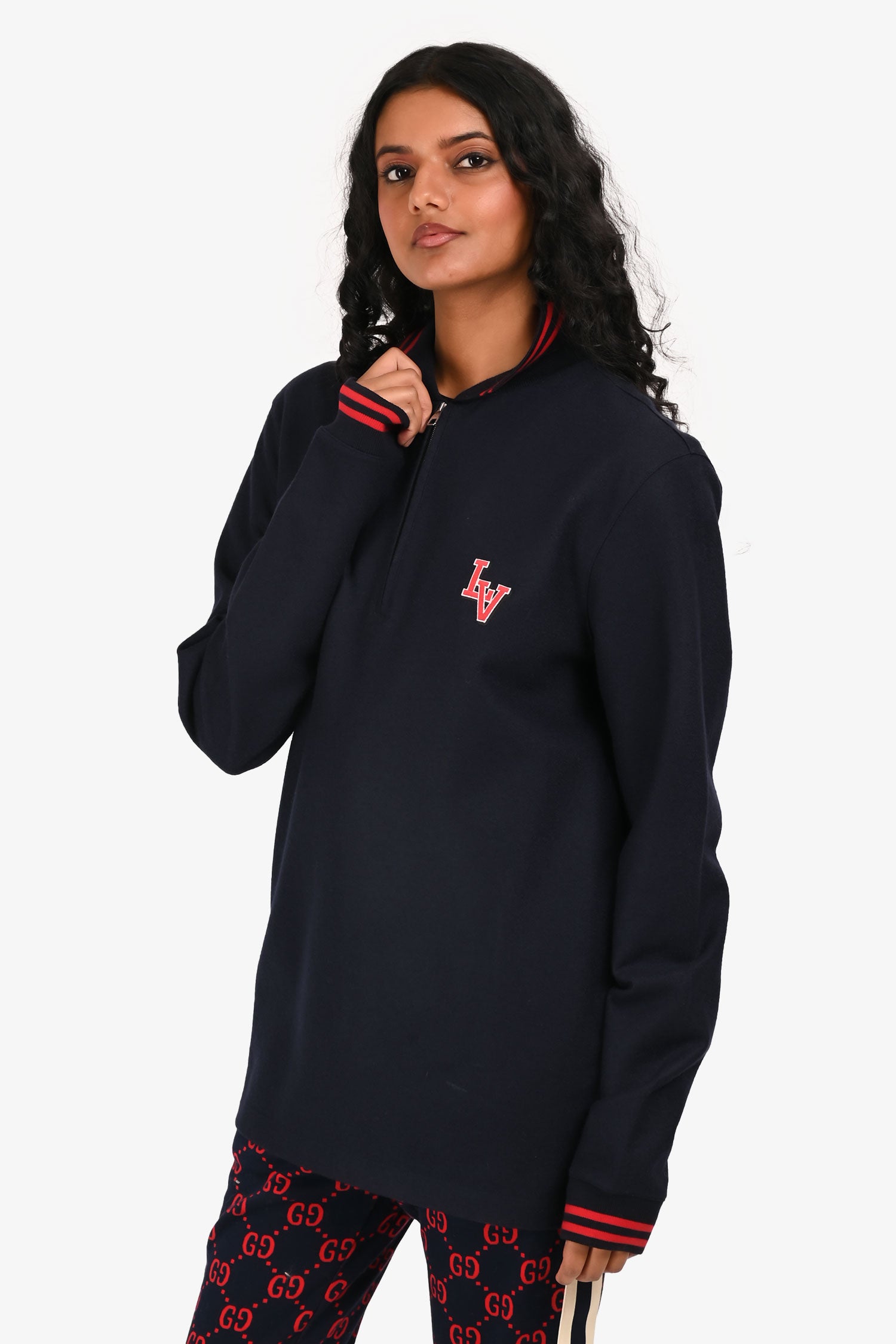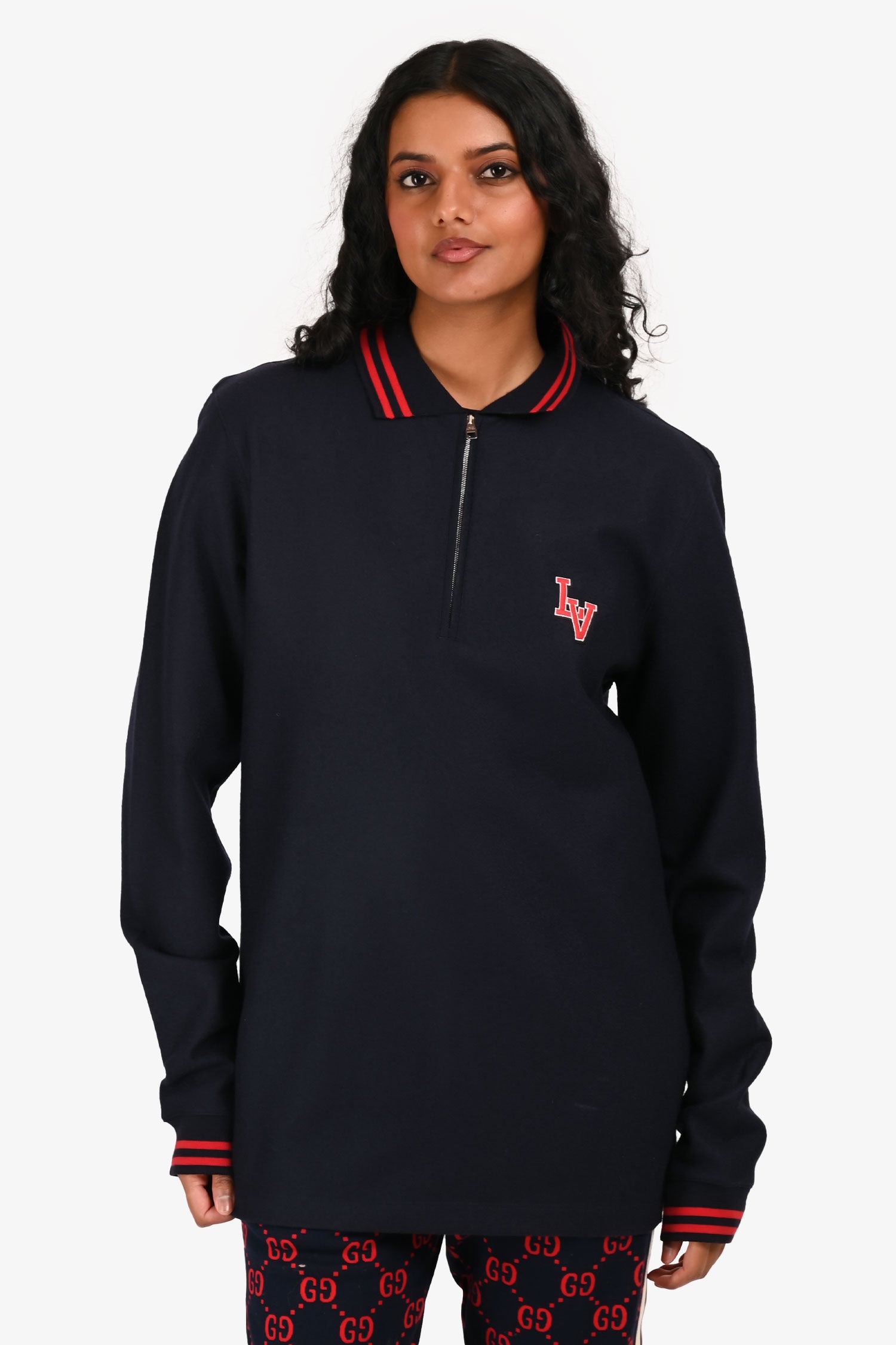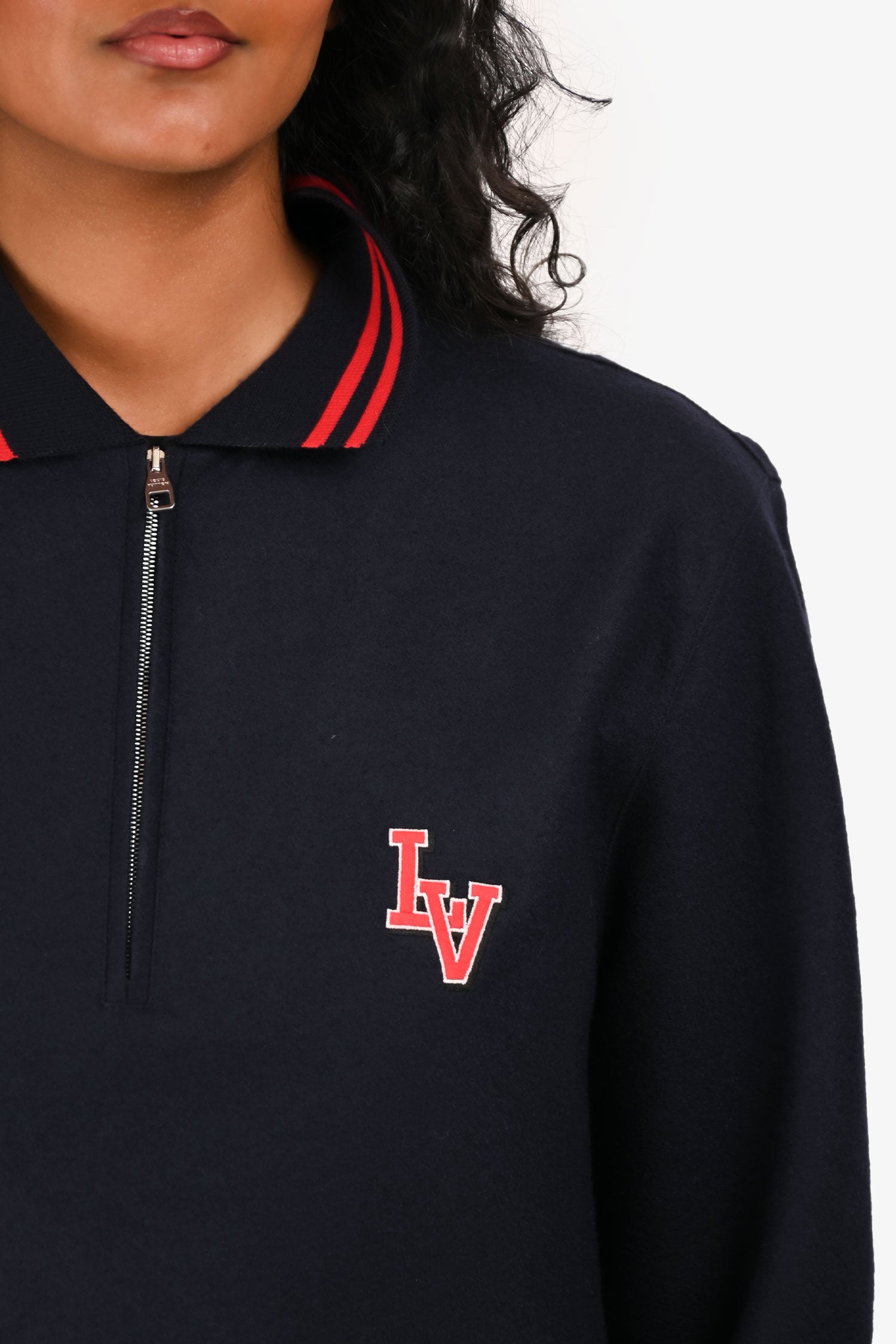 Refresh availabilityLouis Vuitton 2017 Navy/Red Wool Polo Top. Quarter zipper. Ribbed cuffs. Silver-tone hardware. Tonal stitching.