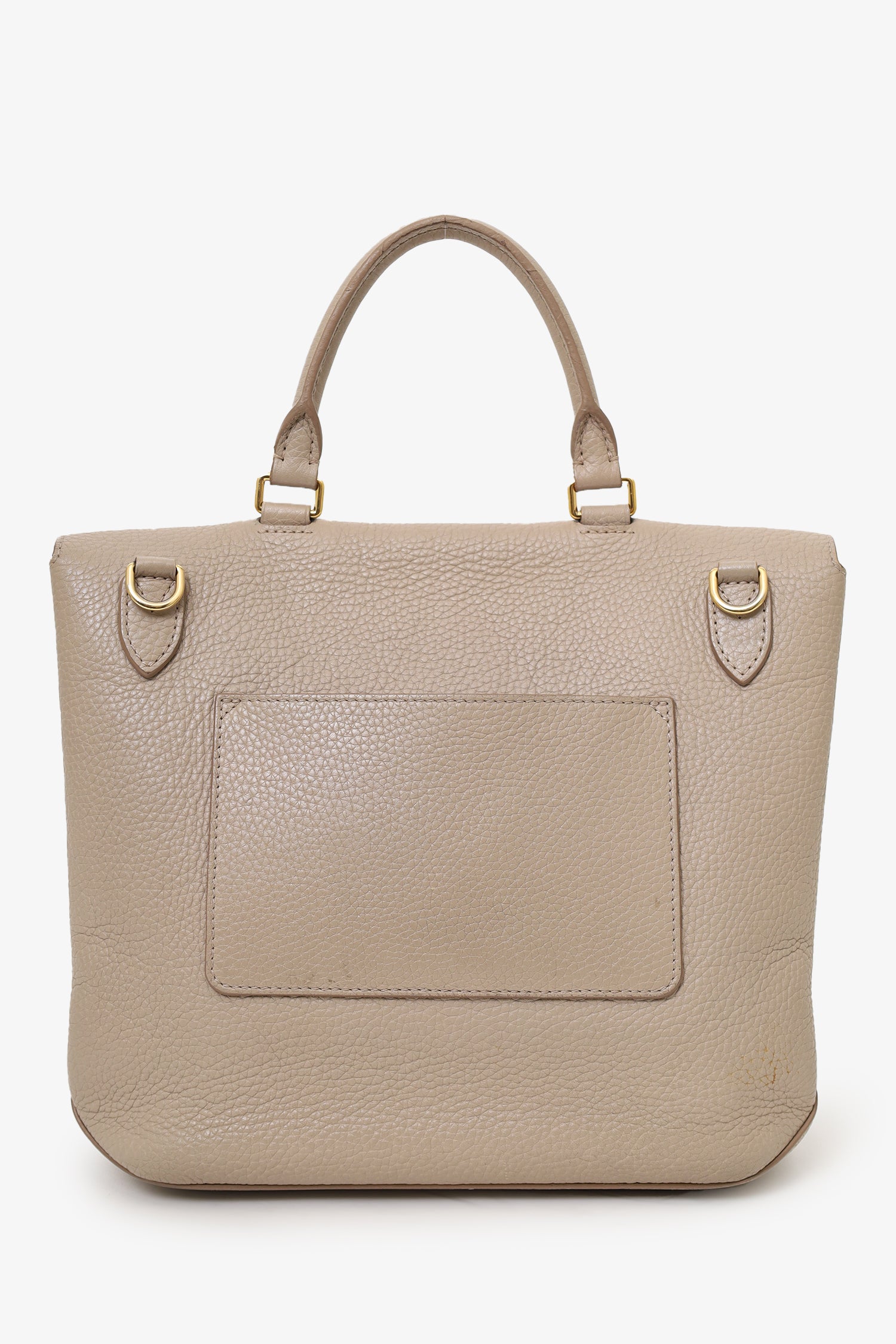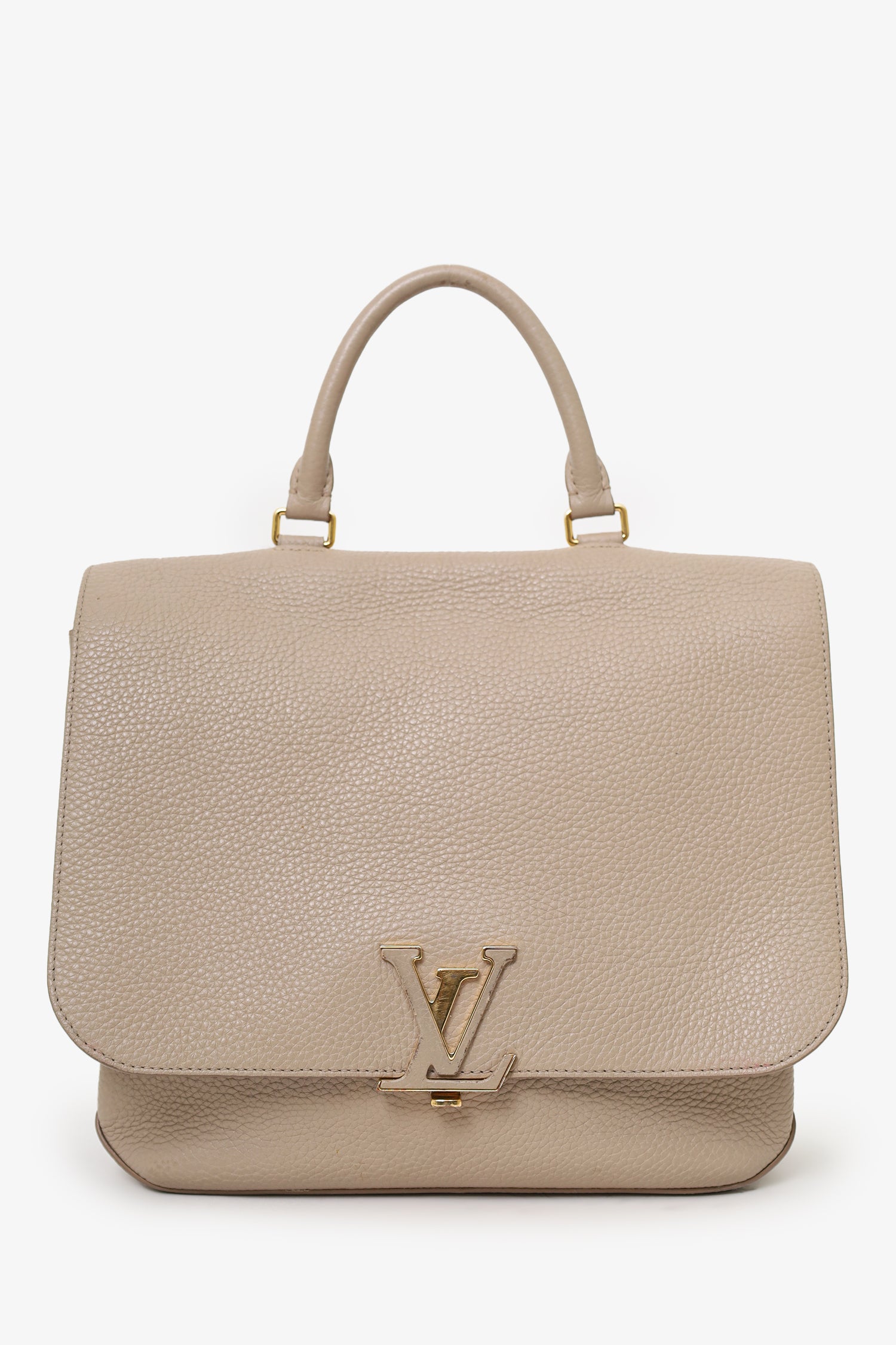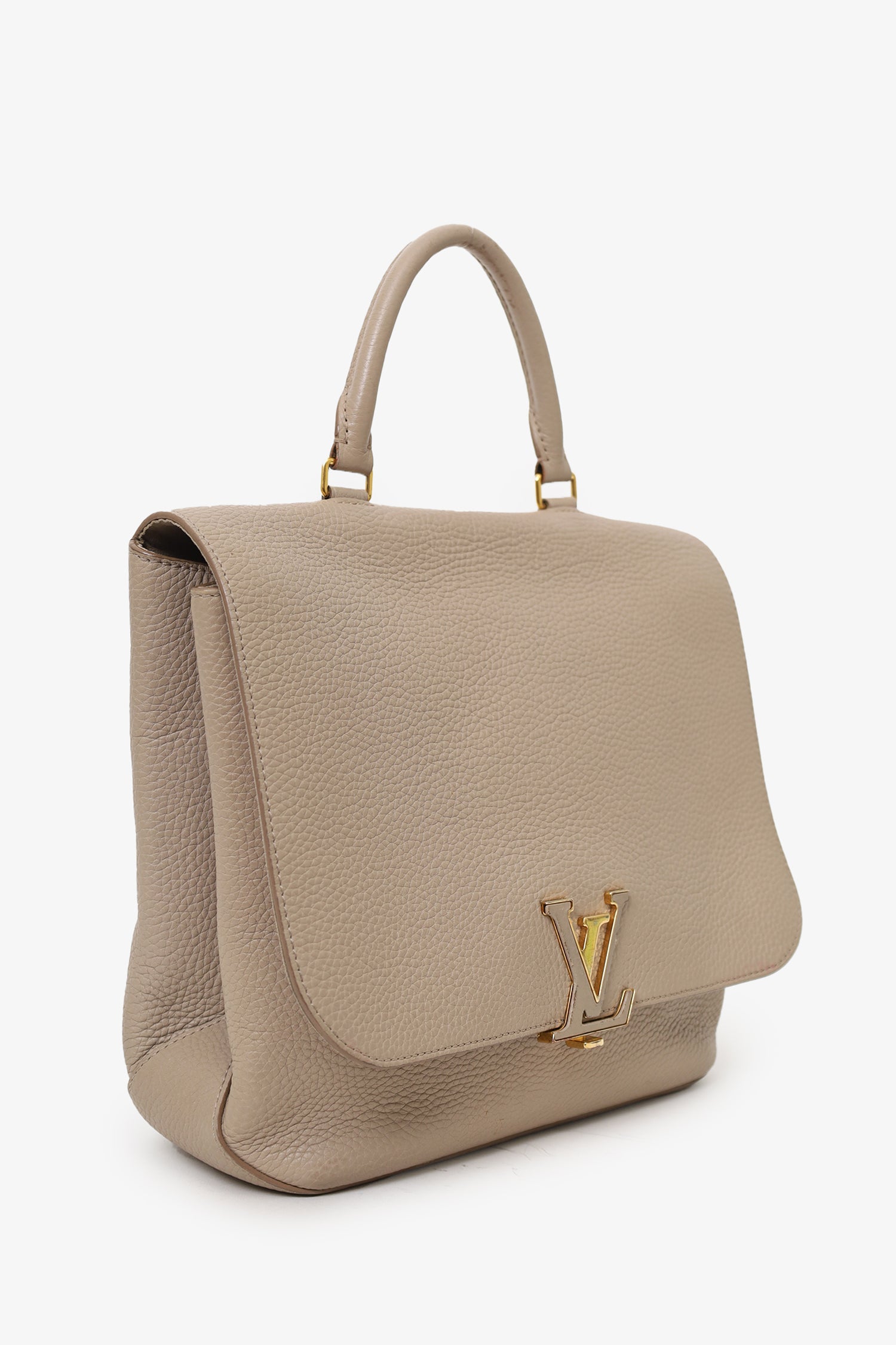 Refresh availabilityLouis Vuitton 2018 Taupe Leather Taurillon Volta Top Handle. Front fold-over flap with push lock closure. Single top handle. Single exterior rear wall slip pocket. Suede-lined interior. Three interior compartments; 2 open with slip pockets, one with zip closure. Gold-tone hardware. Tonal stitching.