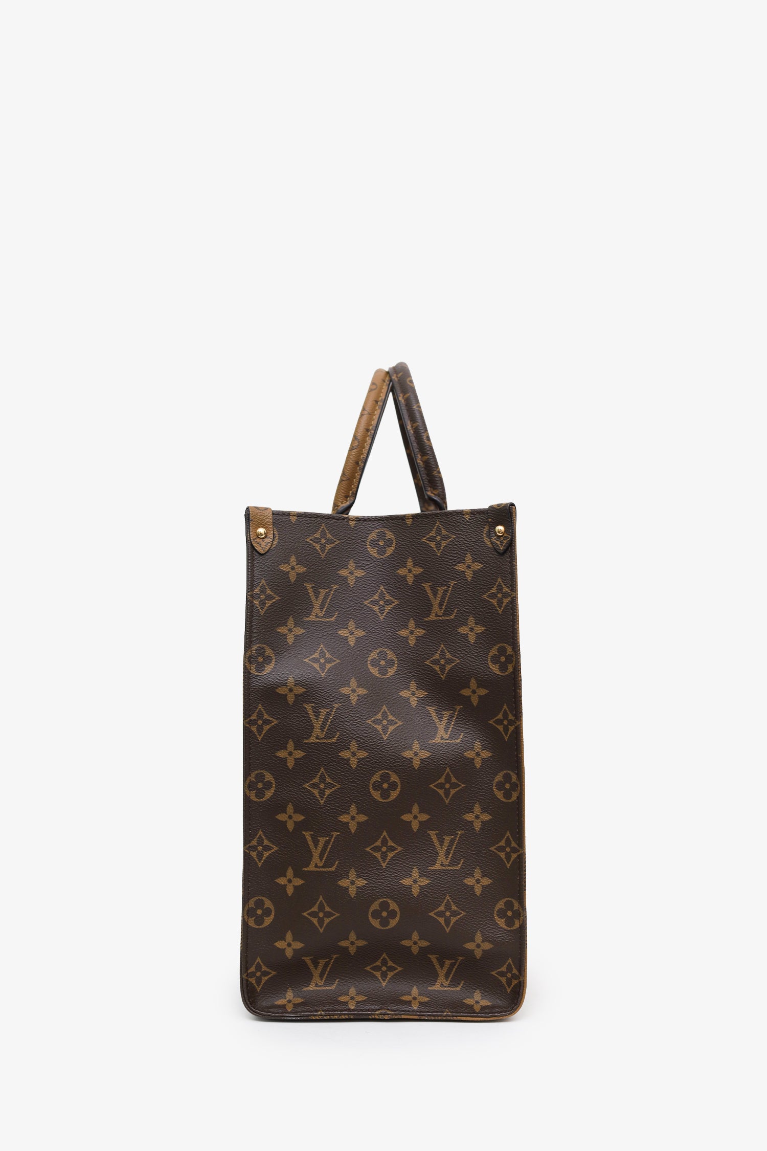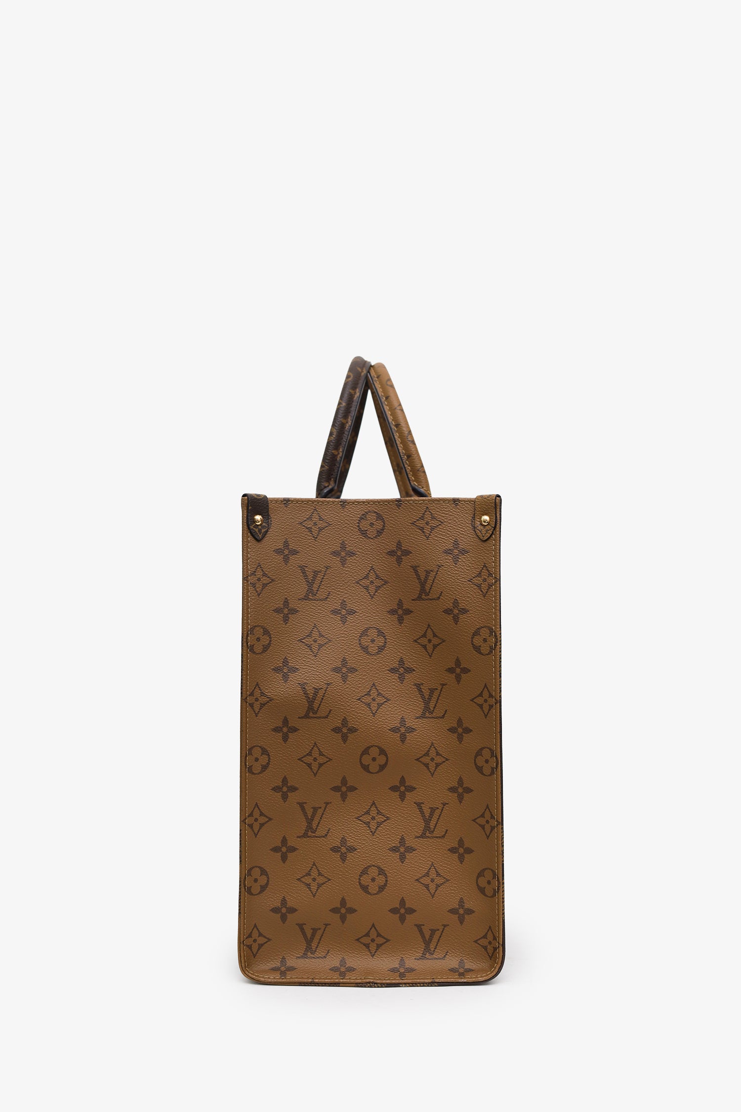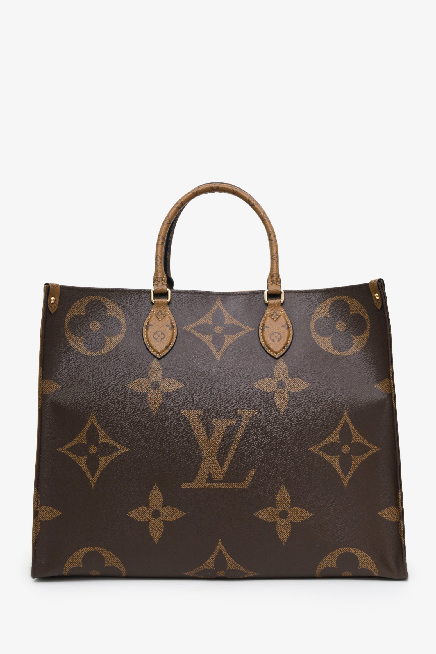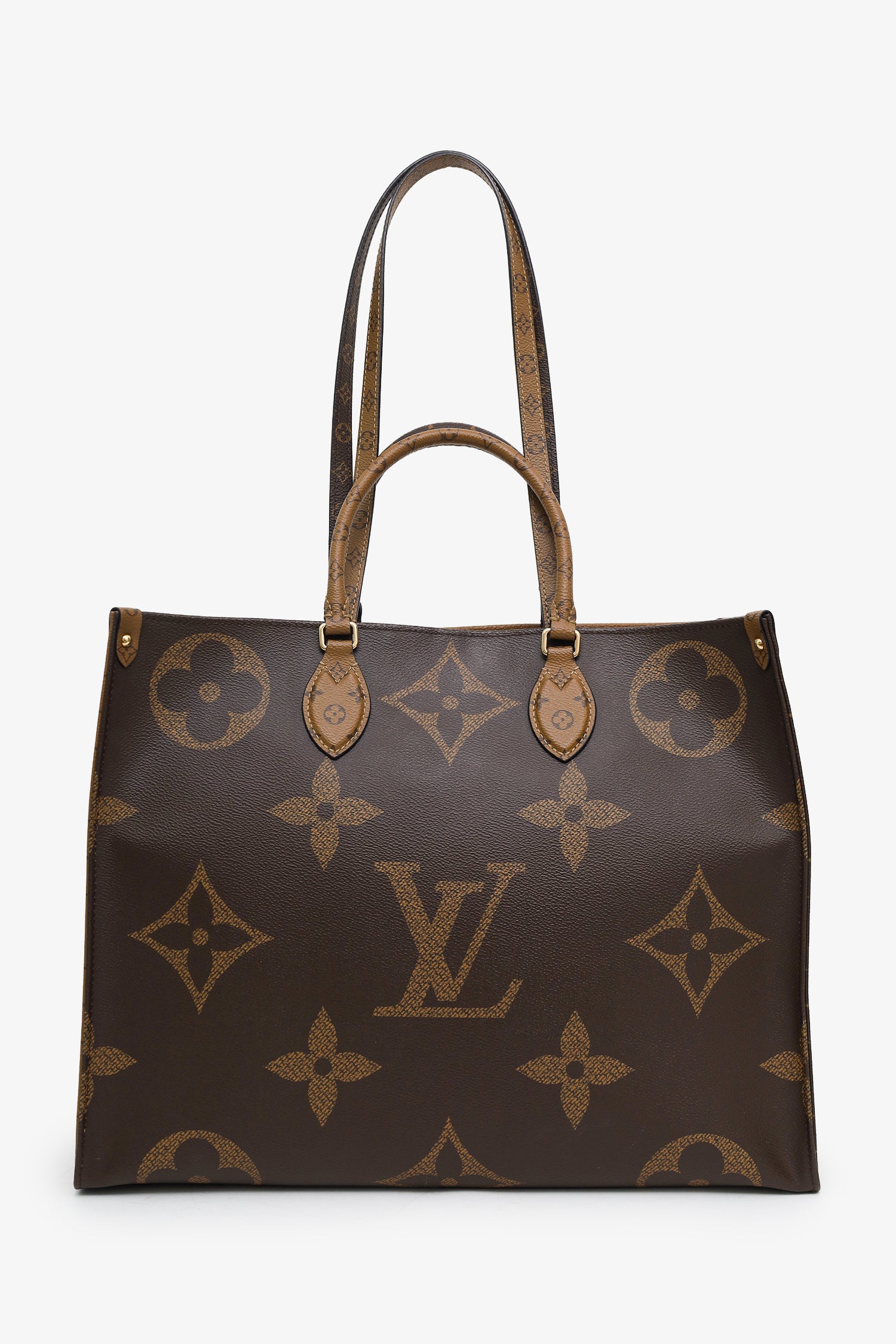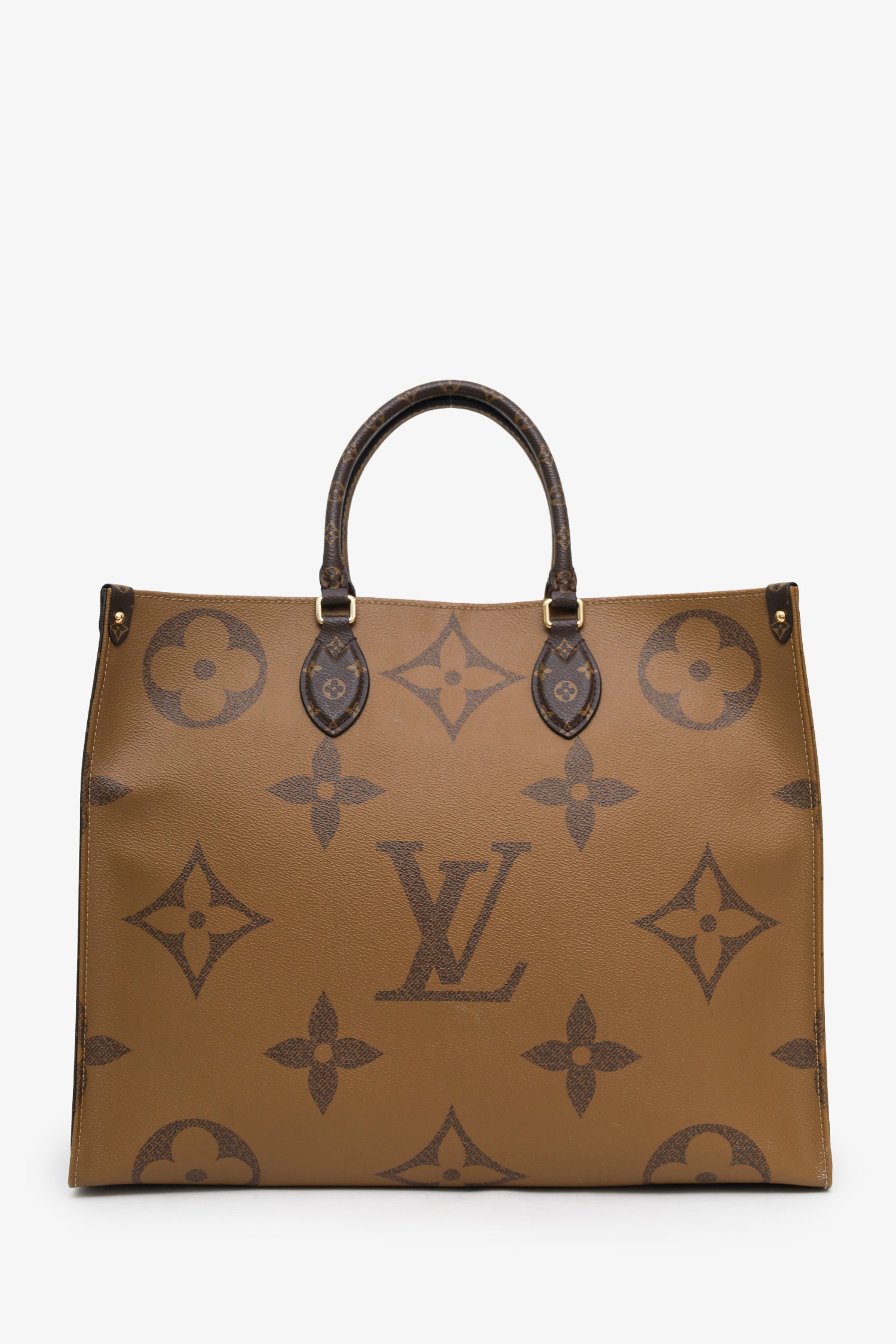 Refresh availabilityLouis Vuitton 2019 Monogram Giant Reverse 'OnTheGo' GM Tote. Top open with clasp closure. Twin top handles and shoulder straps. Lined interior with 3 pockets; 1 zip, and 2 slip. Gold-tone hardware. Tonal stitching.