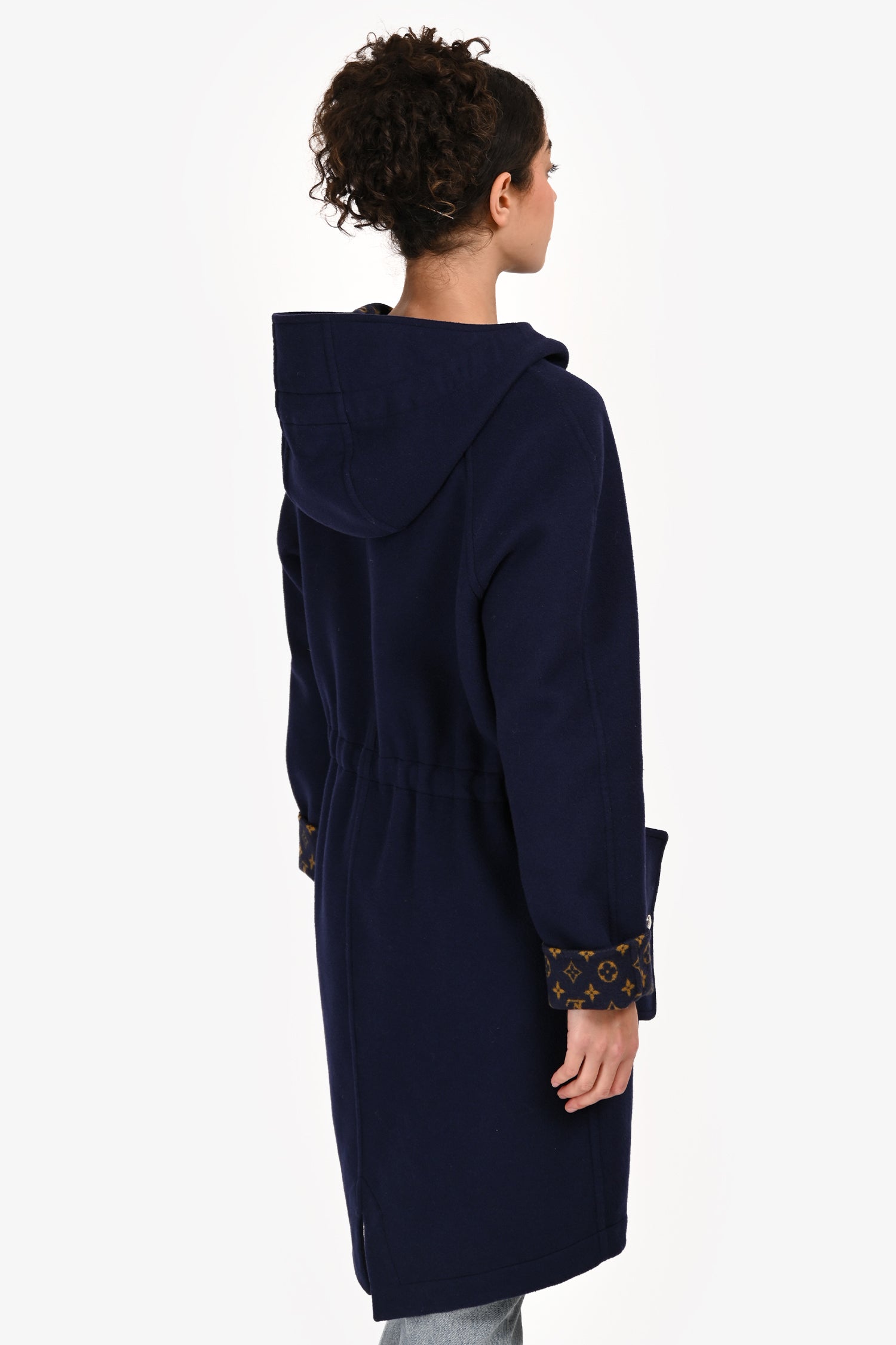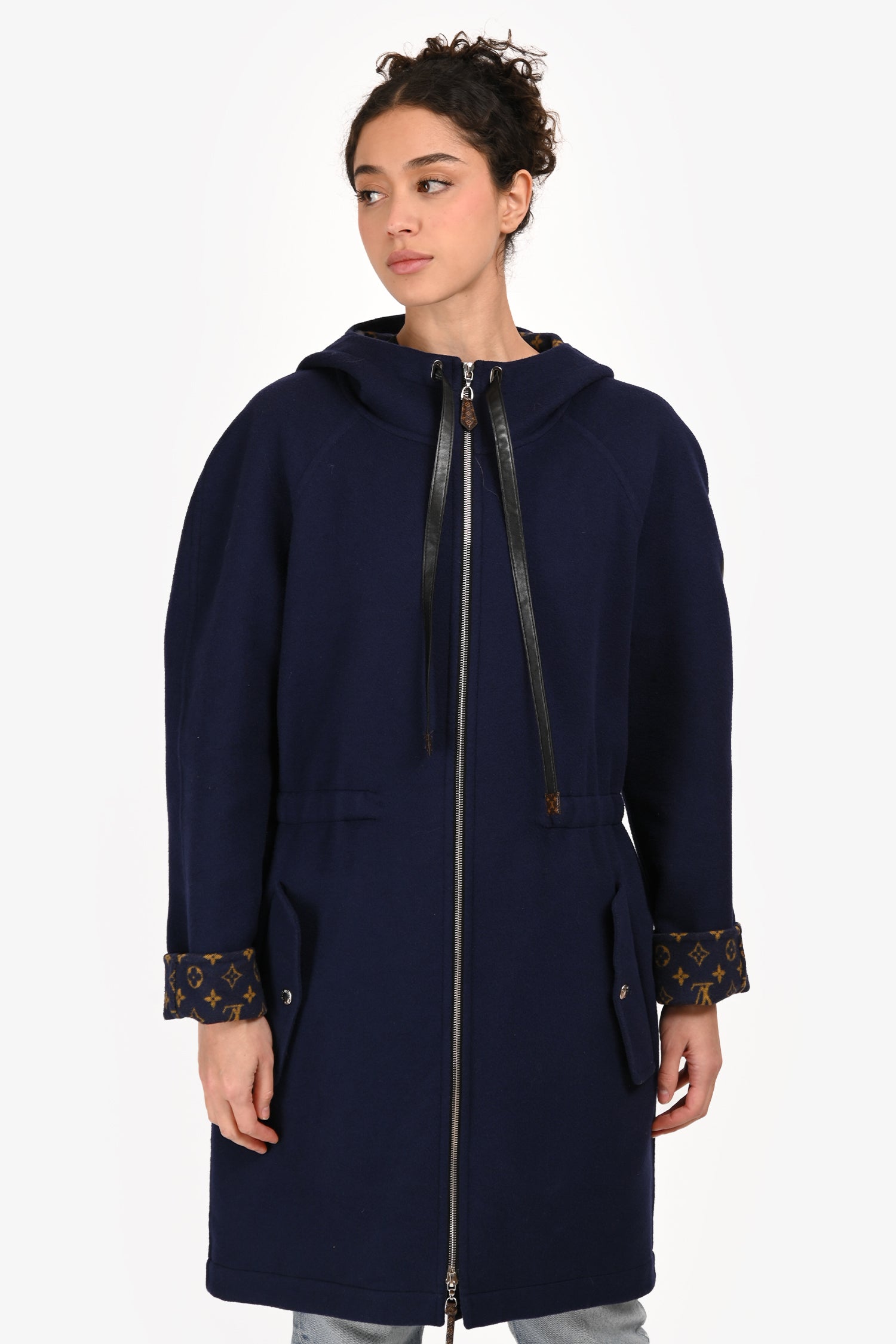 Refresh availabilityLouis Vuitton 2019 Navy Wool Monogram Detail Hooded Coat. Slip-on. Front 2-way zipper closure. 2 side fold-over pockets with snap button closure. Hood with drawstring closure. Elasticized waistband. Lined interior. Silver-tone hardware. Tonal stitching.