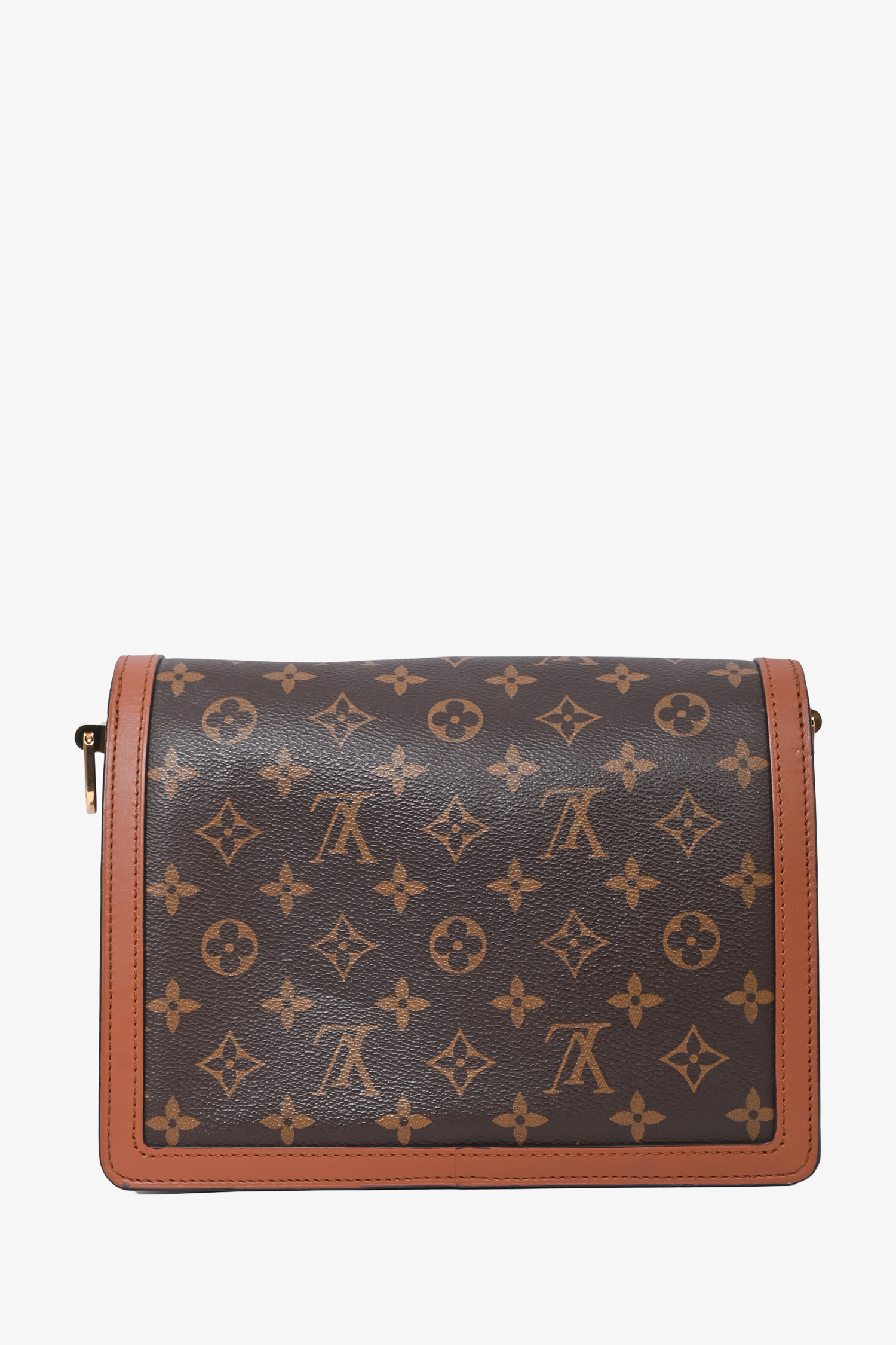 Louis Vuitton 2019 Reverse Monogram Dauphine MM Shoulder Bag. Front fold-over flap with magnetic button closure. Black textile interior lining. 3 interior compartments; 2 open and 1 with zip closure. Gold-tone hardware. Interchangeable straps. Tonal stitching.