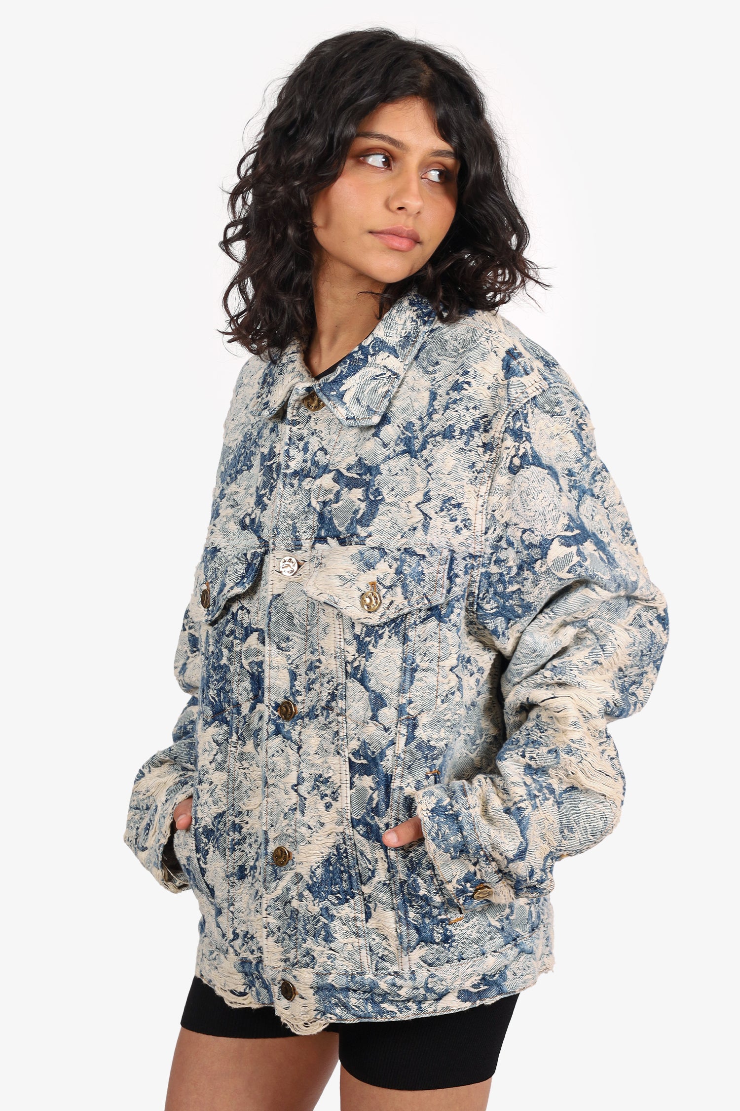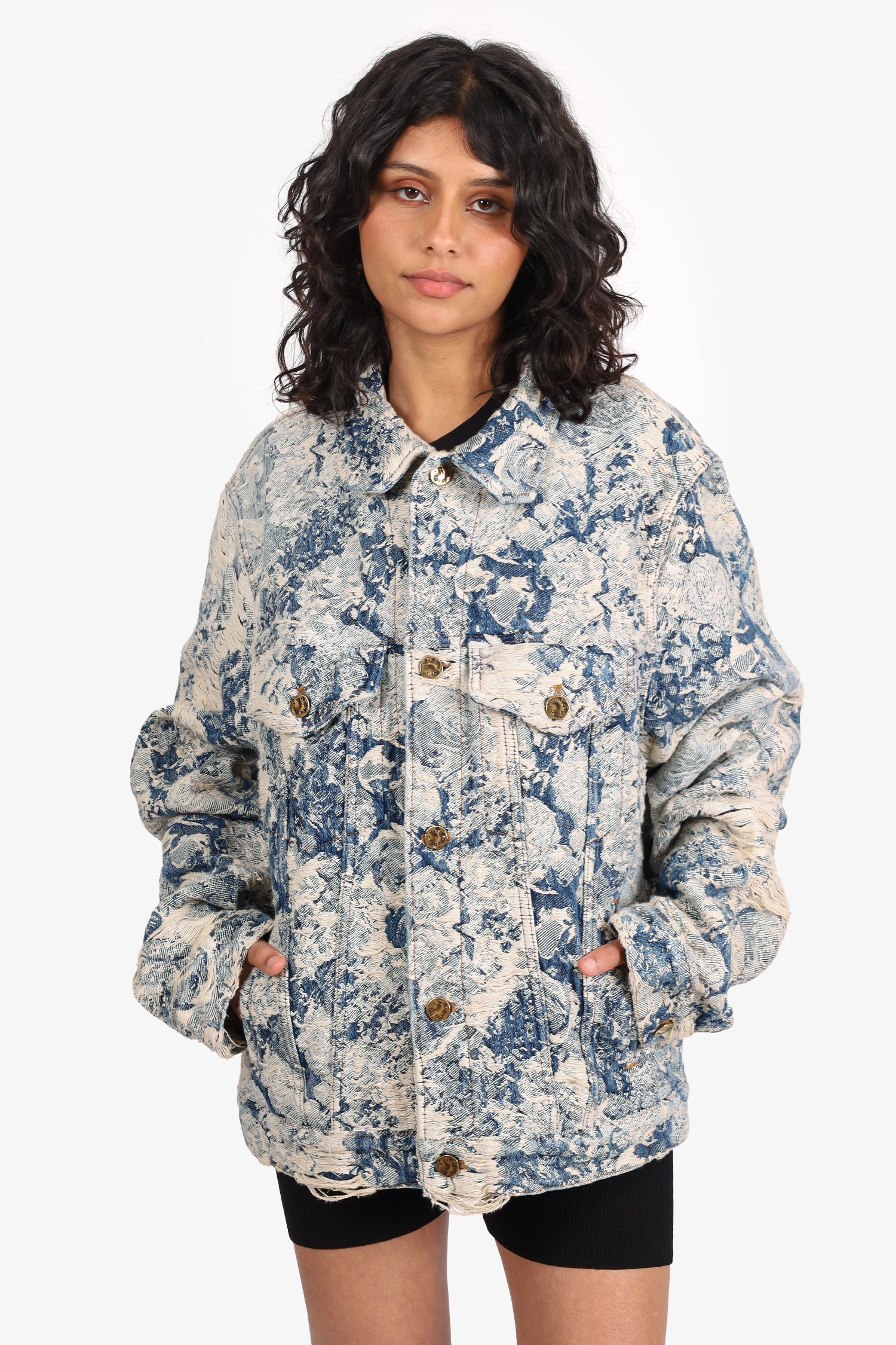 Refresh availabilityLouis Vuitton 2022 Blue Distressed Denim Floral Tapestry Denim Jacket. Pull-on. Collared-neckline. Front button-up closure. Sleeve cuffs with button-up closure. 4 exterior pockets; 2 front flap with button-up closure and 2 side slip. Gold-tone hardware. Tonal stitching.