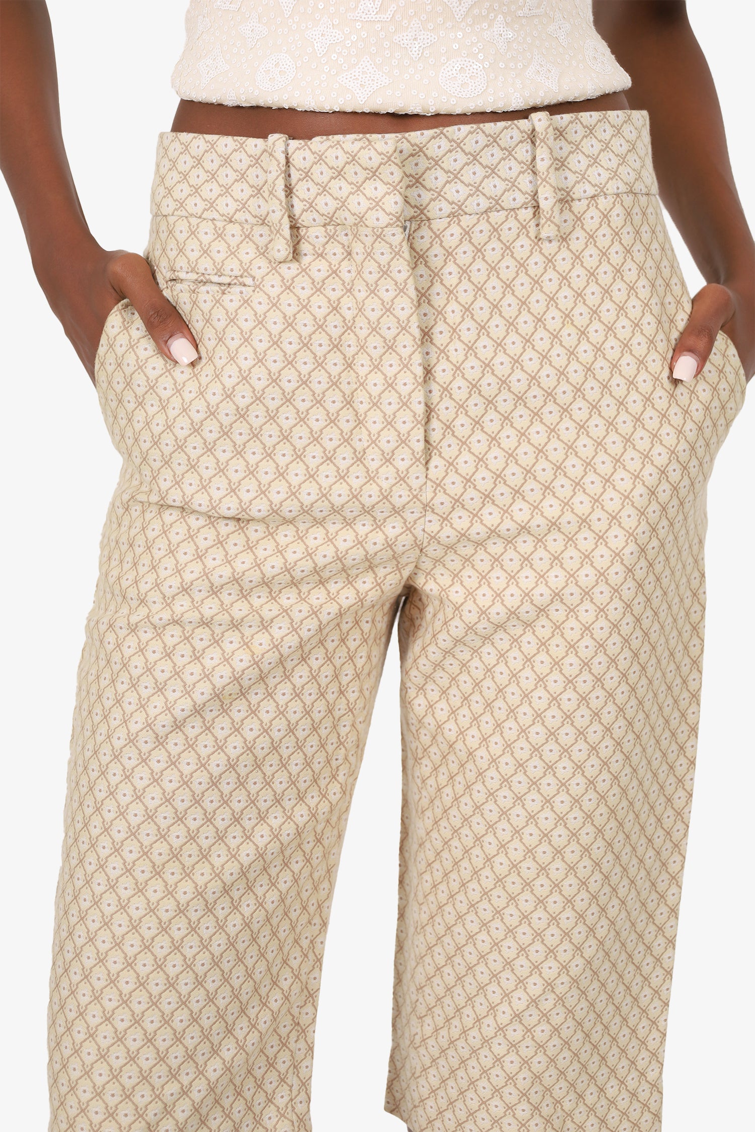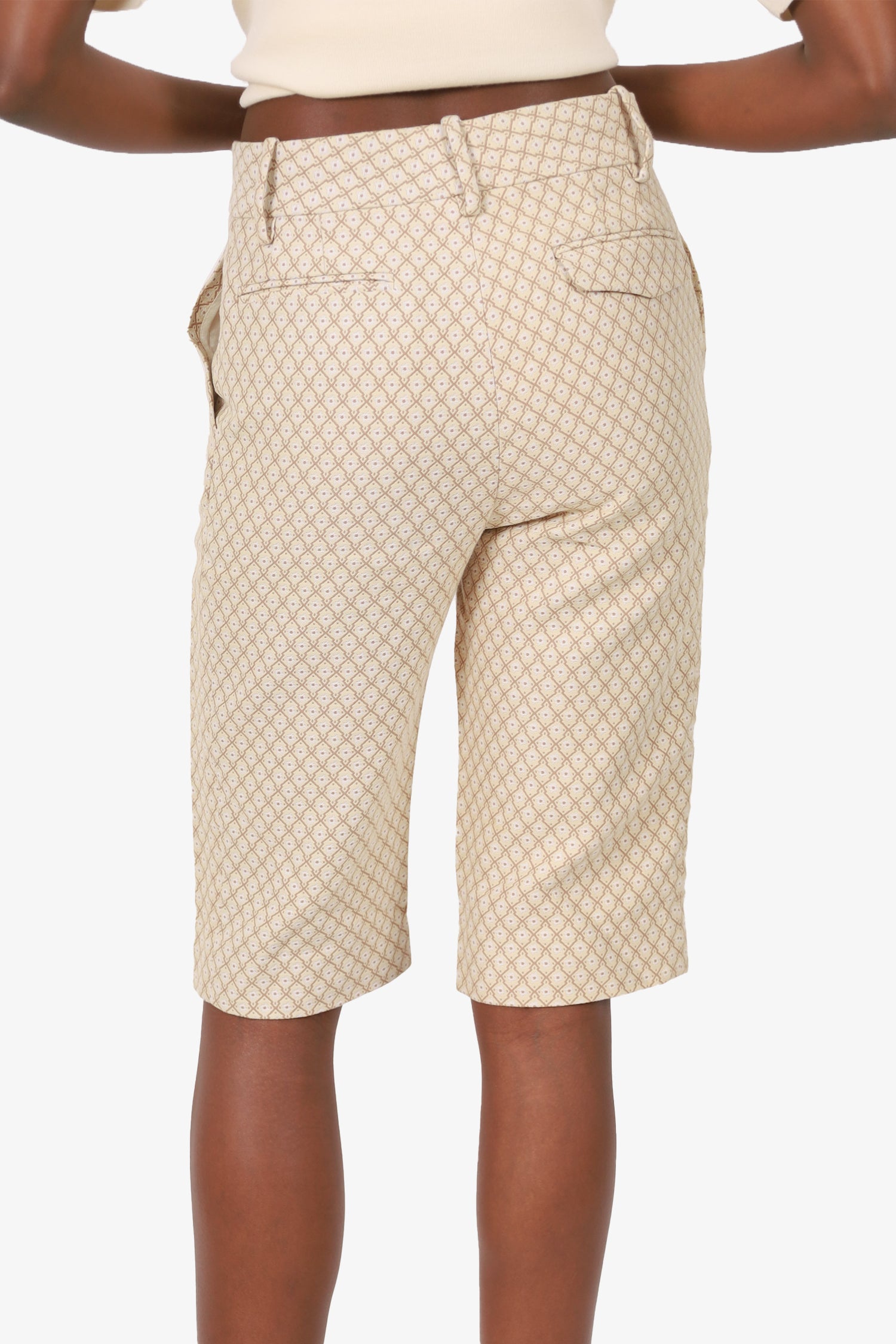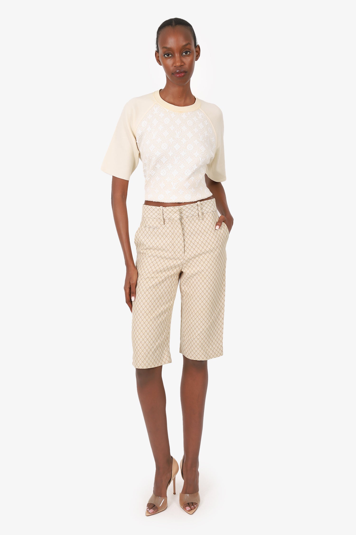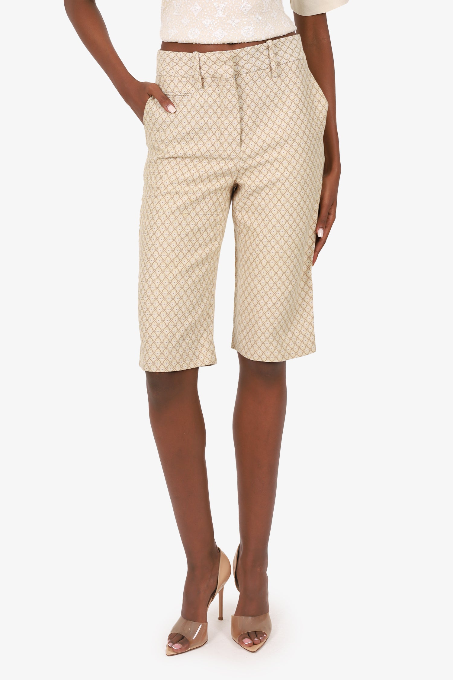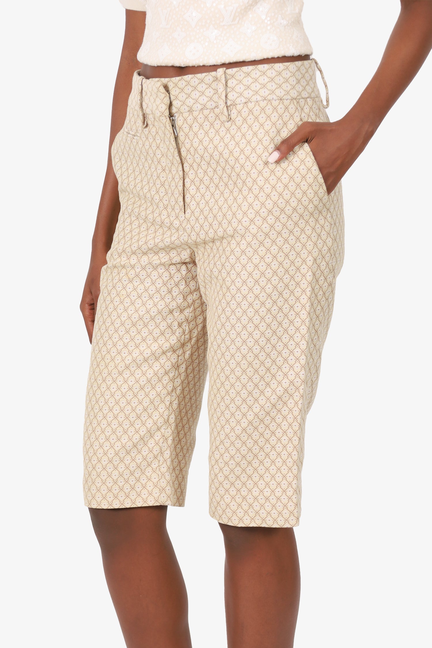 Refresh availabilityLouis Vuitton Beige Patterned Shorts. Slip on. Front zip with hook closure. Waistband belt-loops. 5 exterior pockets; 1 front slip, 1 mini compartment, and 1 rear slip and front fold-over flap. Silver-tone hardware. Tonal stitching.
